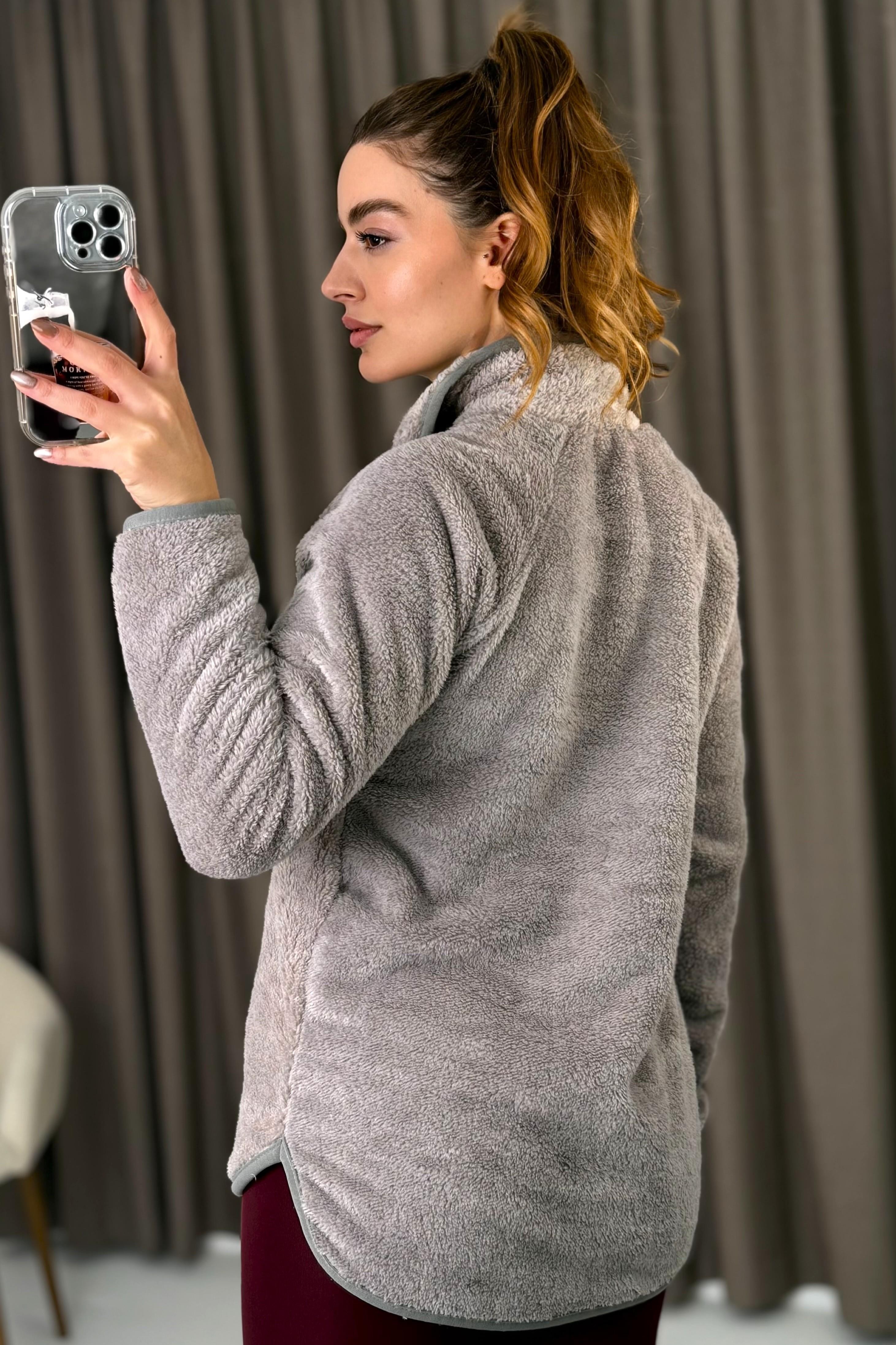 Kadın Yarım Fermuarlı  Welsoft Peluş Gri Sweatshirt