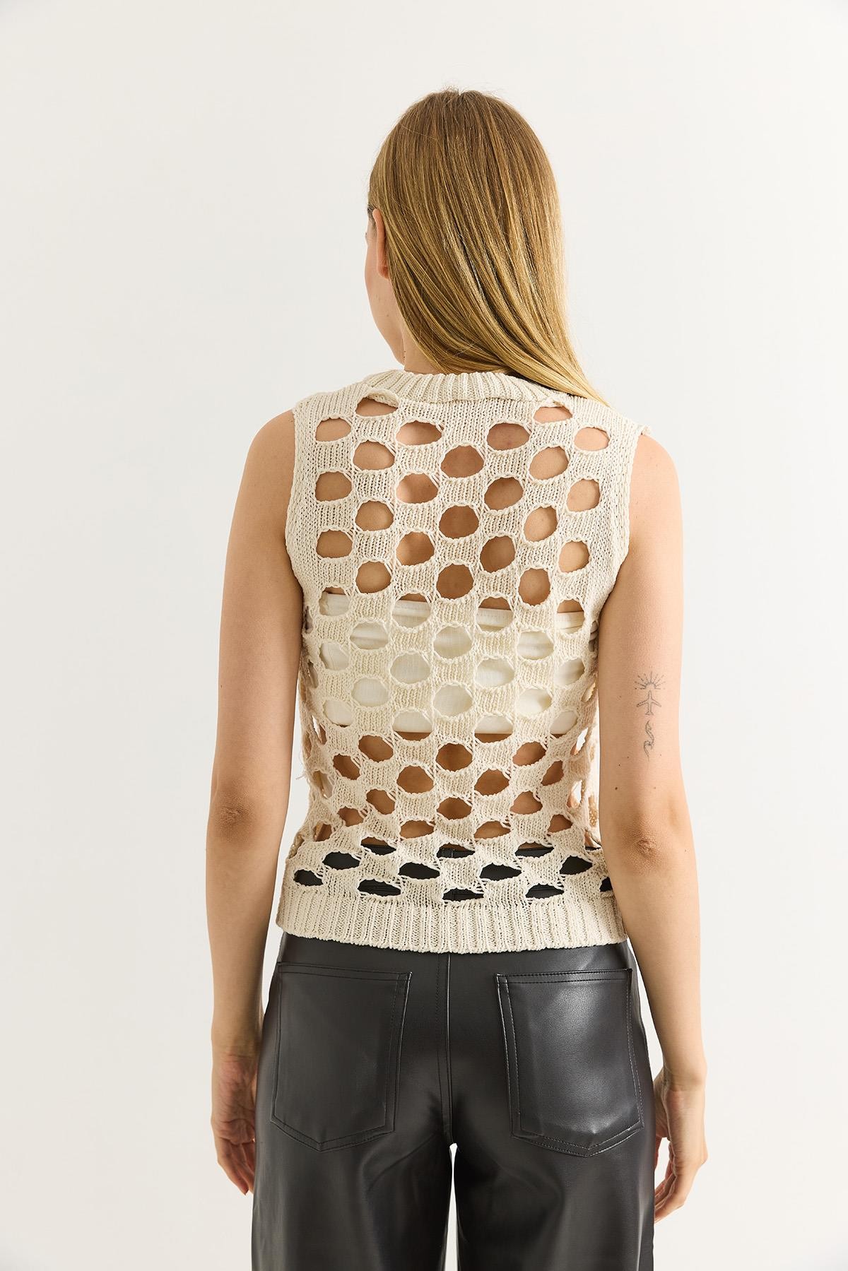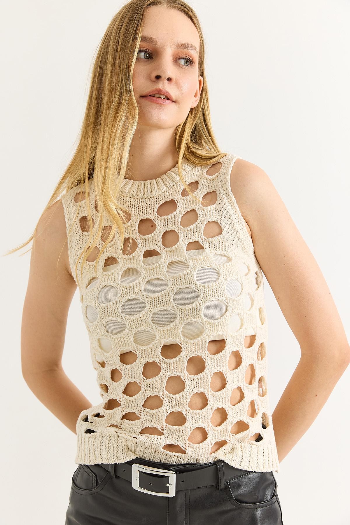 Kalın Askılı Fileli Bej Bluz (500285BLZXBEJ)