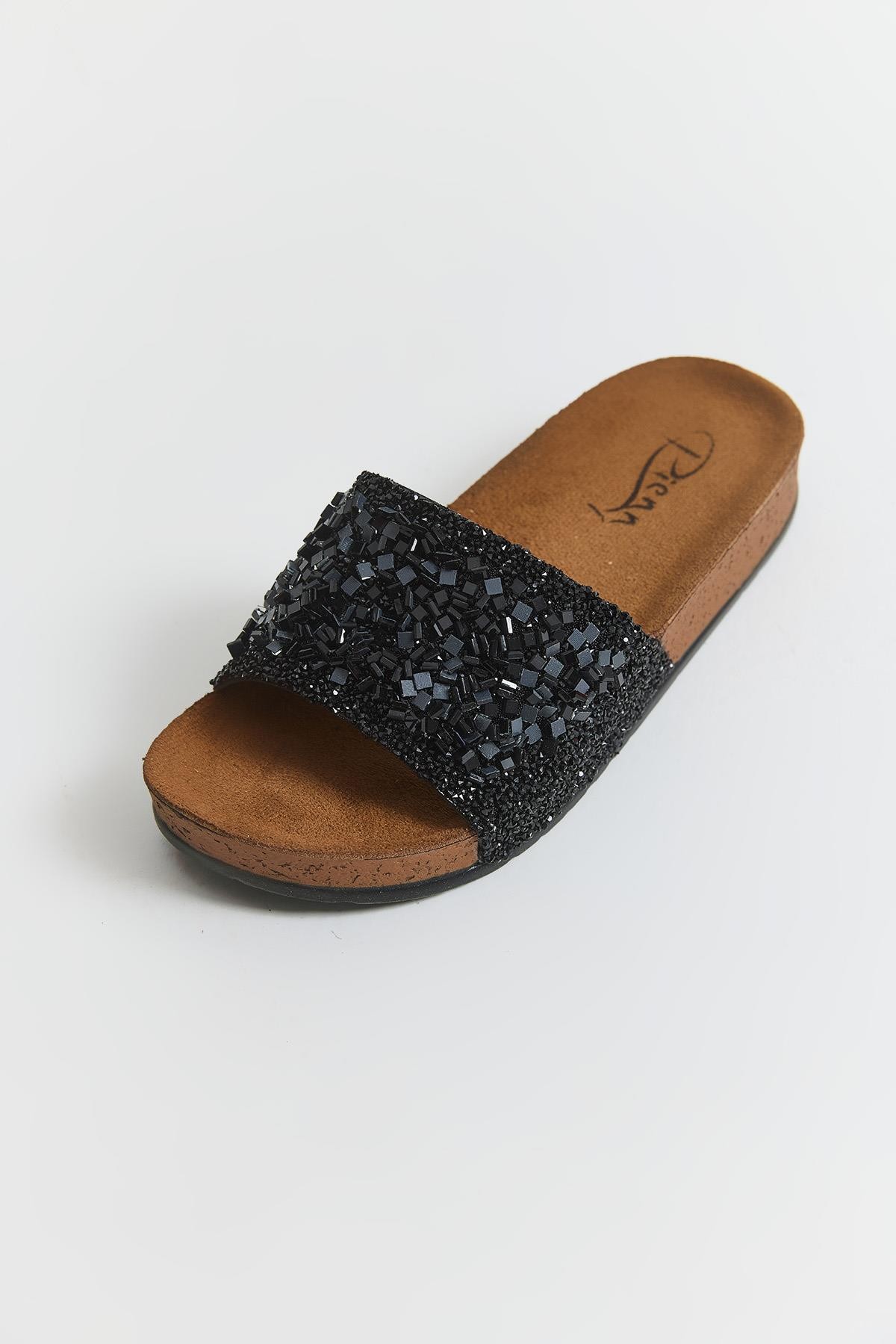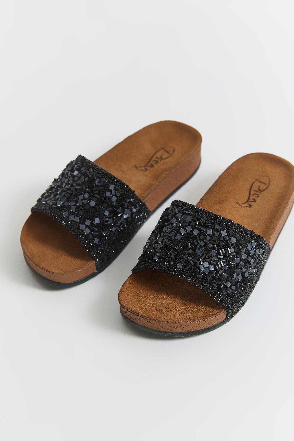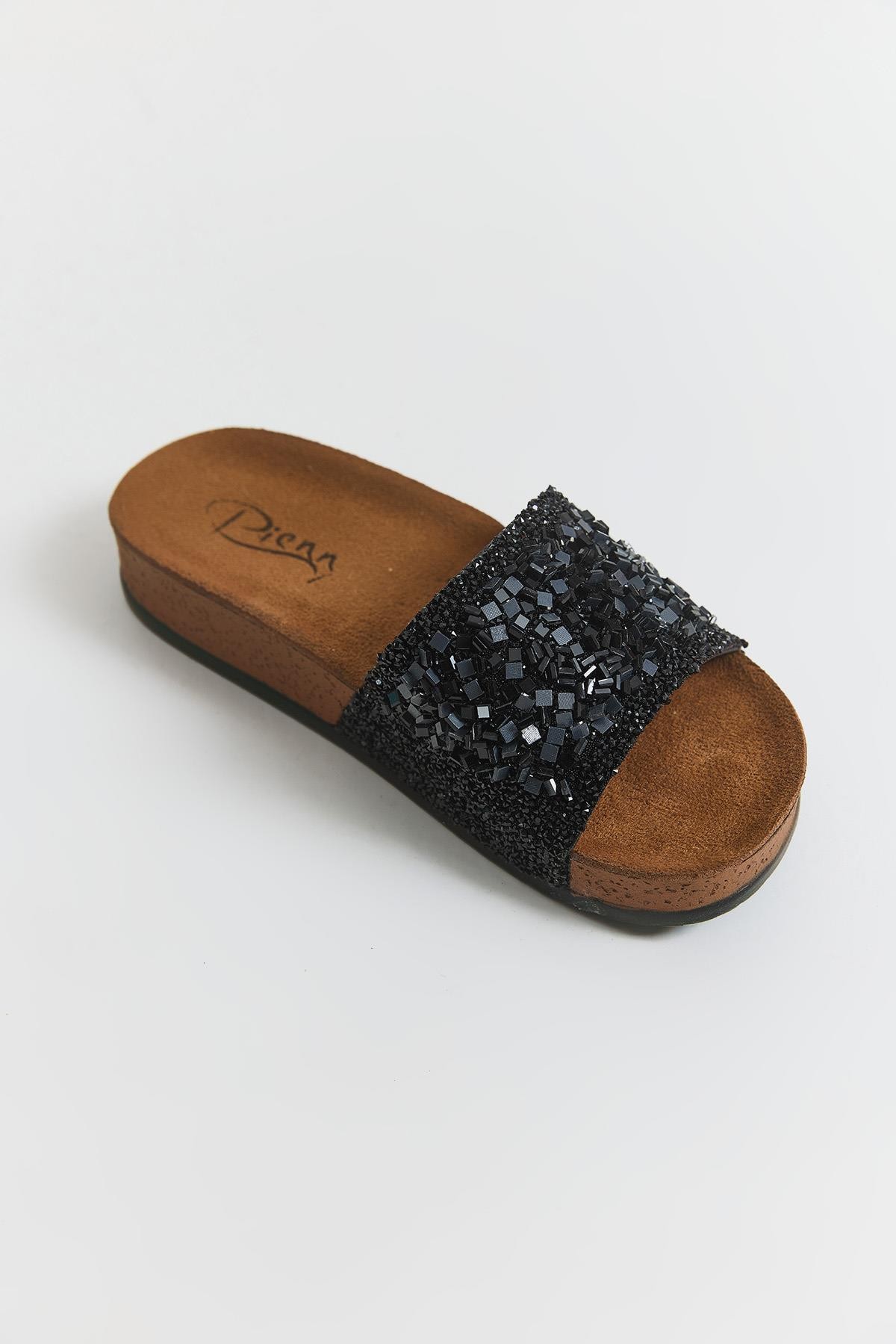 Kalın Bant Taş Detaylı Kadın Terlik Siyah