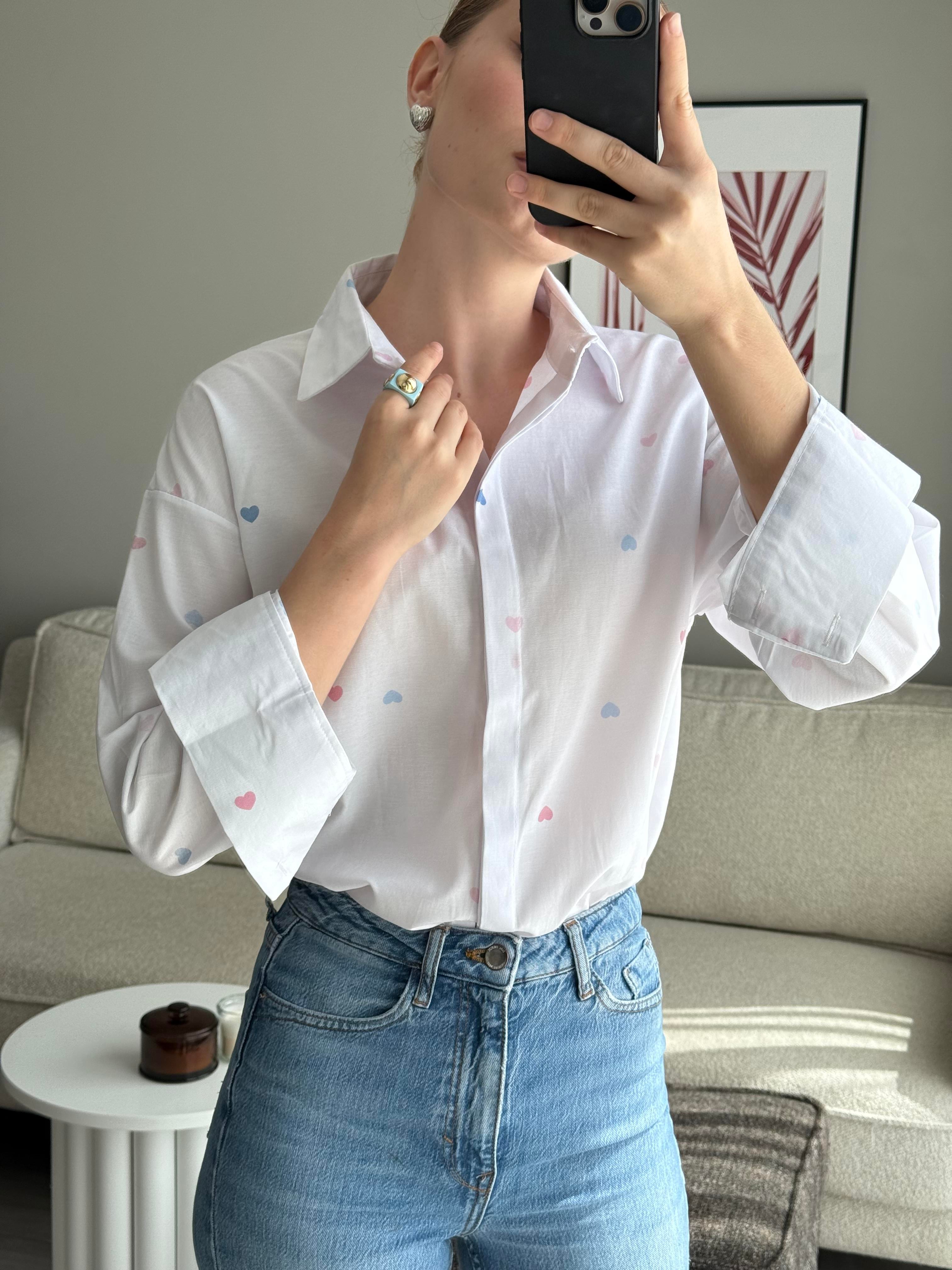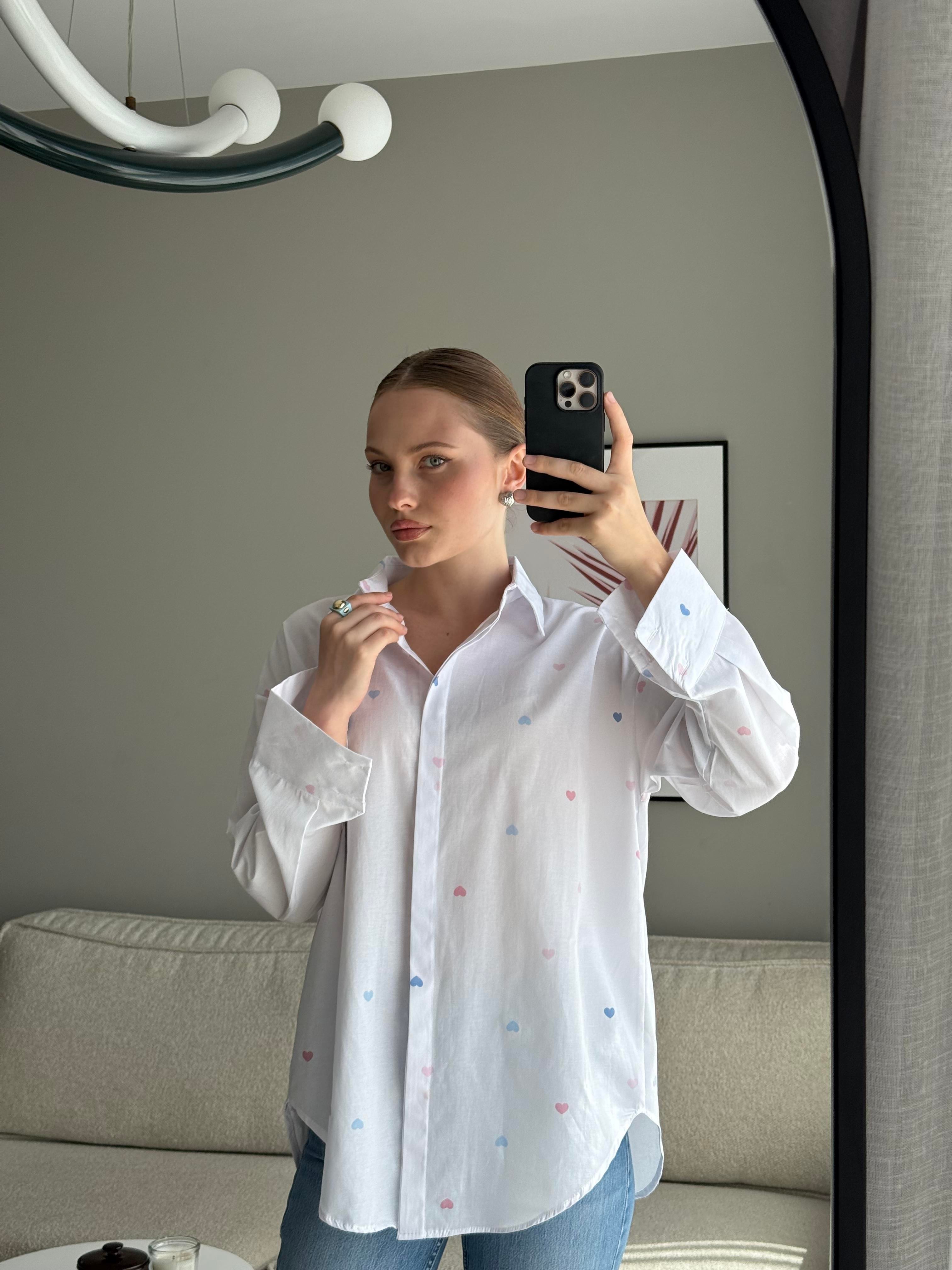 Kalp Baskılı Rahat Kalıp  Kadın Gömlek Beyaz