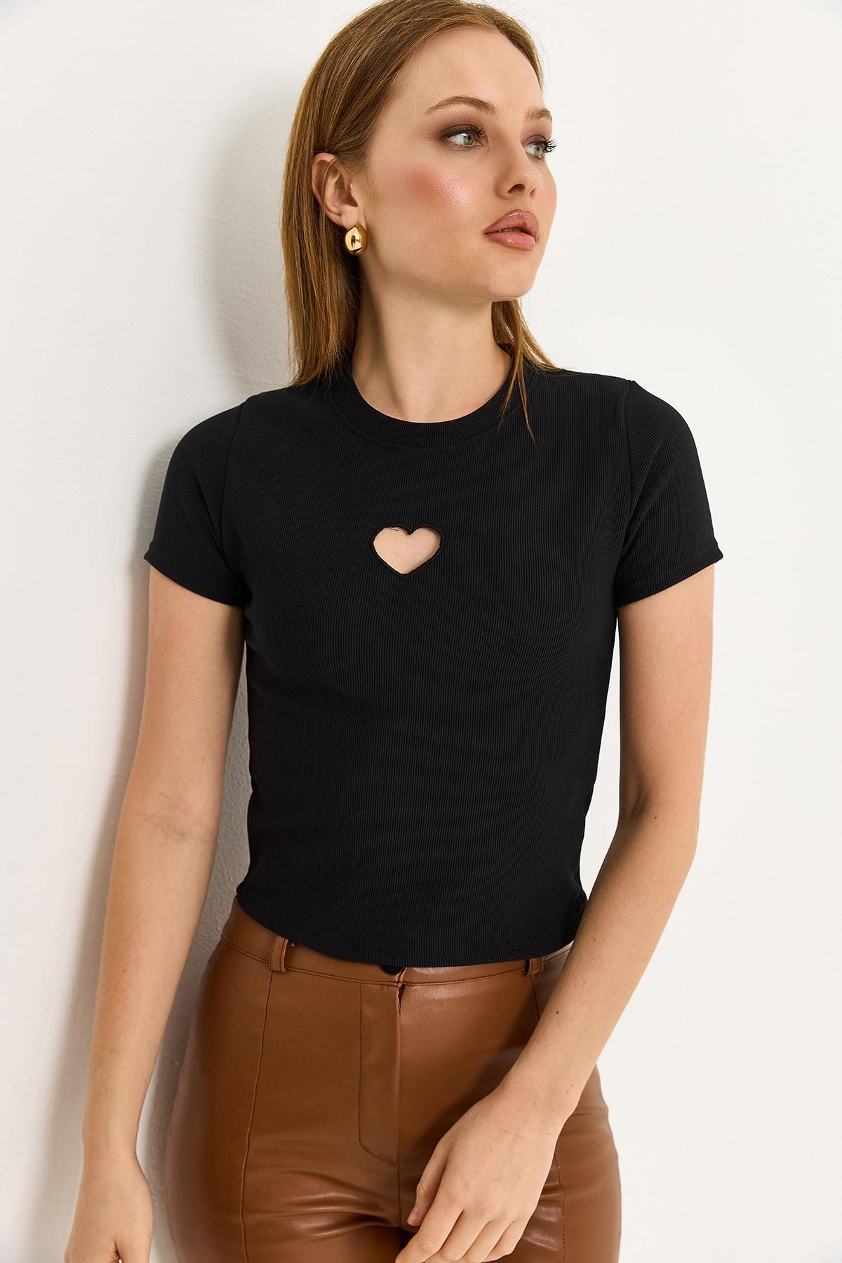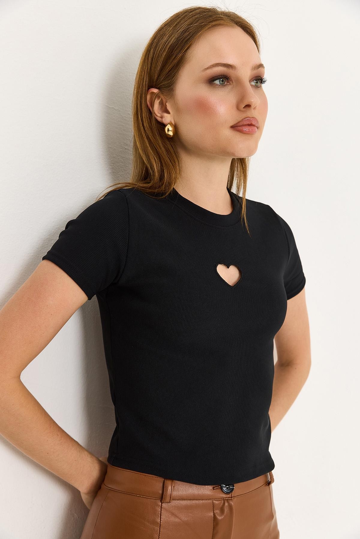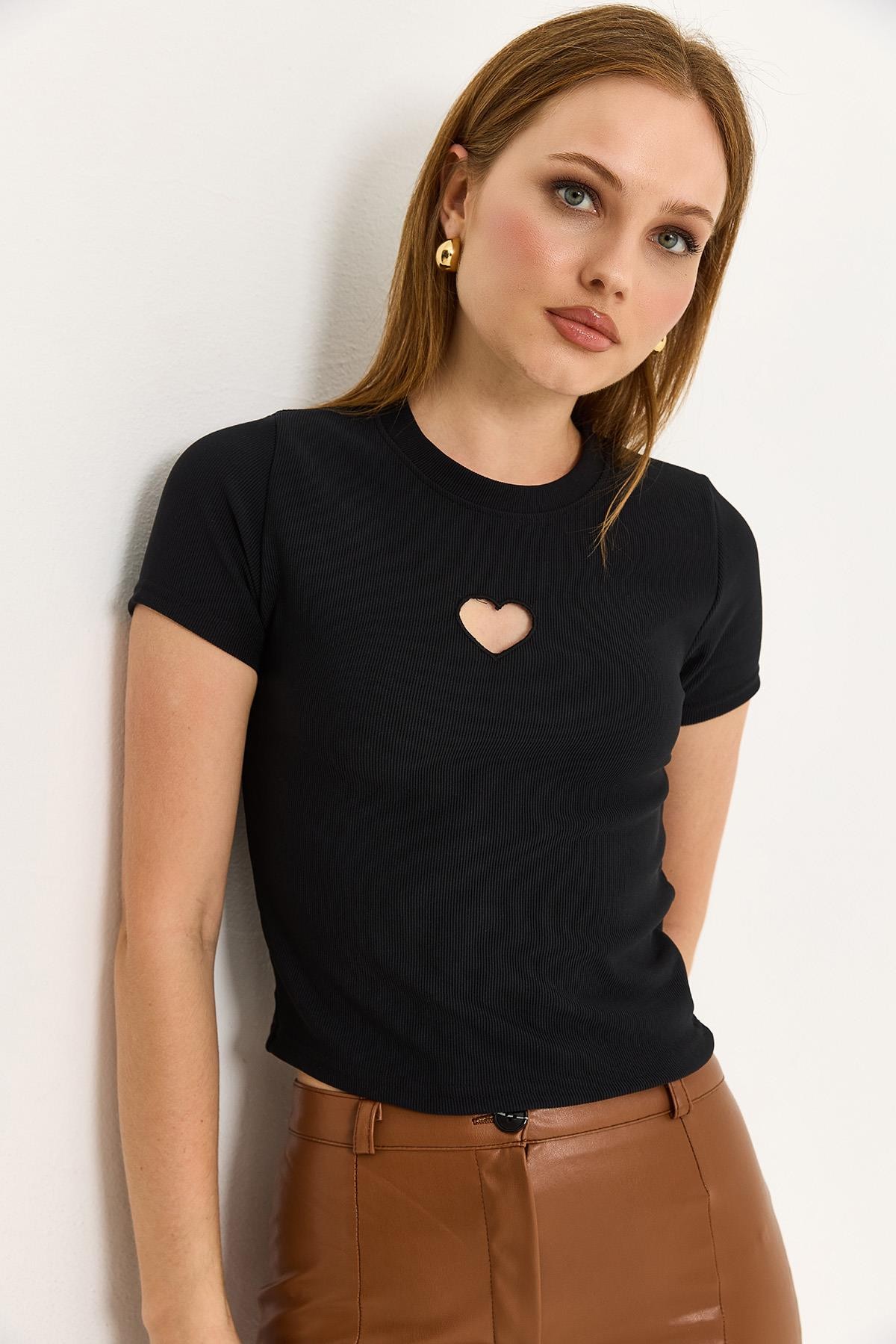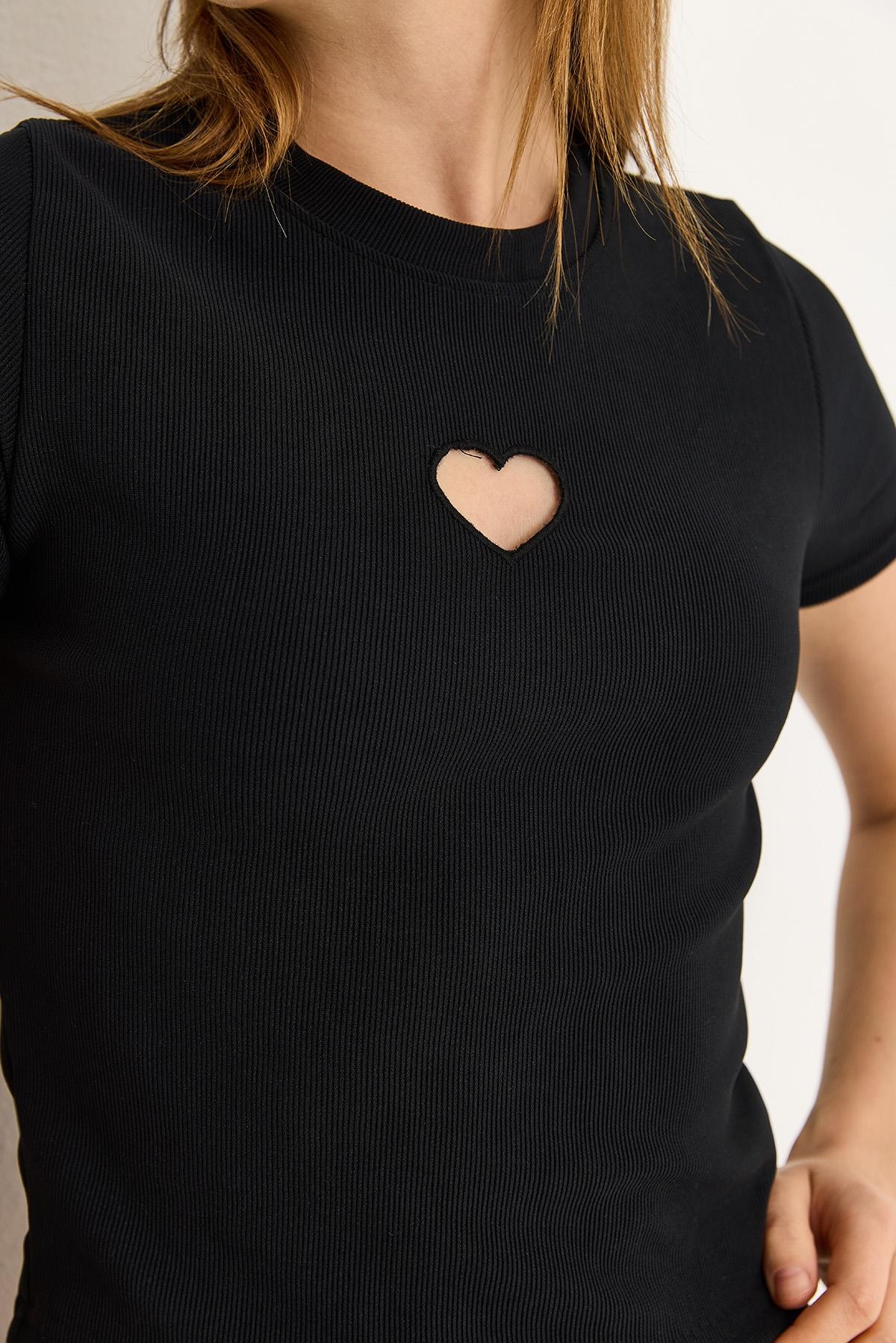 Kalp Detaylı Fitilli Örme Bluz Siyah (500187BLZXSYH)