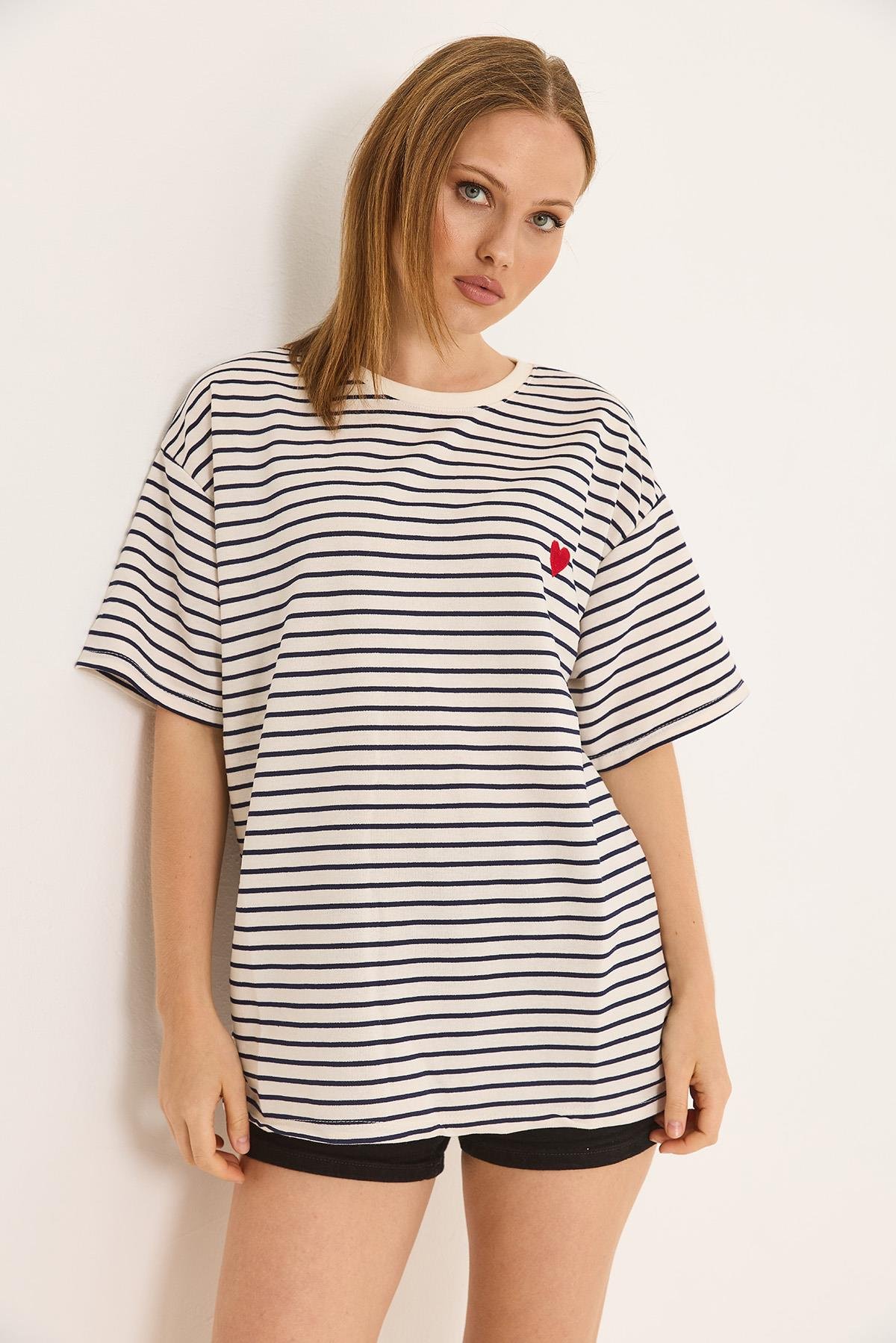 Kalp Nakışlı Çizgili Oversize Rahat Kalıp T-Shirt Lacivert