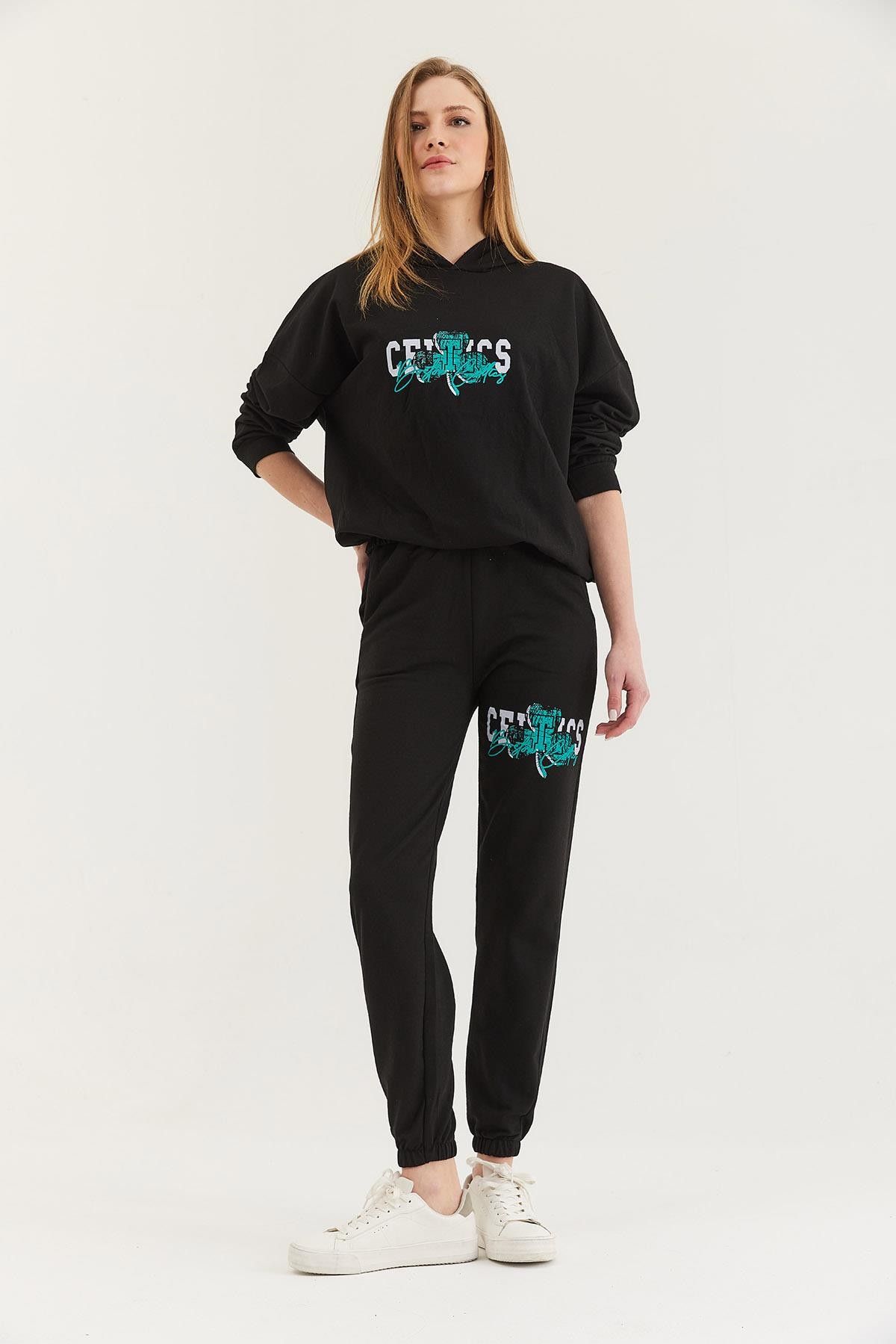 Kapüşonlu Baskılı Eşofman Takım Siyah