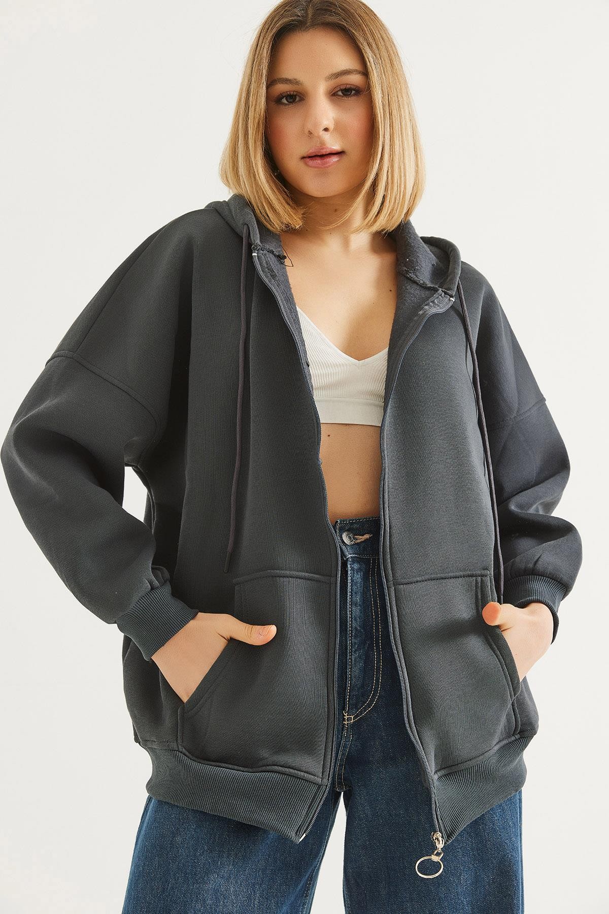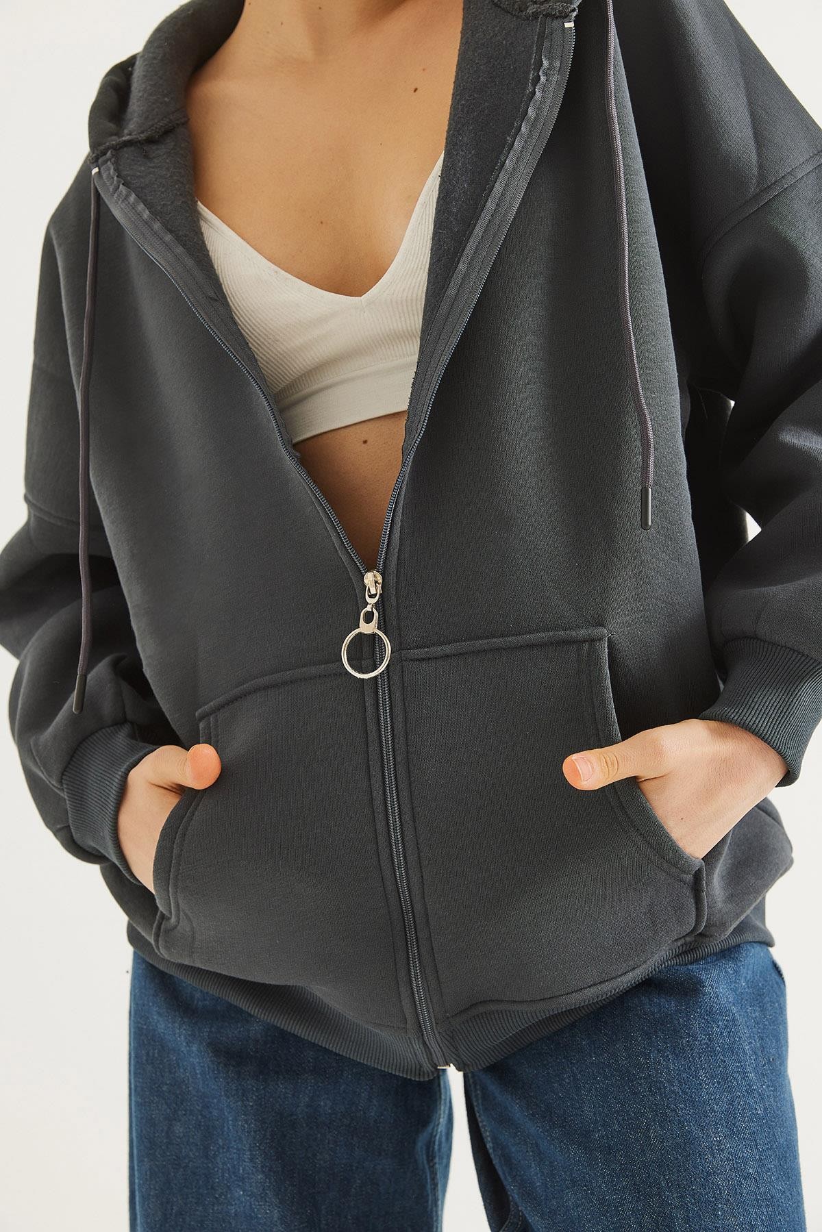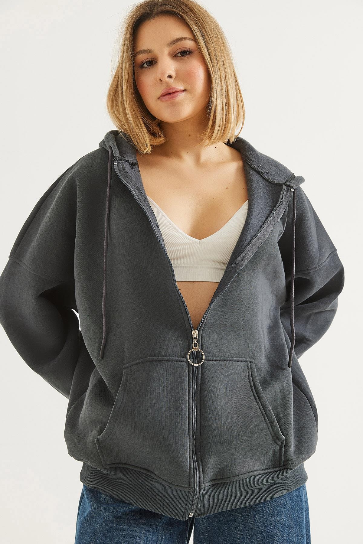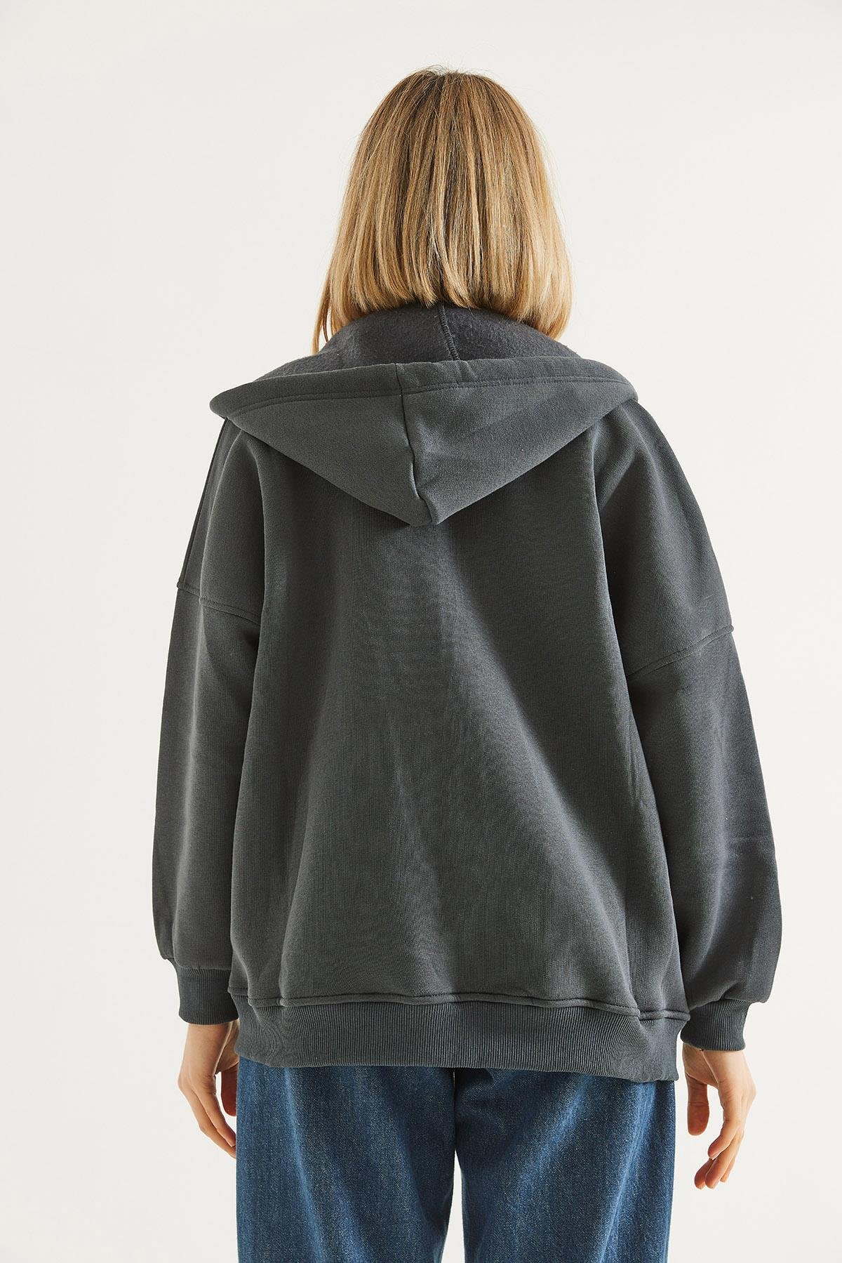 Kapüşonlu Fermuarlı Cepli Oversize Şardonlu Sweatshirt Antrasit (250026SWTXANT)