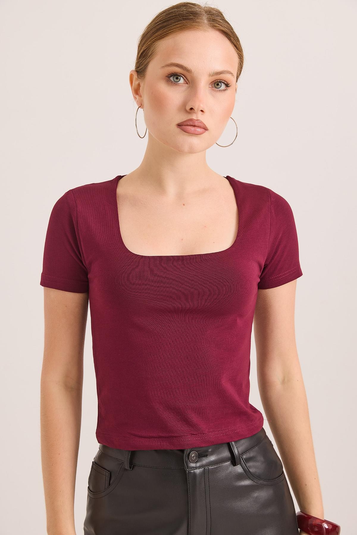 Kare Yaka Esnek Pamuk Örme Bluz Bordo (250739BLZXBRD)