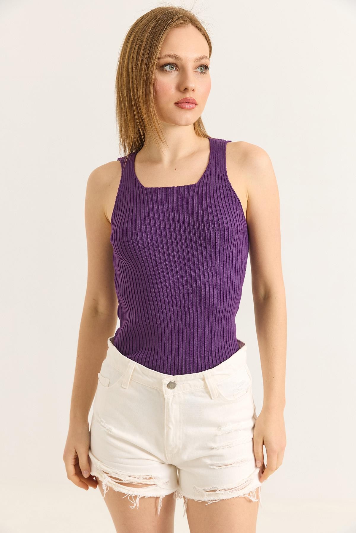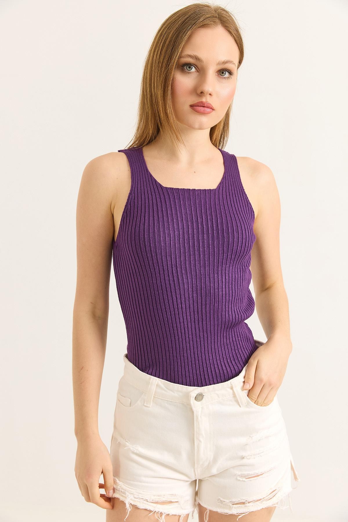 Kare Yaka Kalın Askılı Triko Atlet Bluz Mor (500157BLZXMOR)