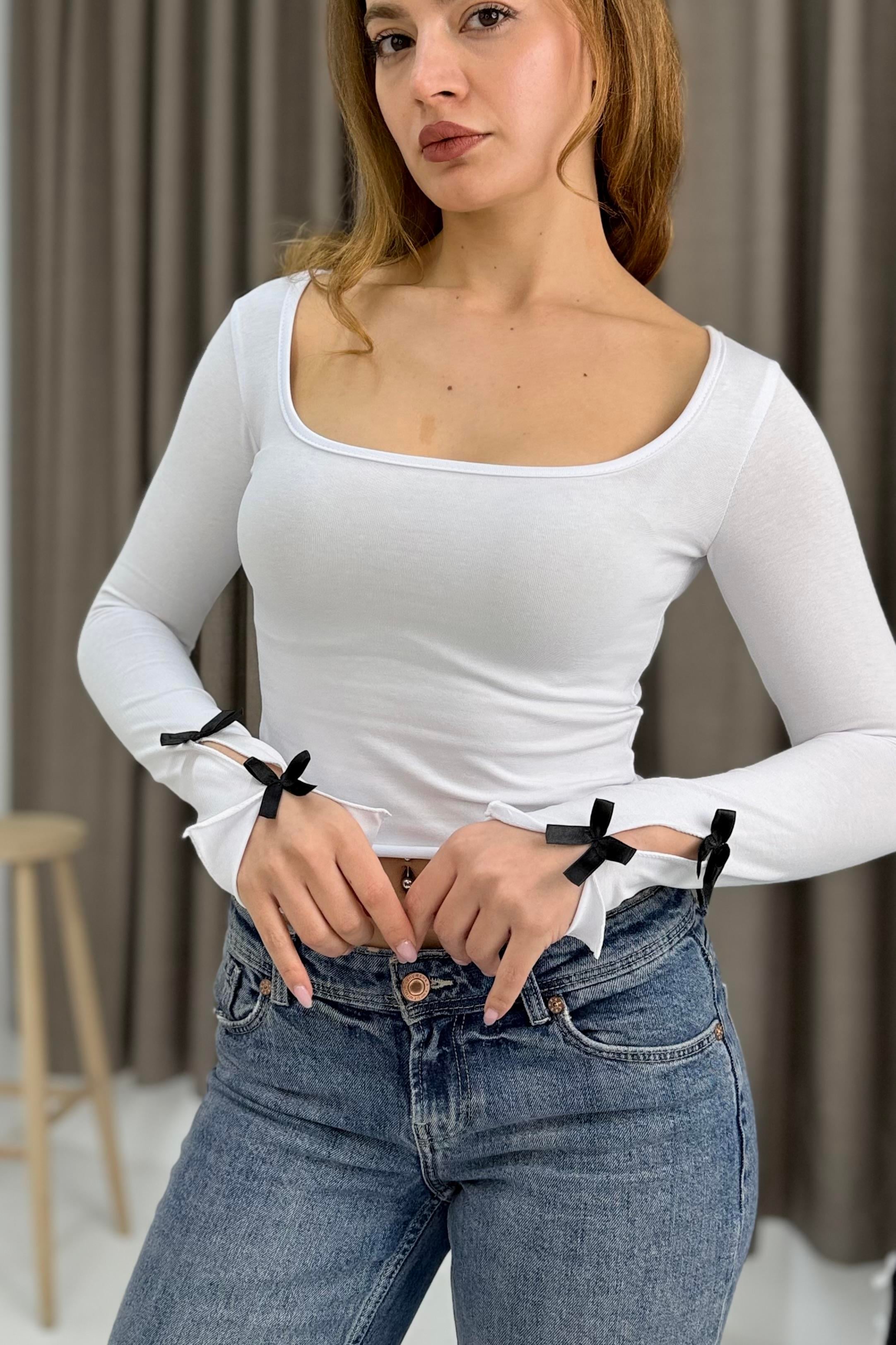 Kare Yaka Kolları Fiyonk Detaylı Bluz Beyaz (250575BLZXBYZ)