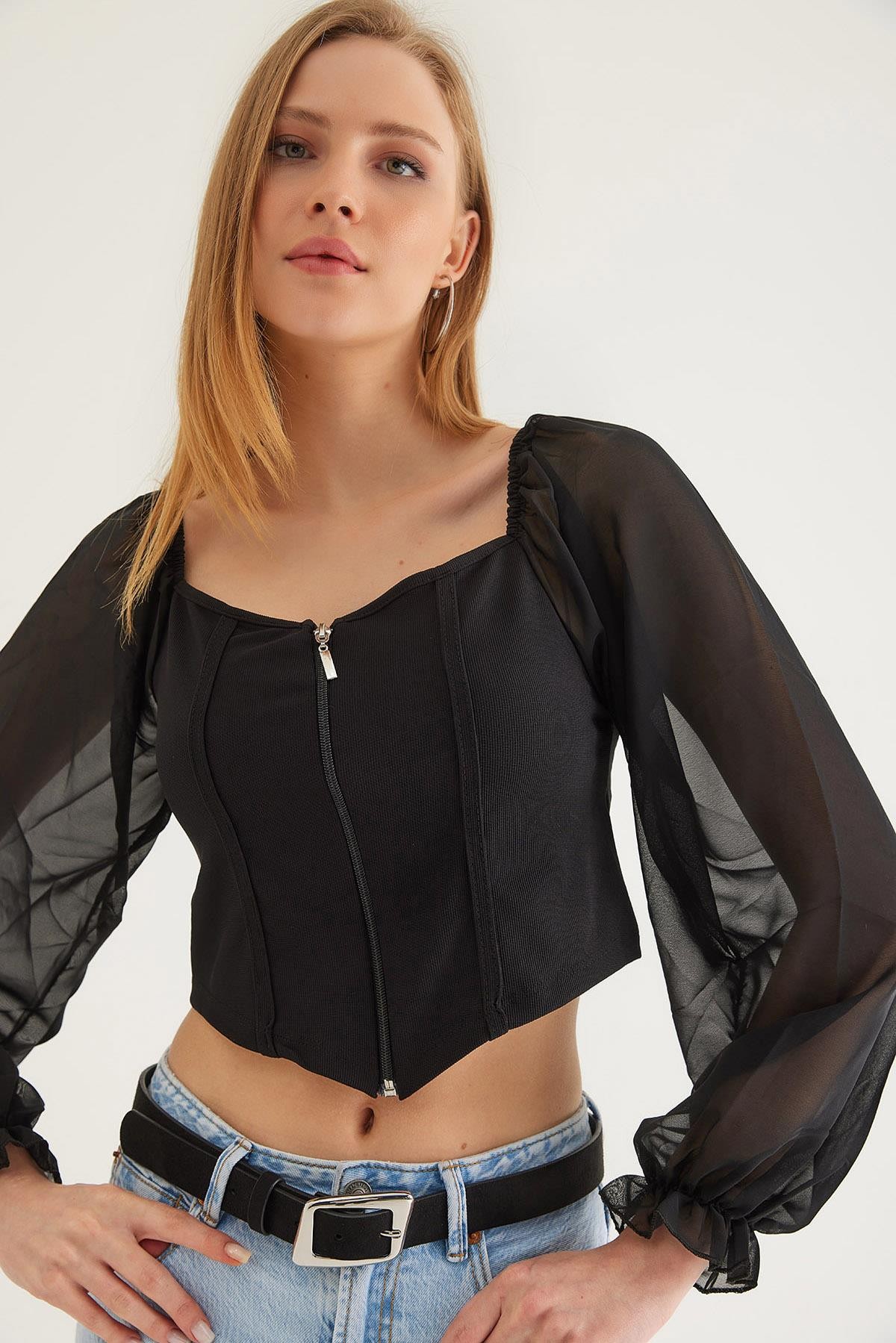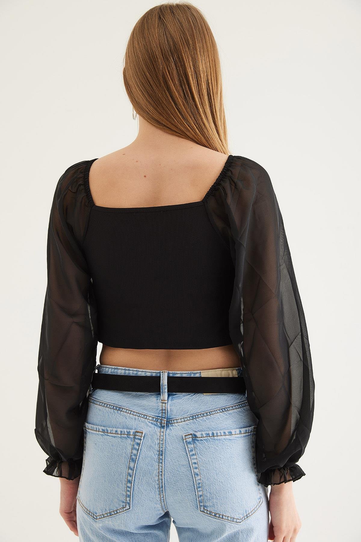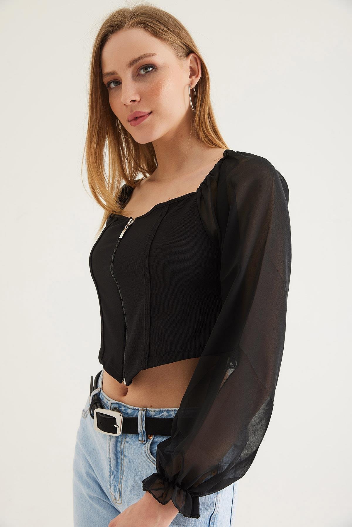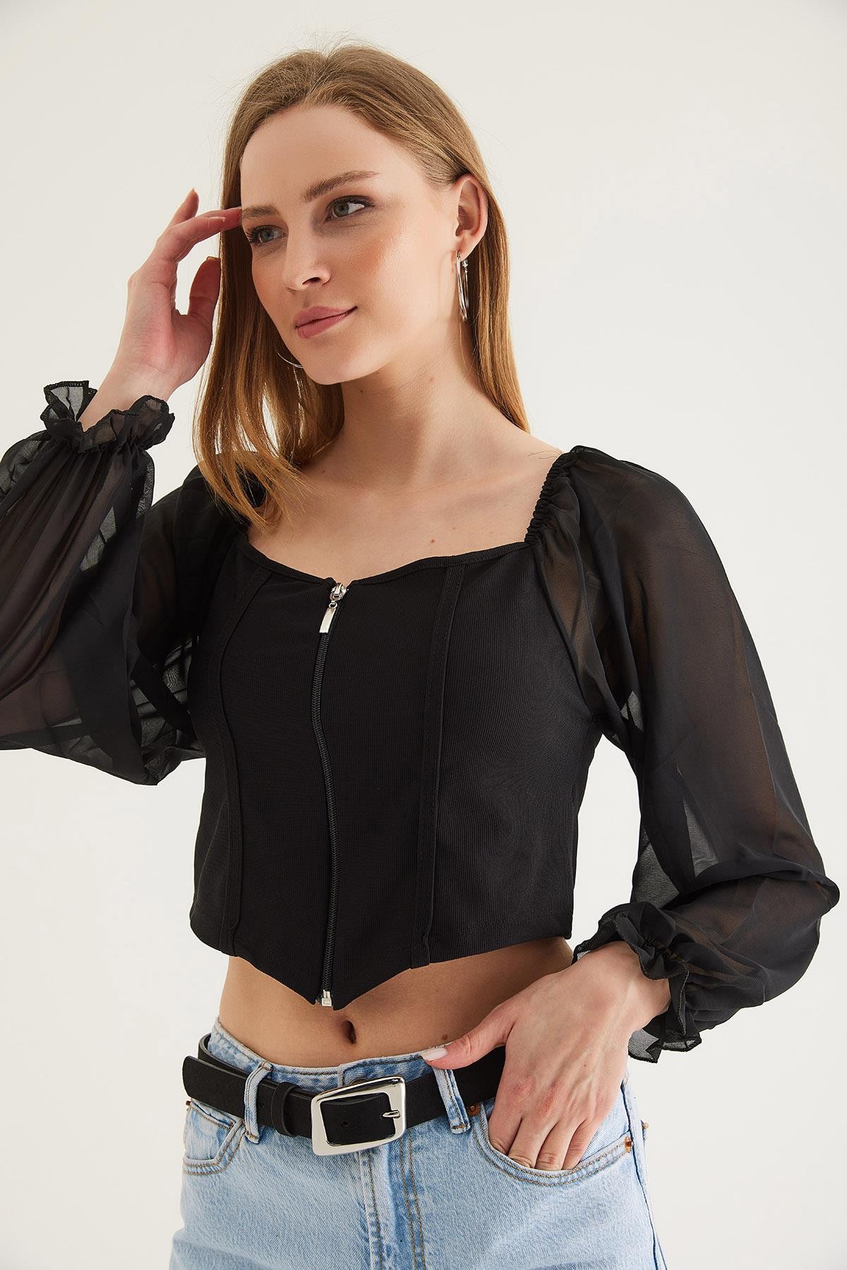 Kare Yaka Kolları Tül Detaylı Fermuarlı Bluz Siyah (250070BLZXSYH)