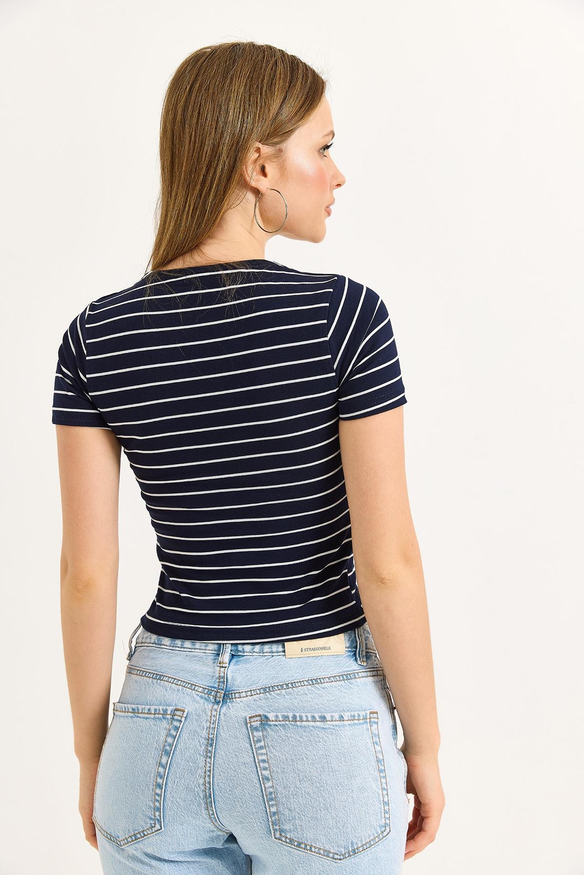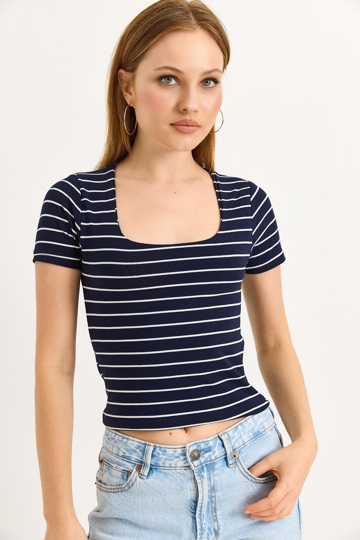 Kare Yaka Likralı Pamuk Bluz Lacivert (500185BLZXLCV)