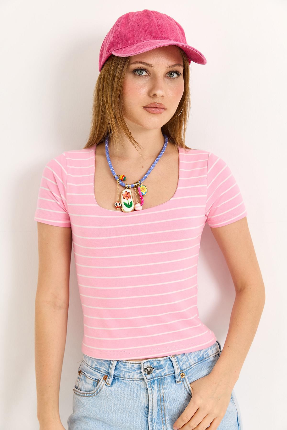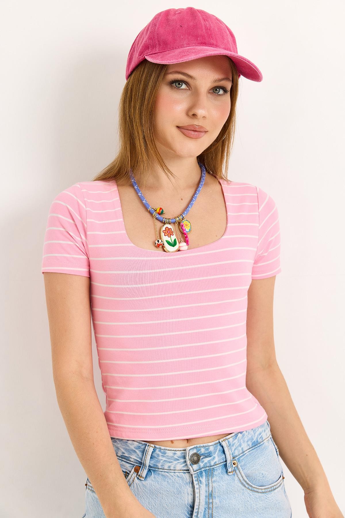 Kare Yaka Likralı Pamuk Bluz Pembe (500185BLZXPMB)