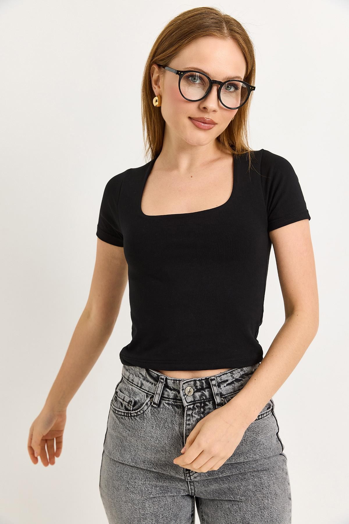 Kare Yaka Likralı Pamuk Düz Siyah Bluz (500185BLZXDSYH)