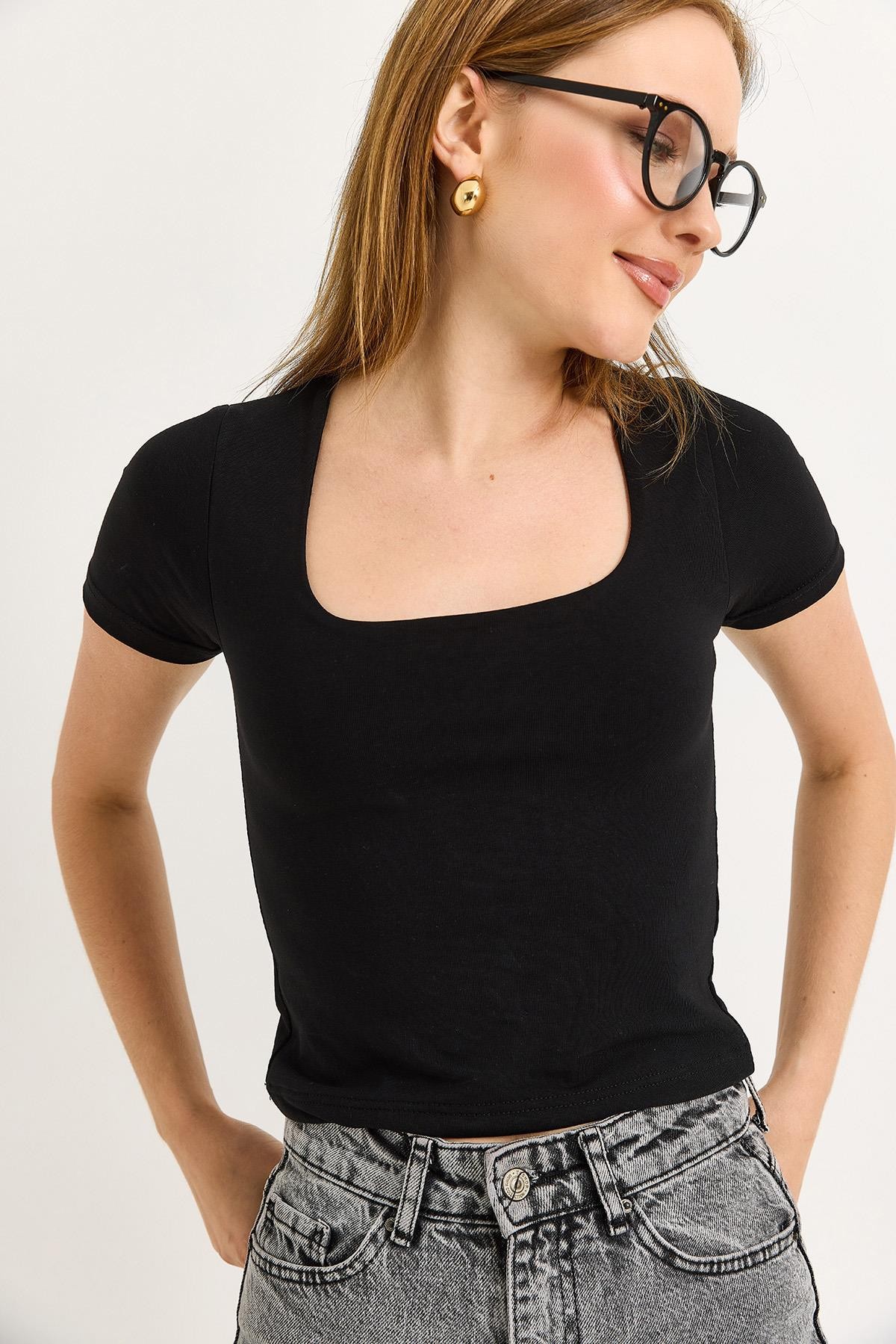 Kare Yaka Likralı Pamuk Düz Siyah Bluz