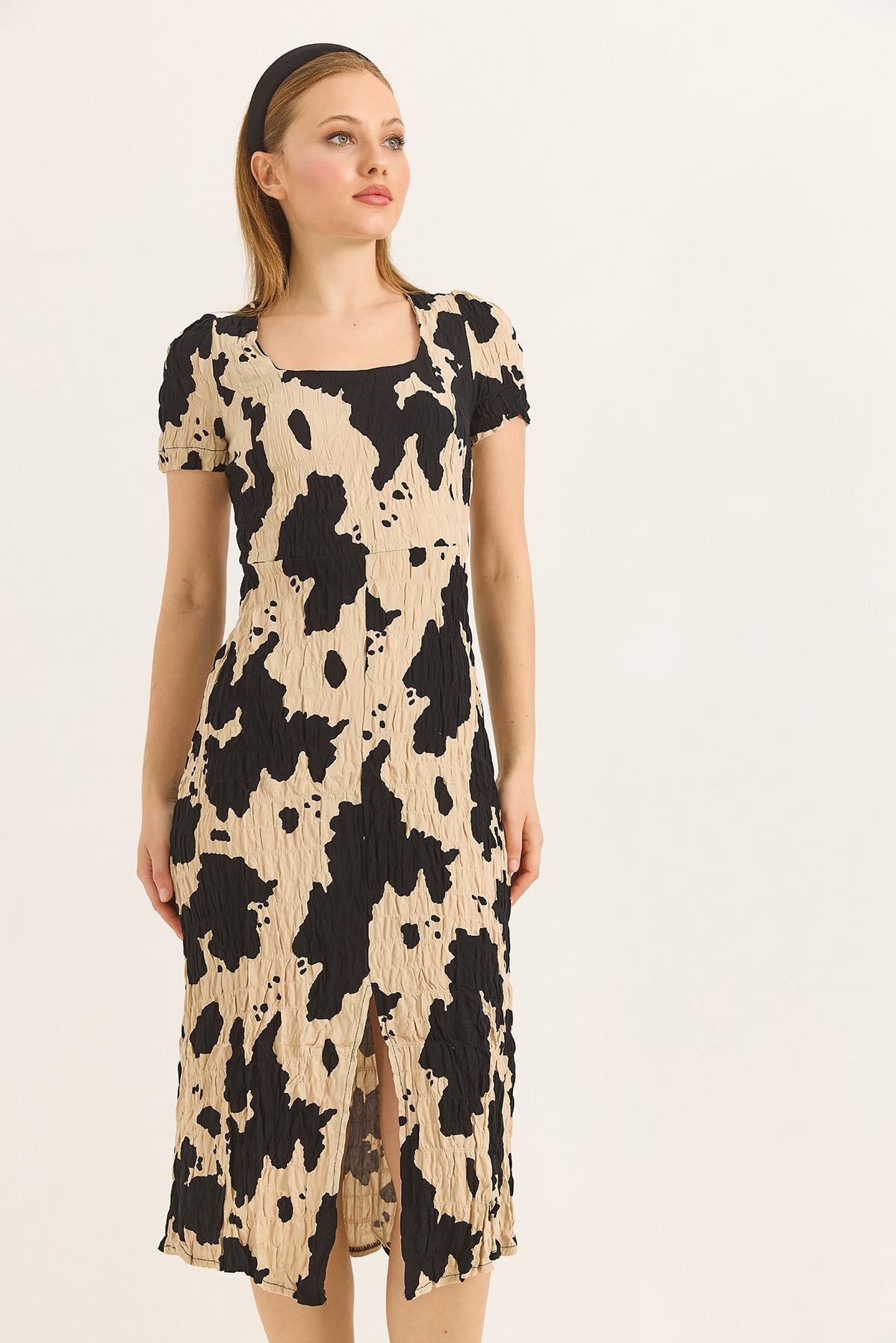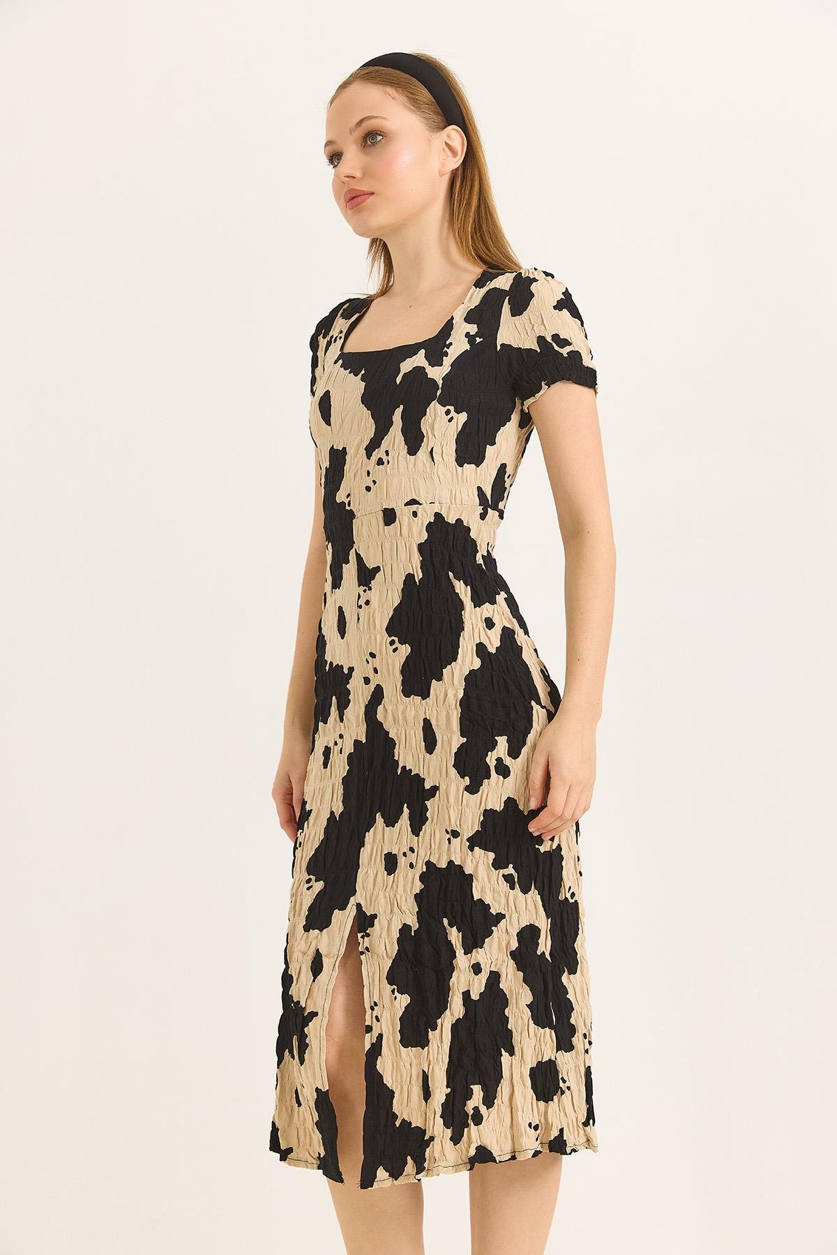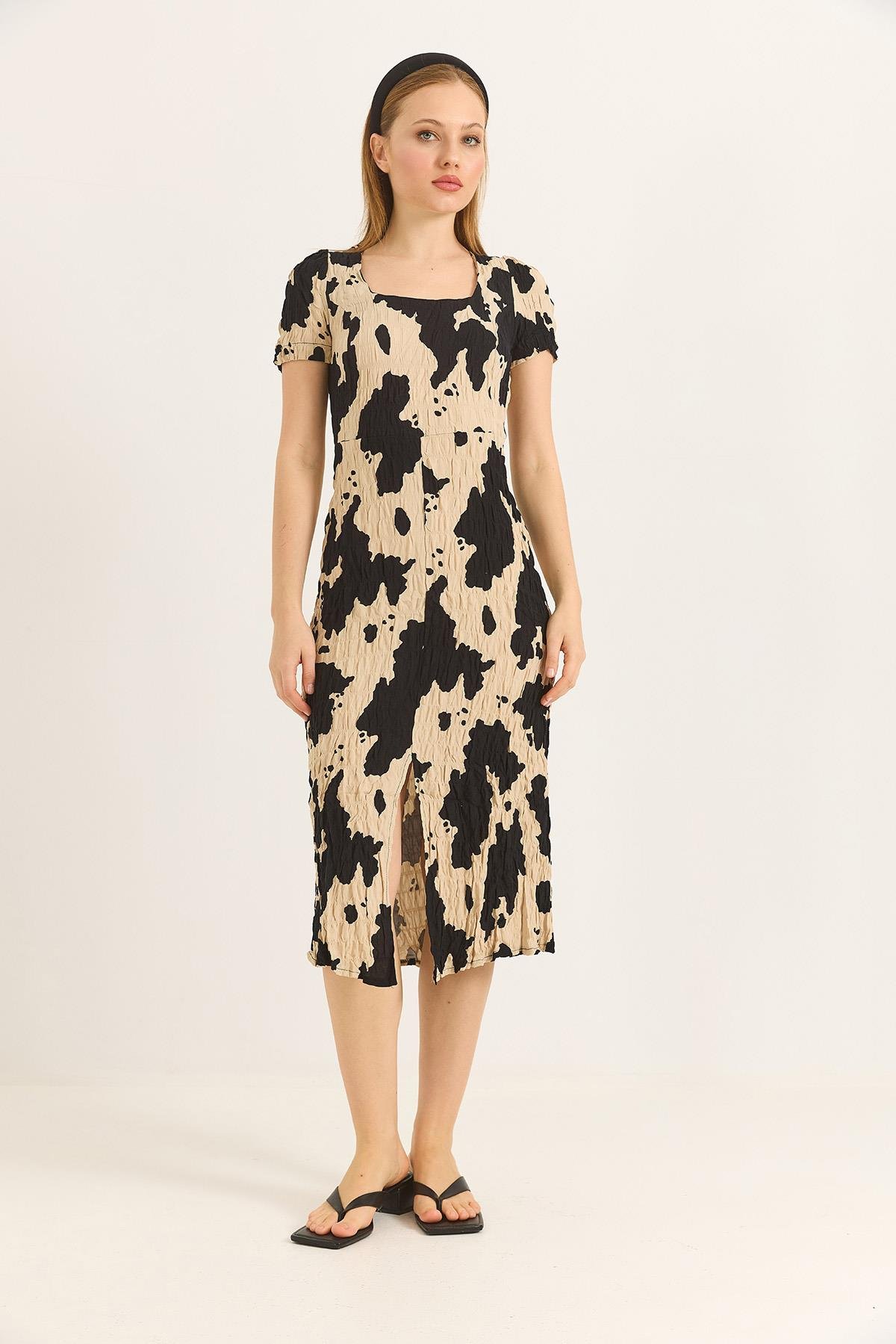 Kare Yaka Yırtmaçlı Kısa Kol Siyah Elbise (500156ELBXSYH)
