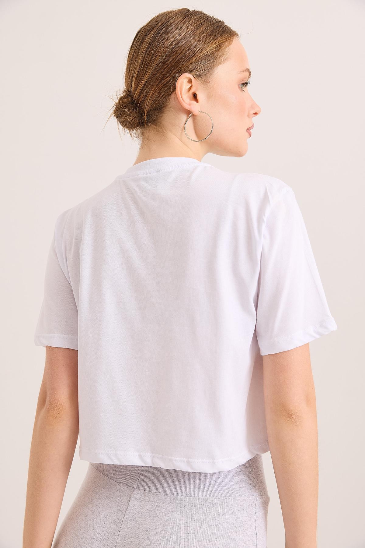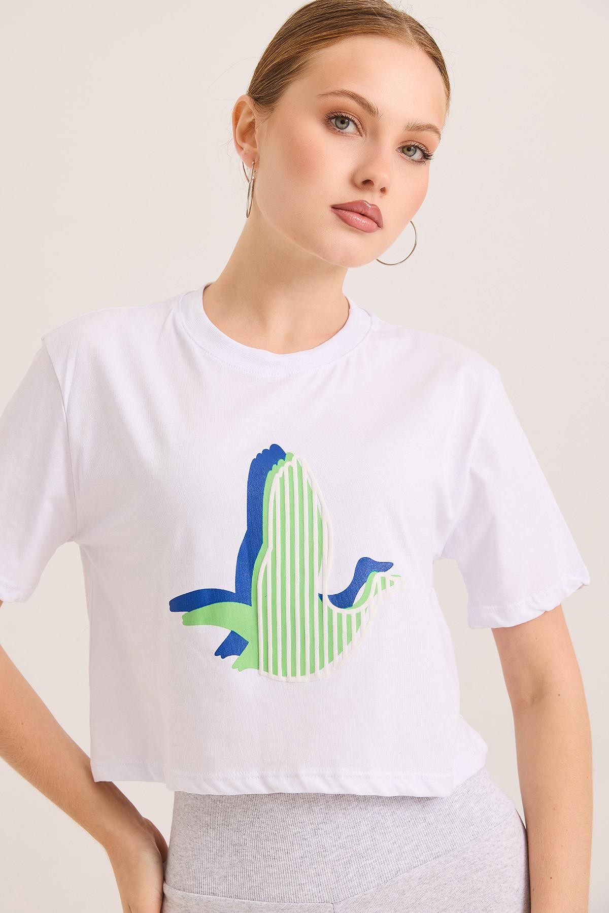 Karikatür Kuş Baskılı Pamuk Örme Crop Tshirt Beyaz (250730TSHXBYZ)