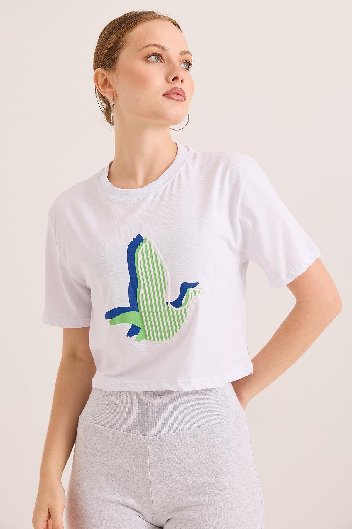 Karikatür Kuş Baskılı Pamuk Örme Crop Tshirt Beyaz
