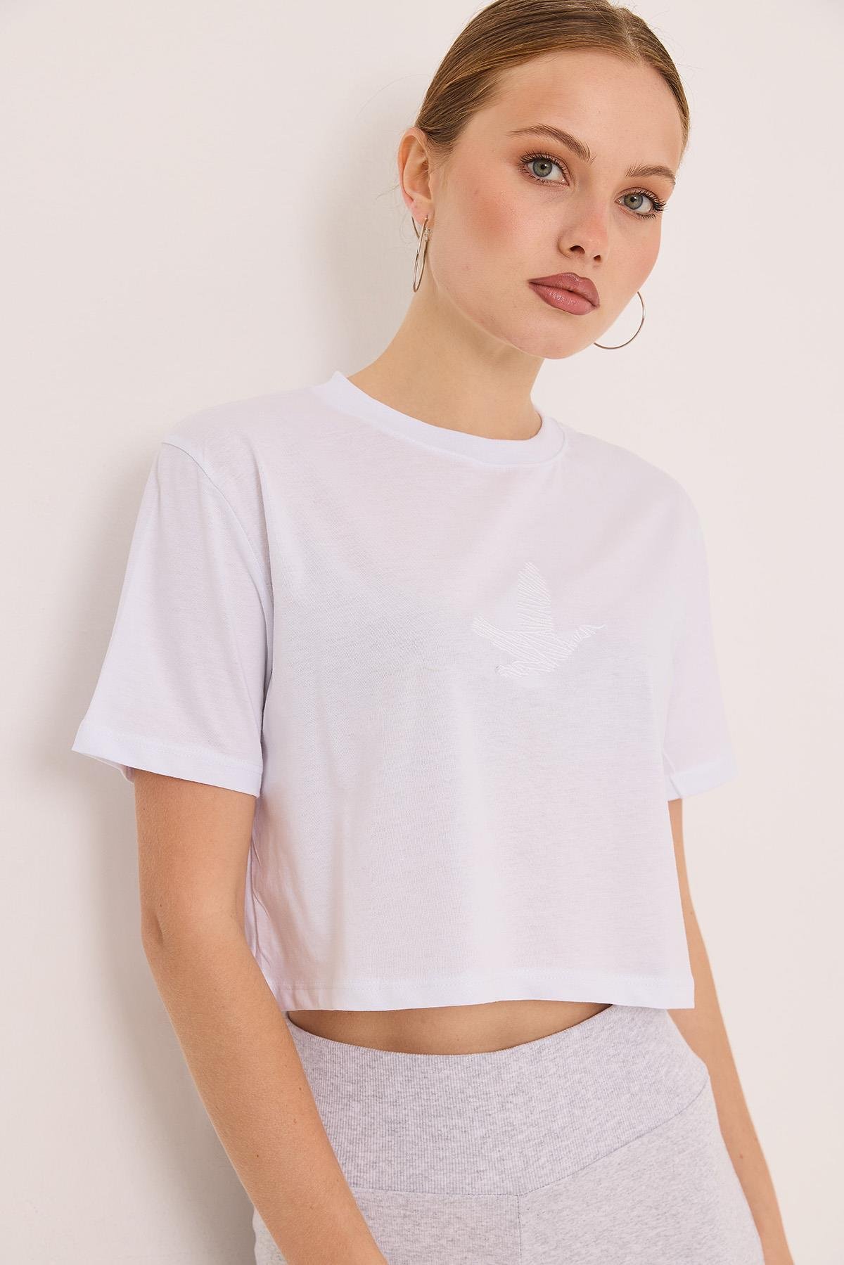 Karikatür Kuş Kabartma Baskılı Örme Crop Tshirt Beyaz