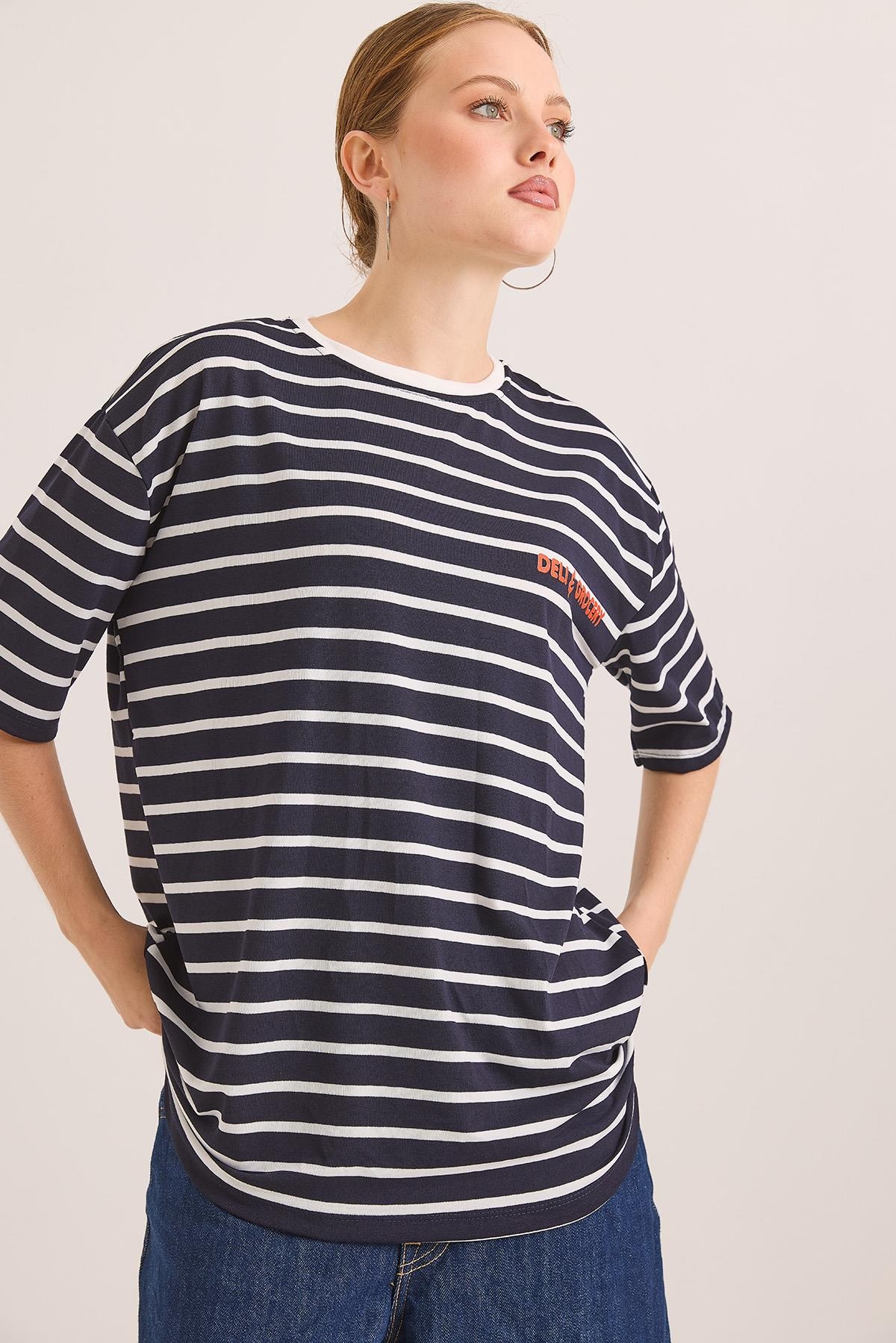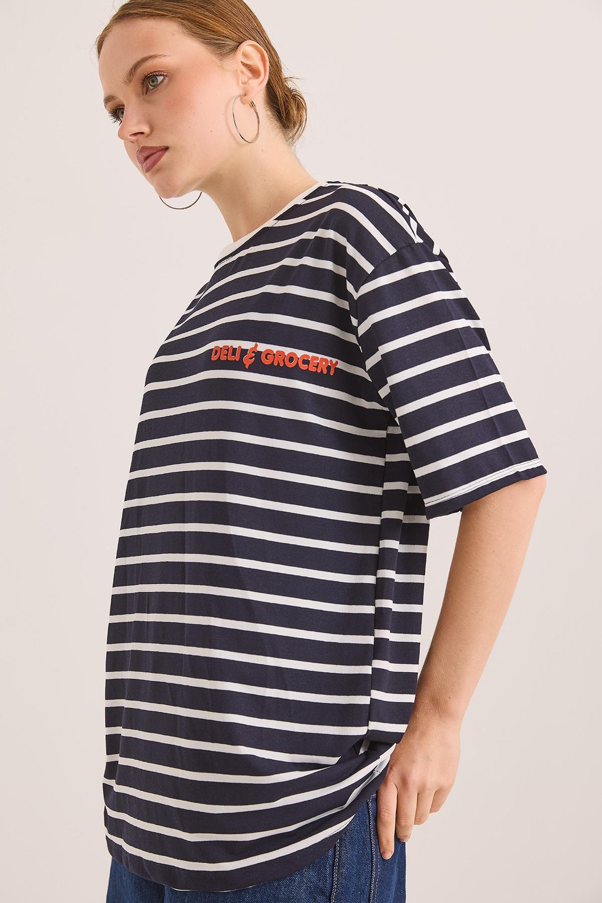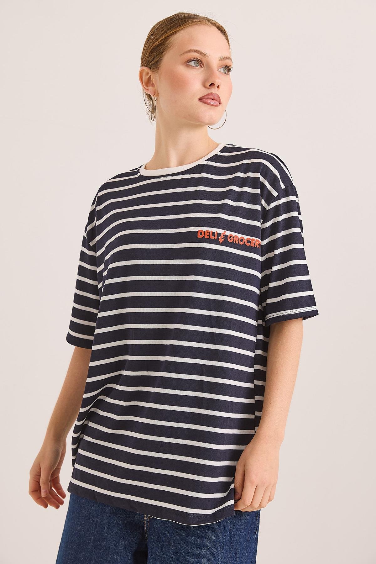 Karikatür Up Baskılı Çizgili Salaş Tshirt Lacivert (250746TSHXLACİ)