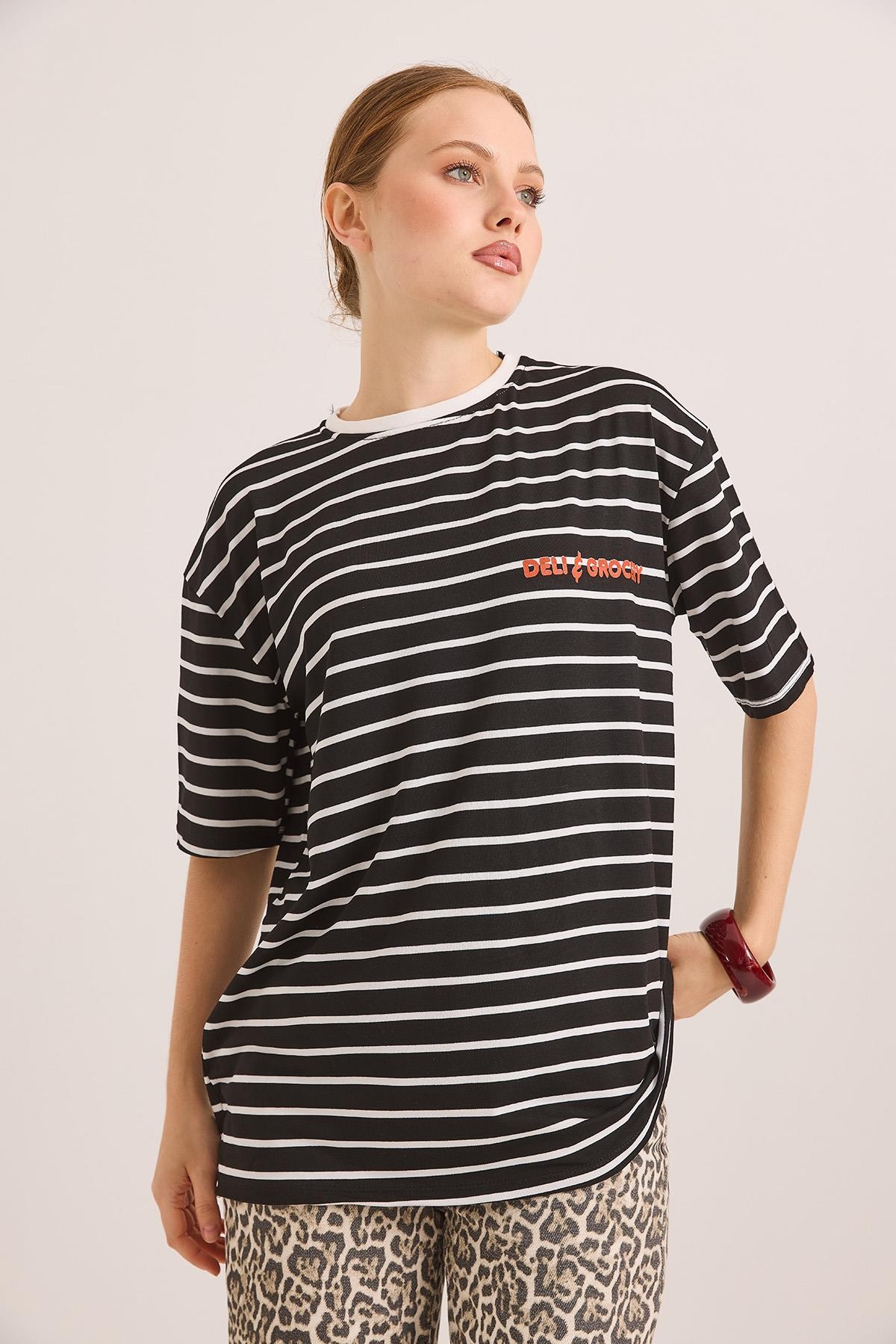 Karikatür Up Baskılı Çizgili Salaş Tshirt Kırmızı Karikatür Up Baskılı Çizgili Salaş Tshirt Siyah