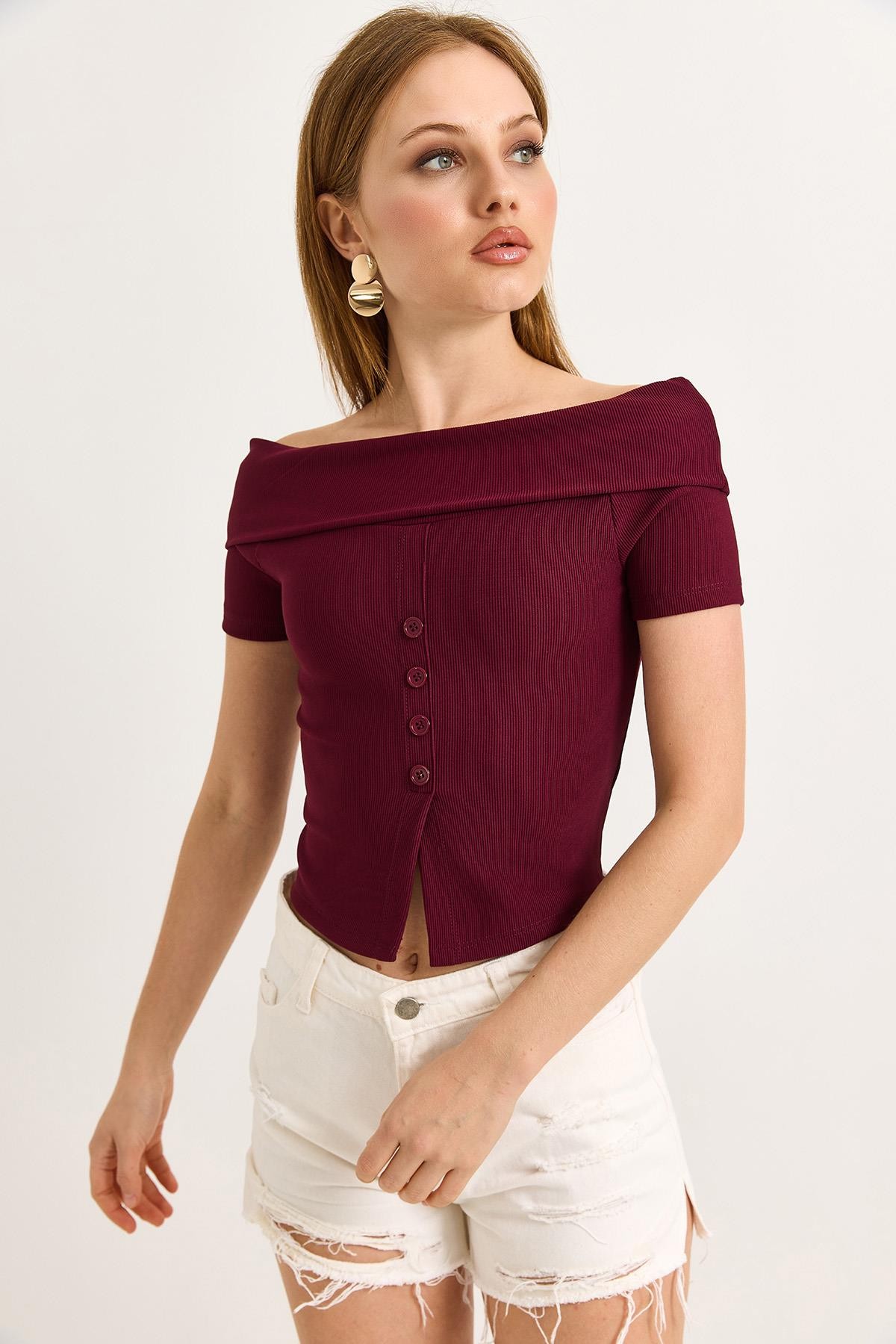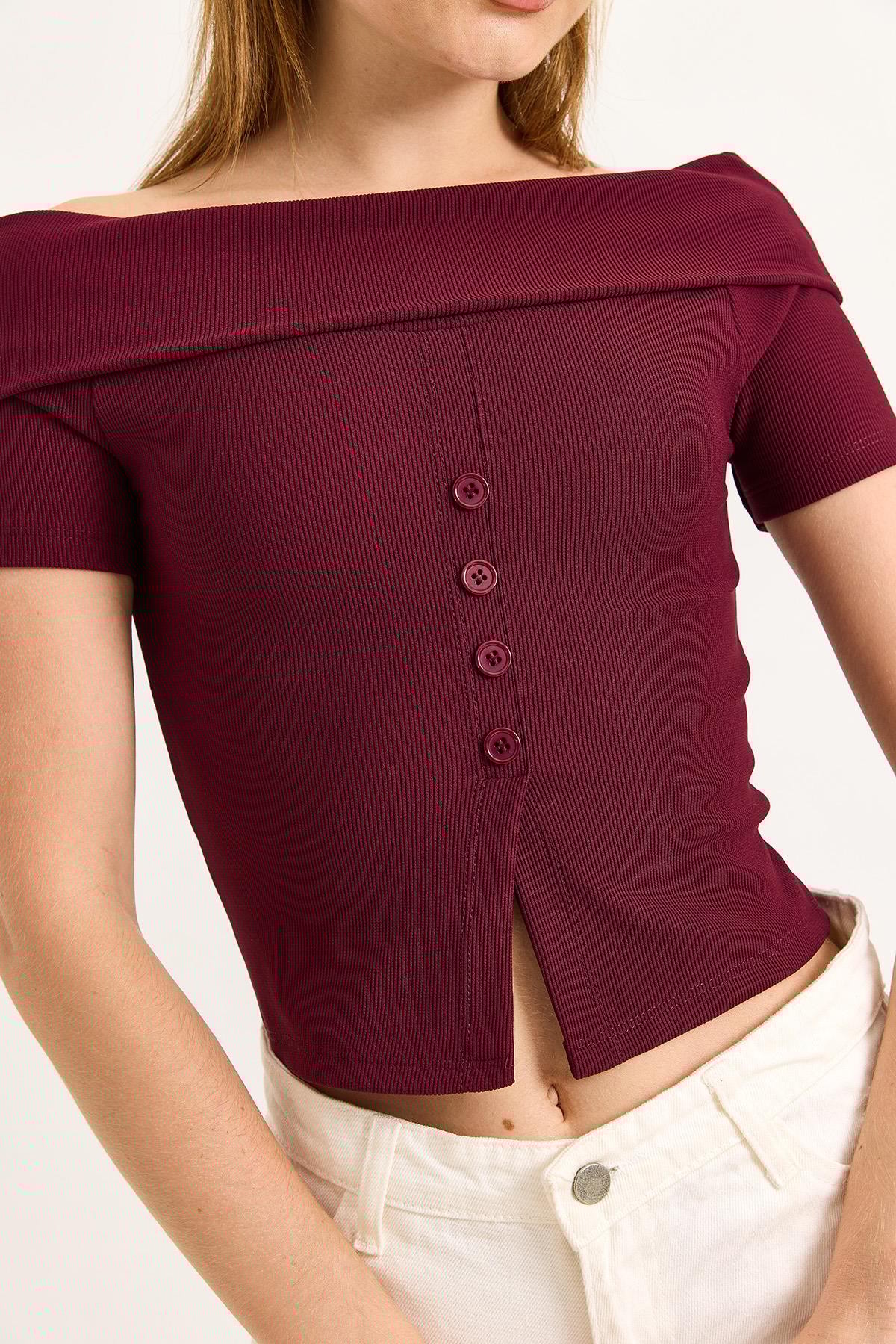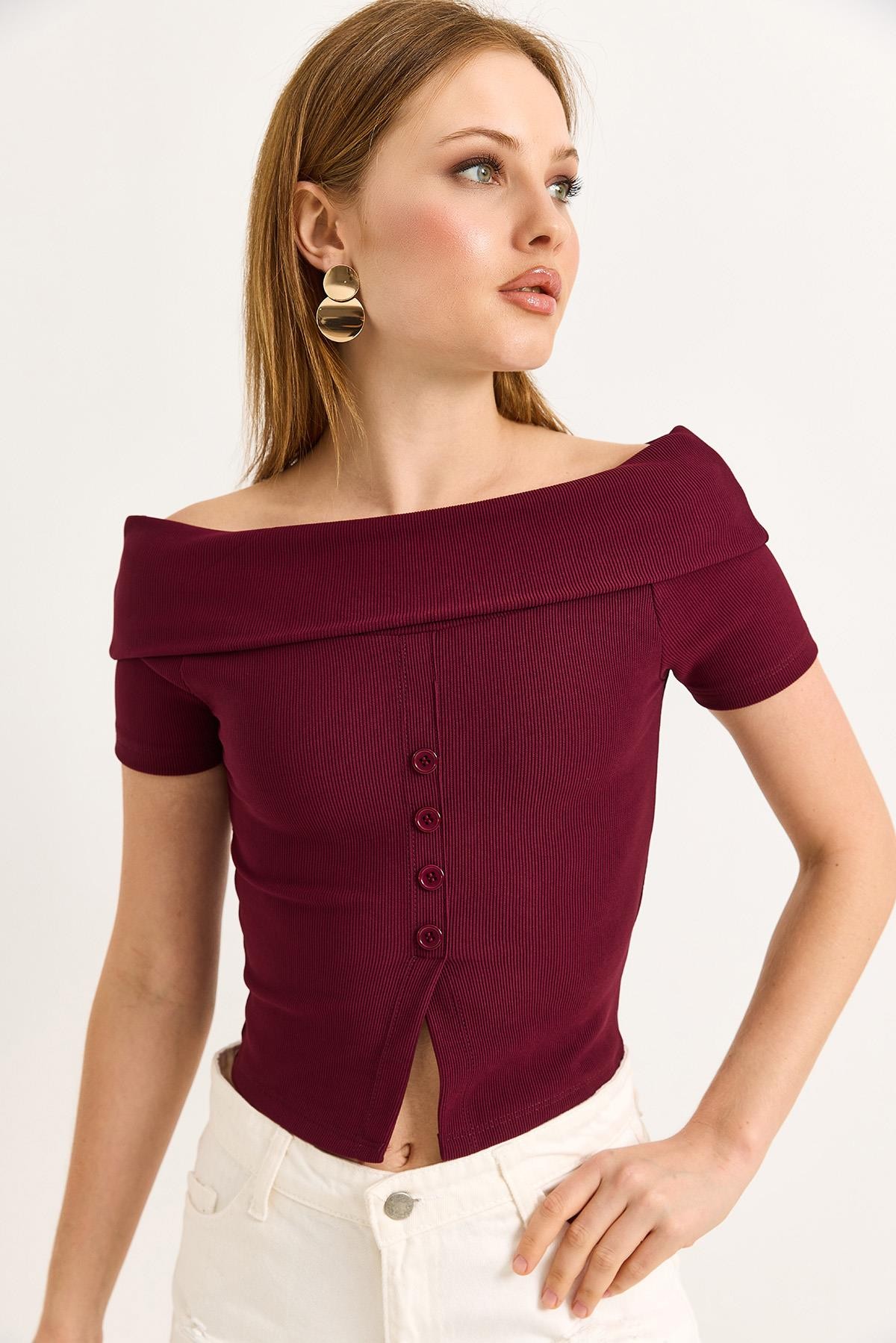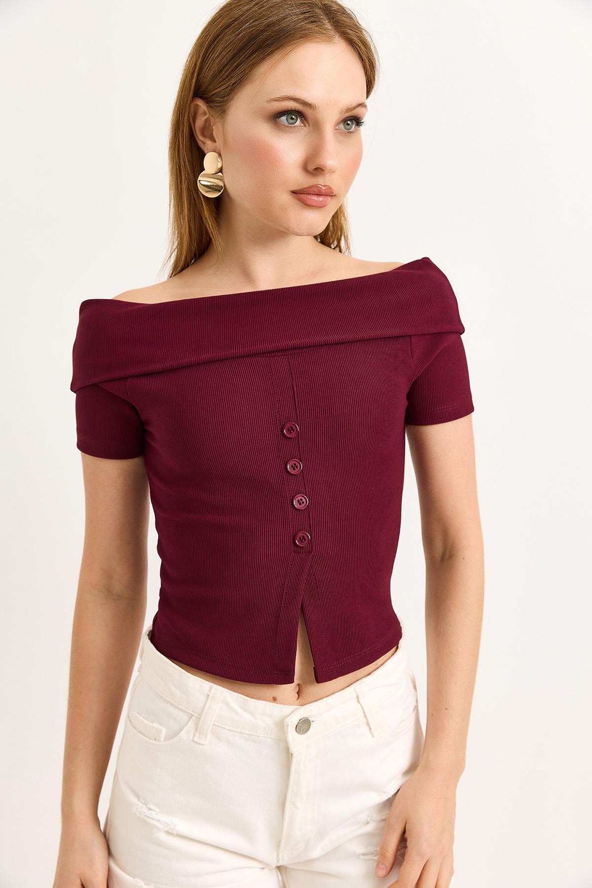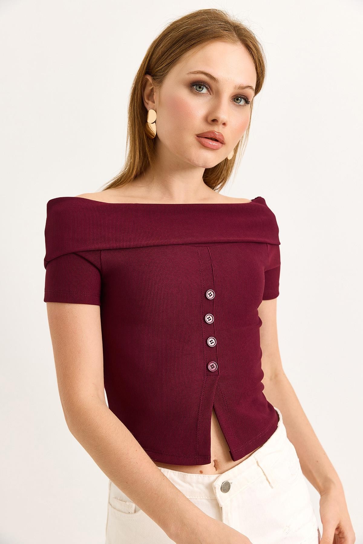 Kayık Yaka Düğme Detaylı Fitilli Örme Bluz Bordo (500188BLZXBRD)