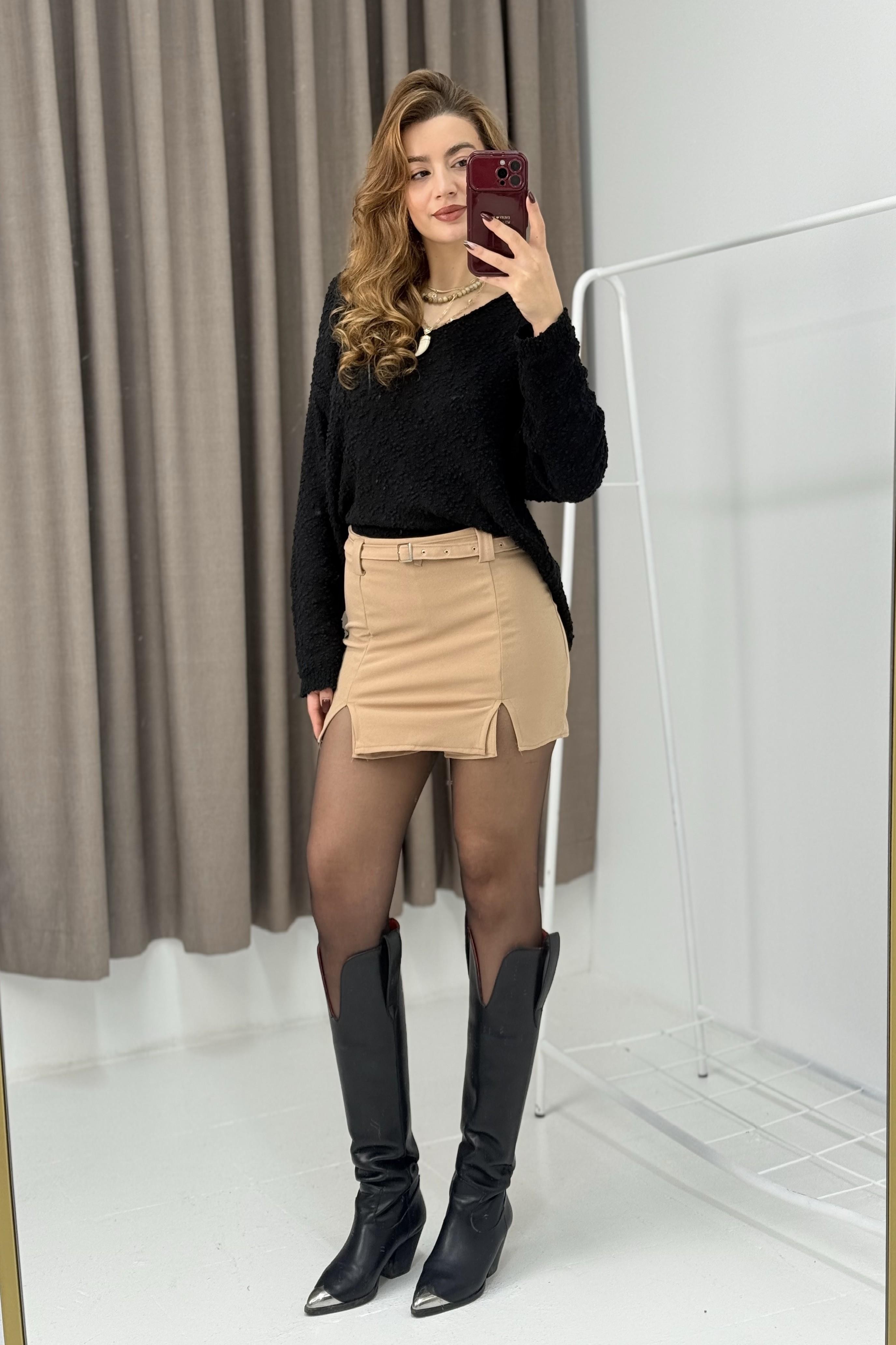 Kendinden Kemerli Yırtmaç Detaylı Şort Etek Vizon (251046ETKXVZN)