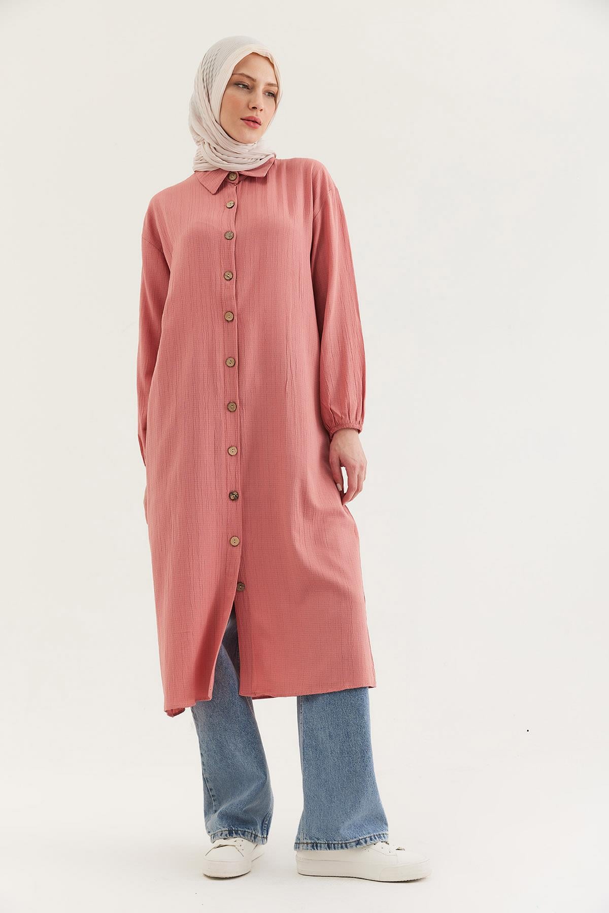 Keten Düğmeli Uzun Tesettür Tunik Gül Kurusu