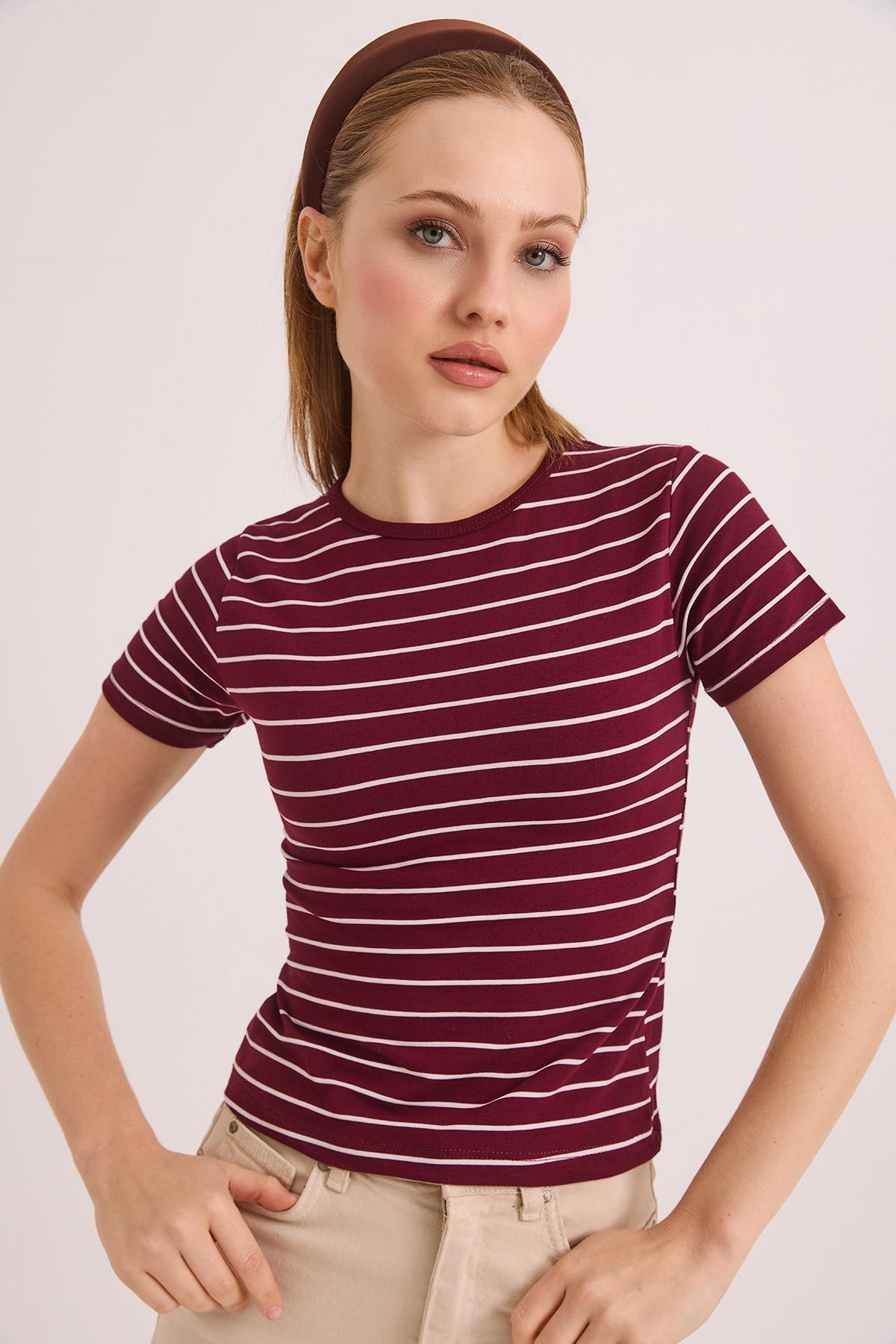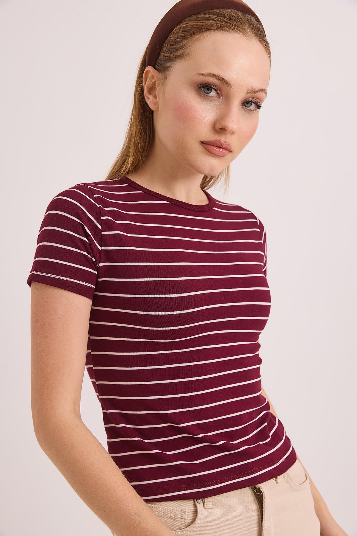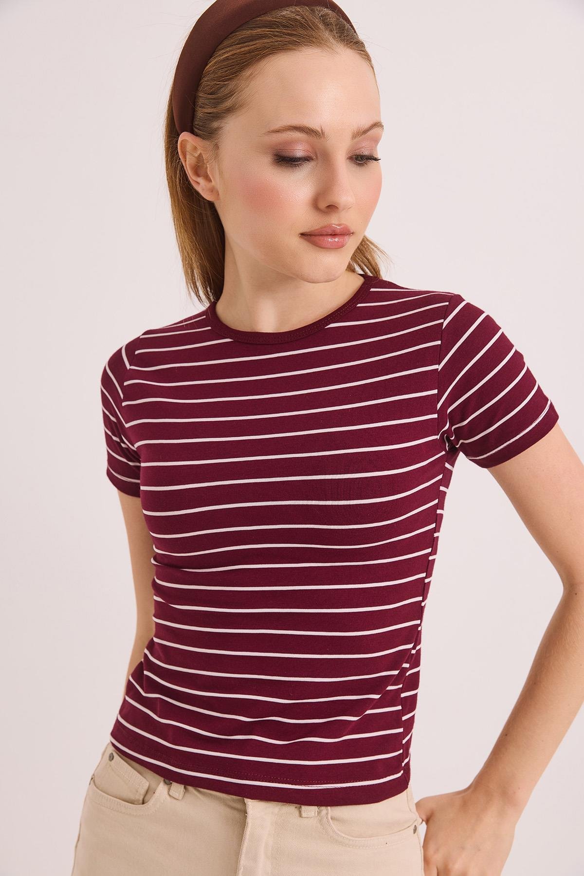 Kısa Kol Likralı Kompak Çizgili Tshirt Bordo (250863TSHXBRD)