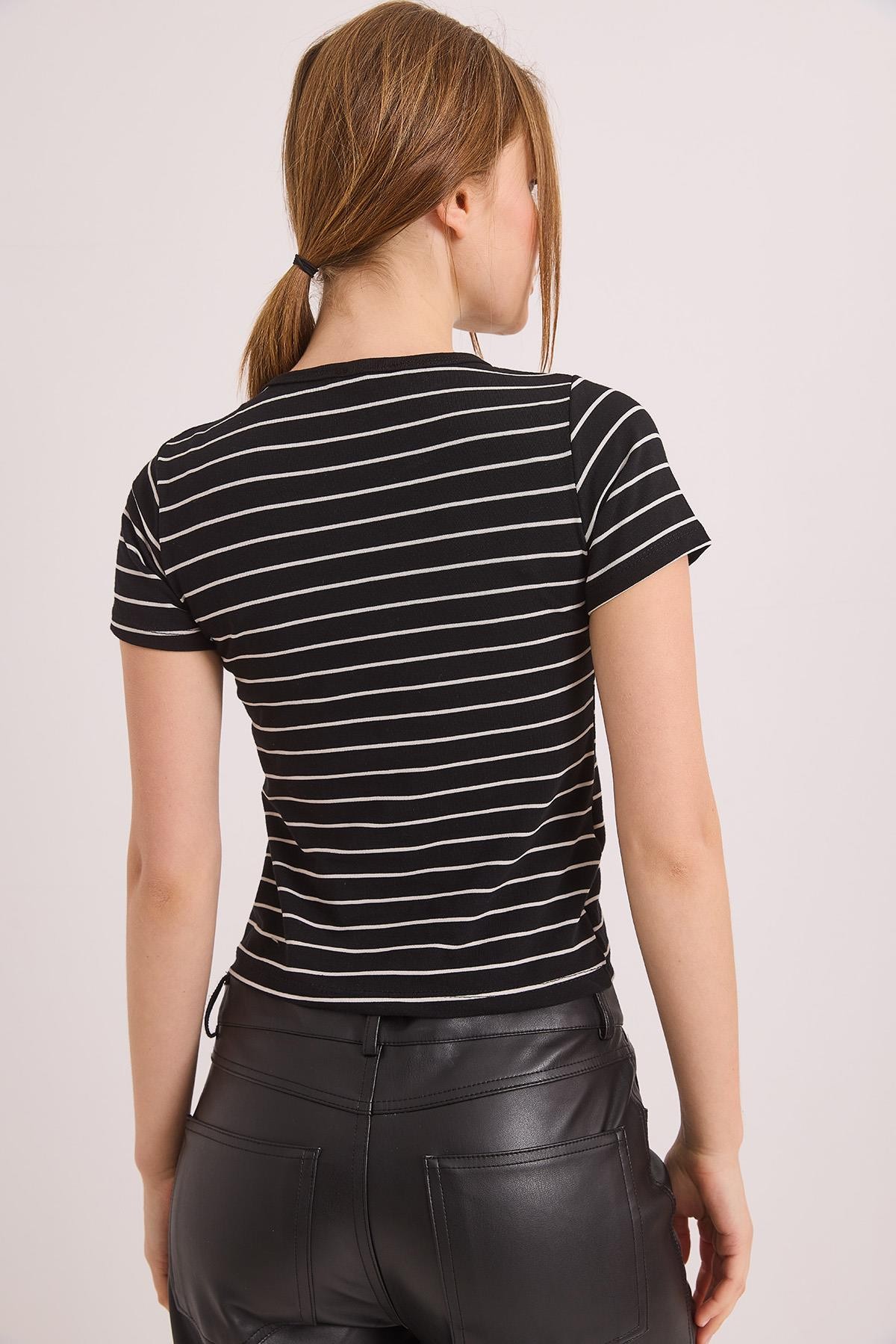 Kısa Kol Likralı Kompak Çizgili Tshirt Siyah