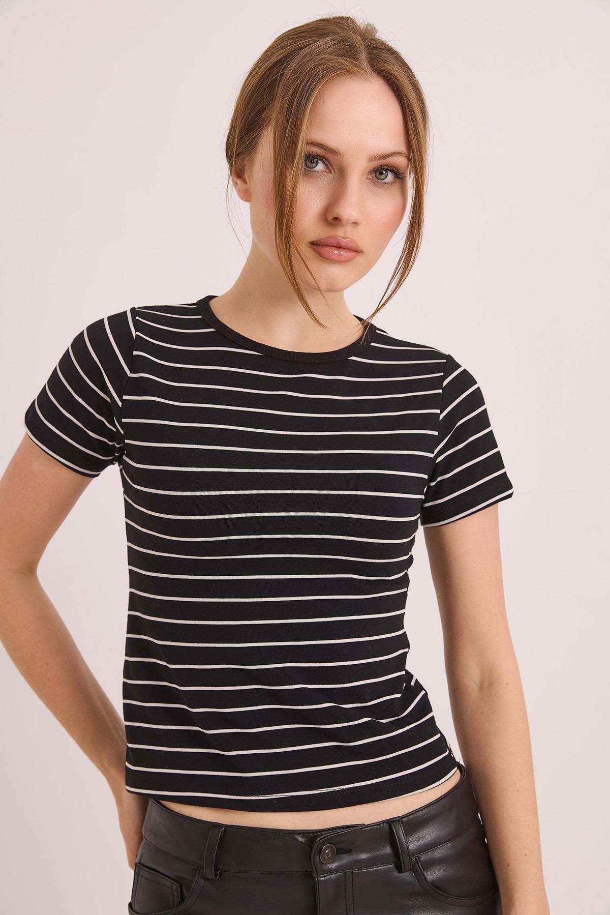 Kısa Kol Likralı Kompak Çizgili Tshirt