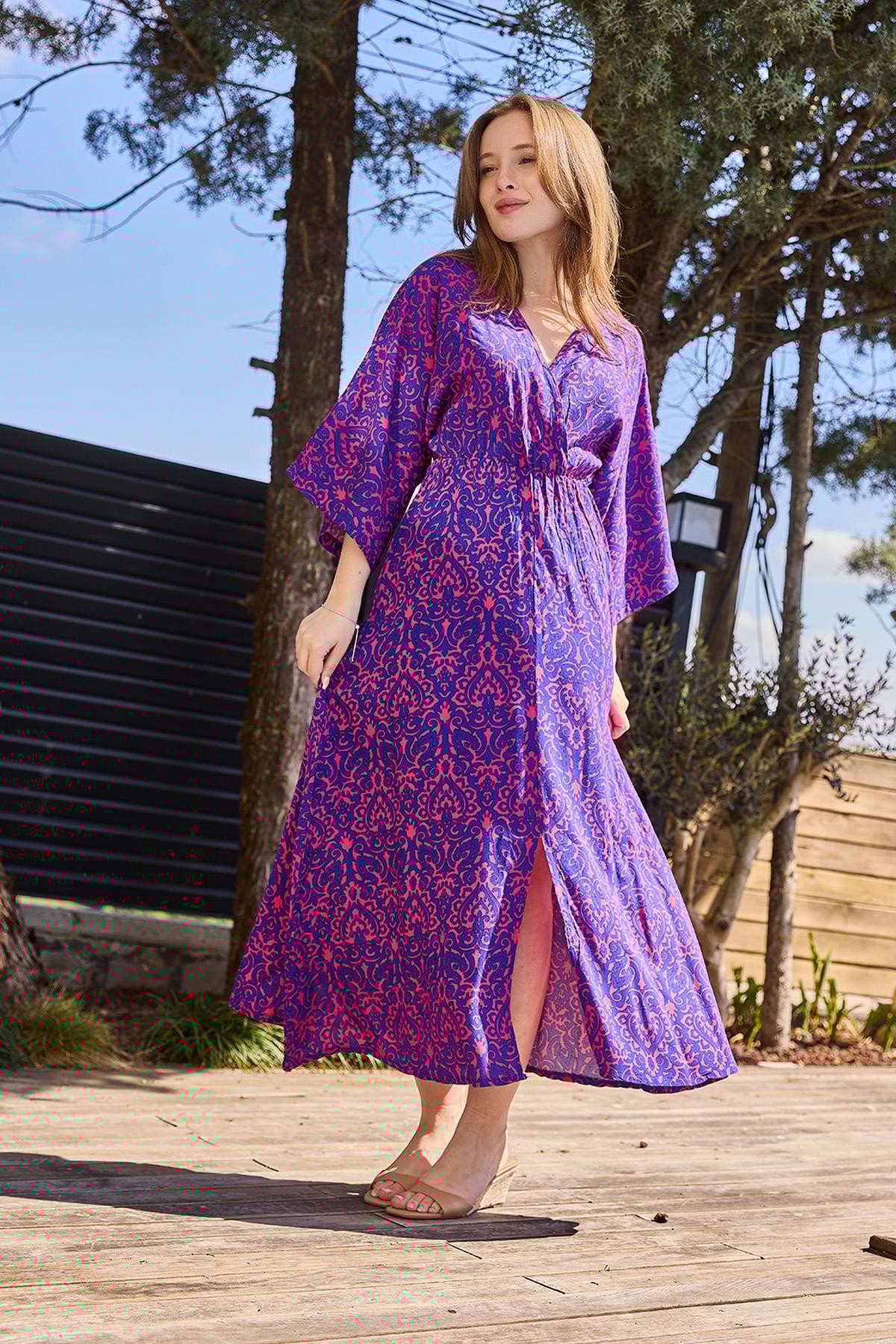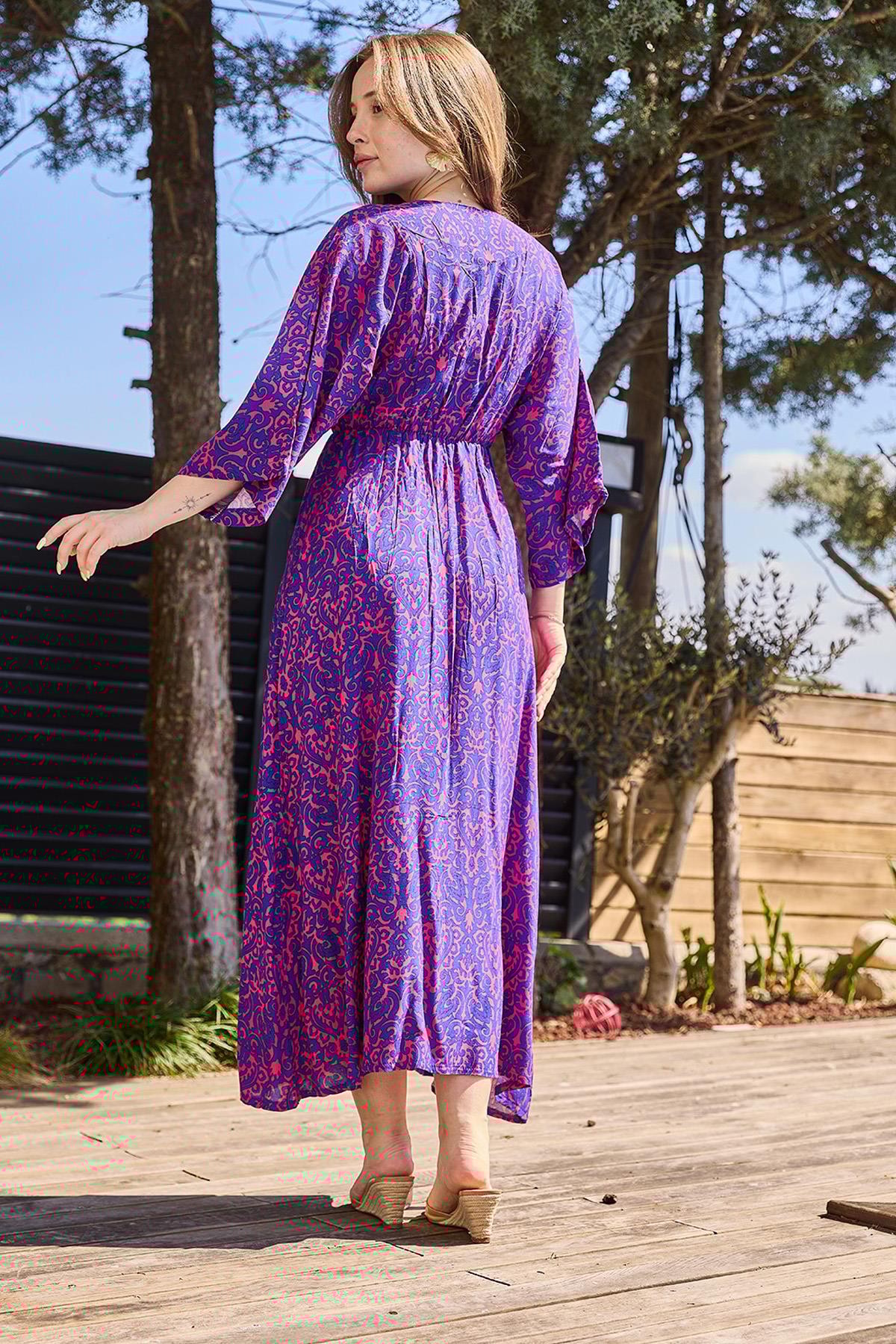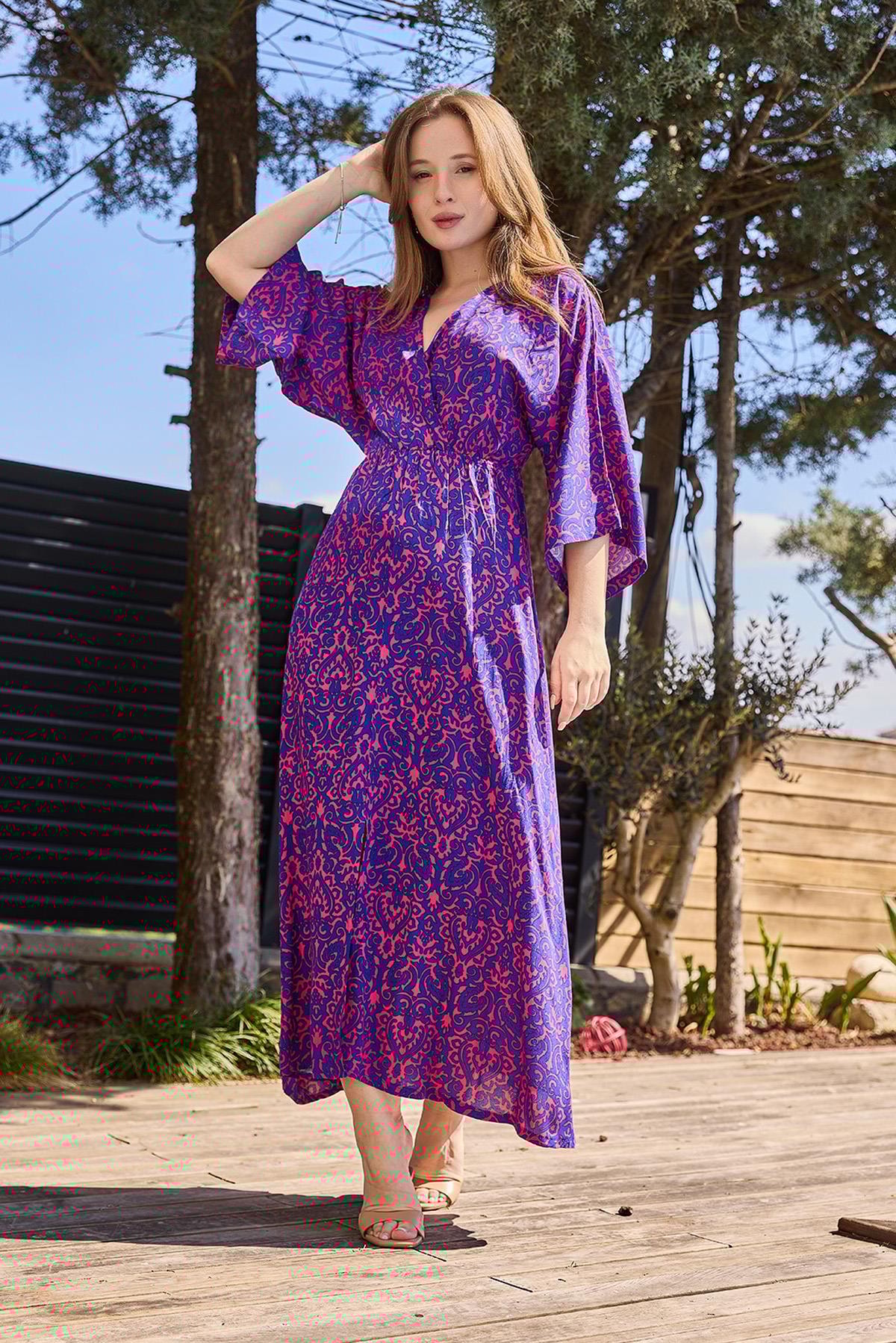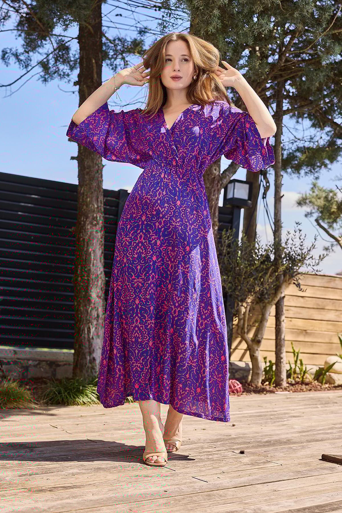 Kruvaze Yaka İspanyol Kol Yırtmaçlı Elbise Mor