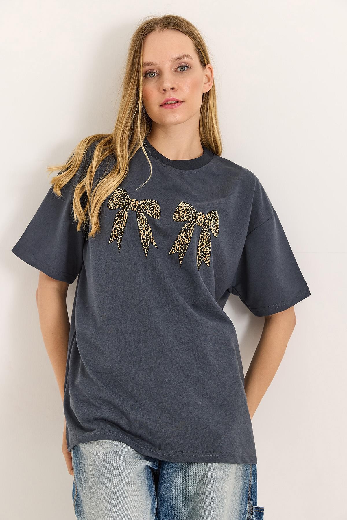 Kurdele Baskı Detaylı Basic Tshirt Füme (250430TSHXFME)