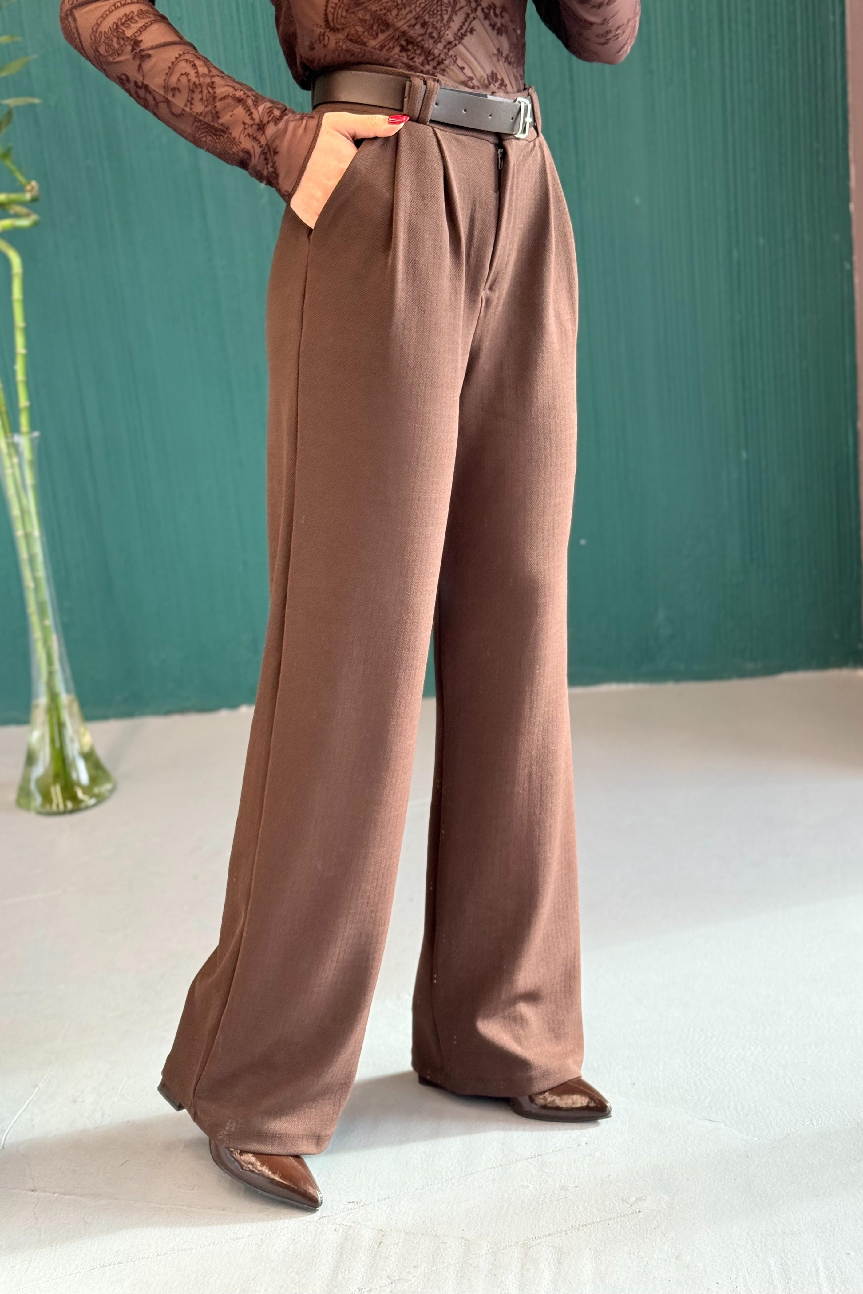 Likralı Krep Örme Kumaş Kemerli Salaş Pantolon Kahverengi (60020PNTXKHV)
