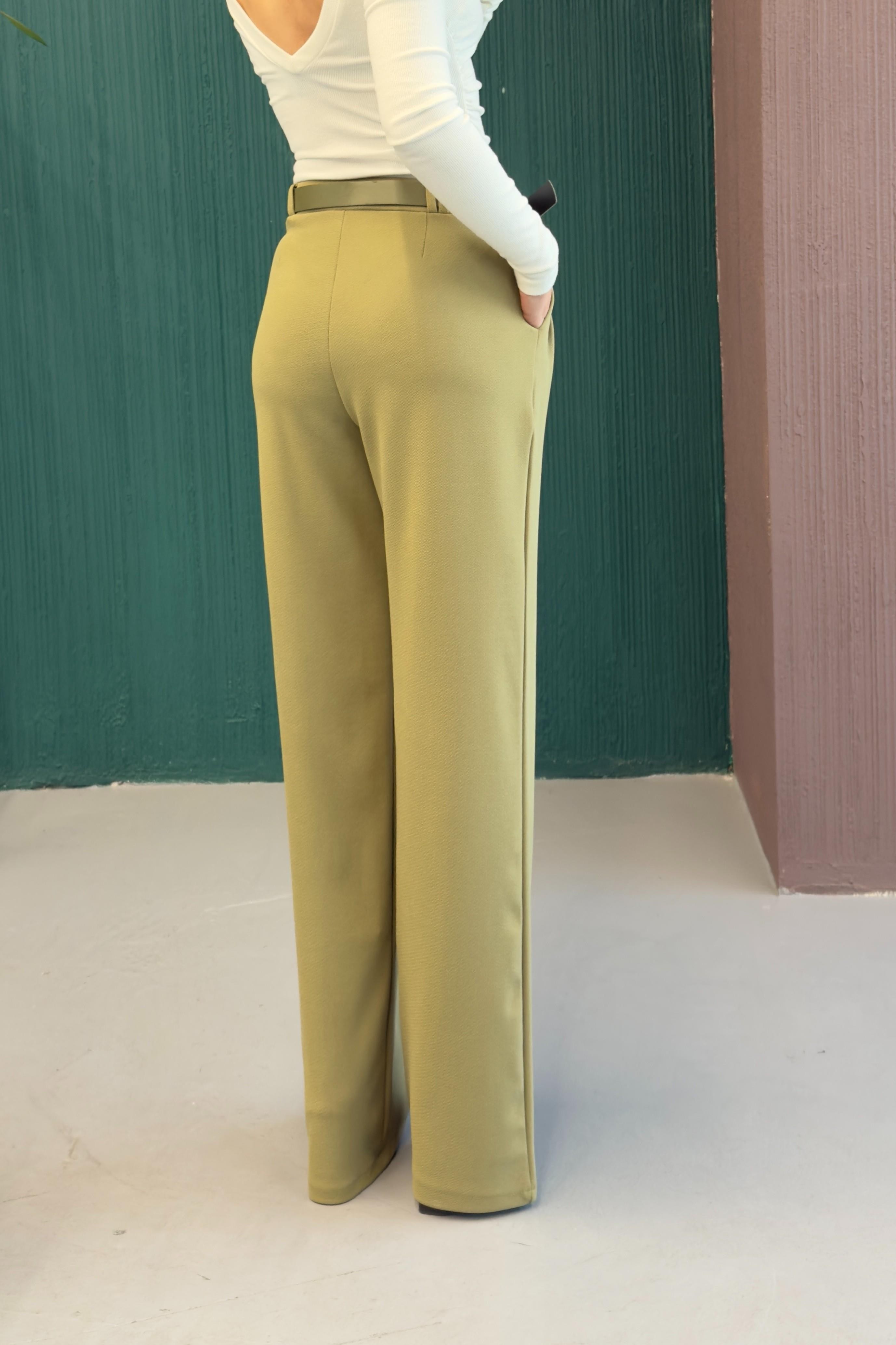 Likralı Krep Örme Kumaş Kemerli Salaş Pantolon Yeşil (60020PNTXYŞL)