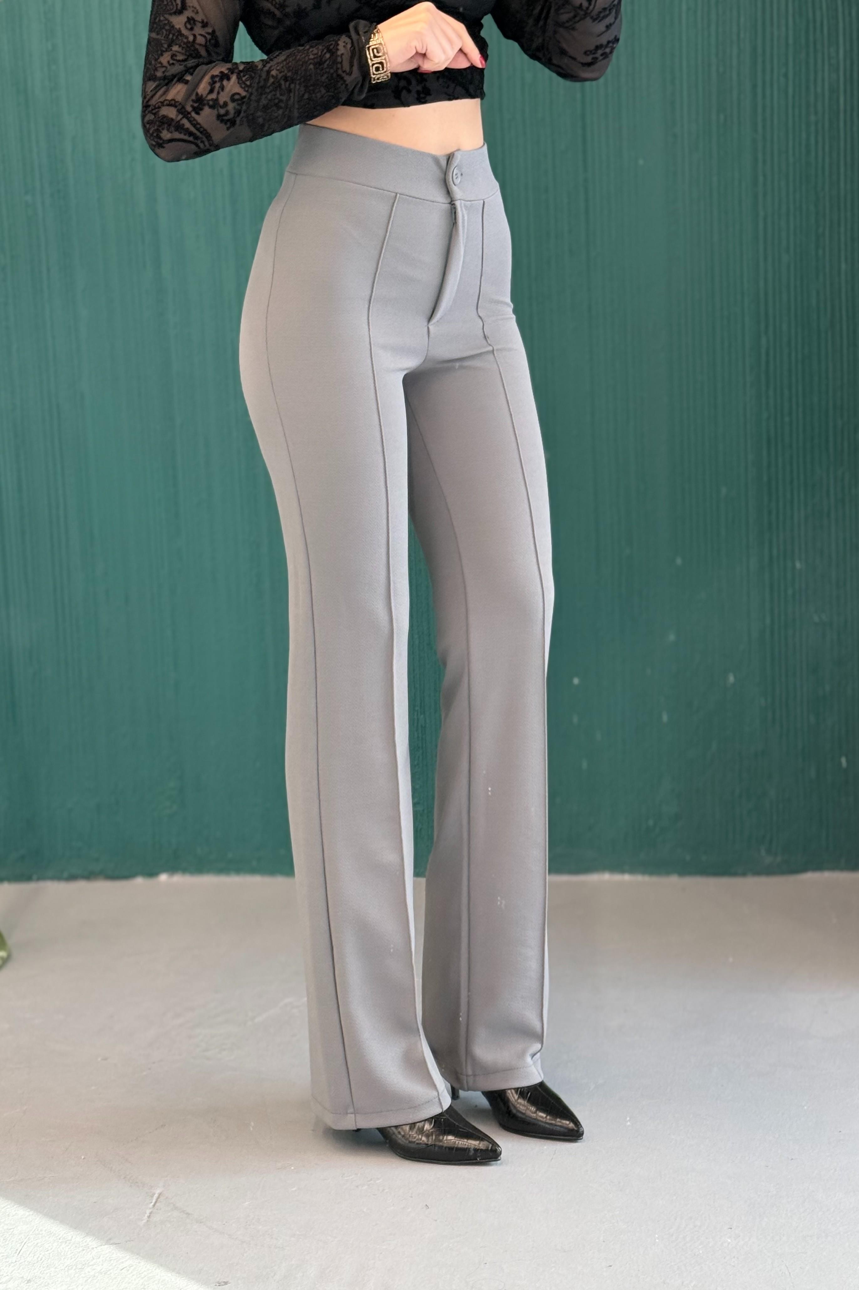 Likralı Krep Örme Kumaşı Yüksek Bel Çımalı Pantolon Gri (60022PNTXGRİ)