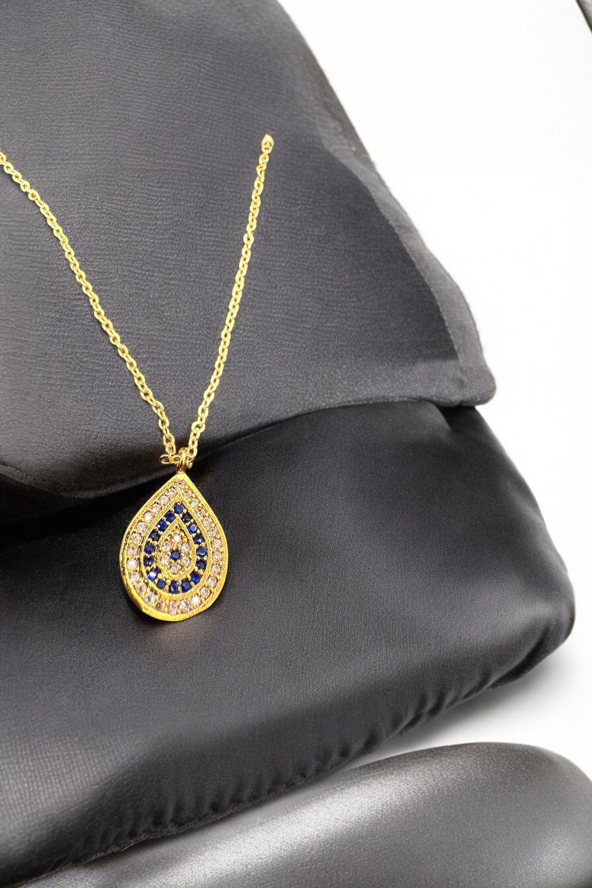 Mavi Ve Beyaz Taşlı İki Zincirli Damla Kolye Gold (250248AKSXGLD)