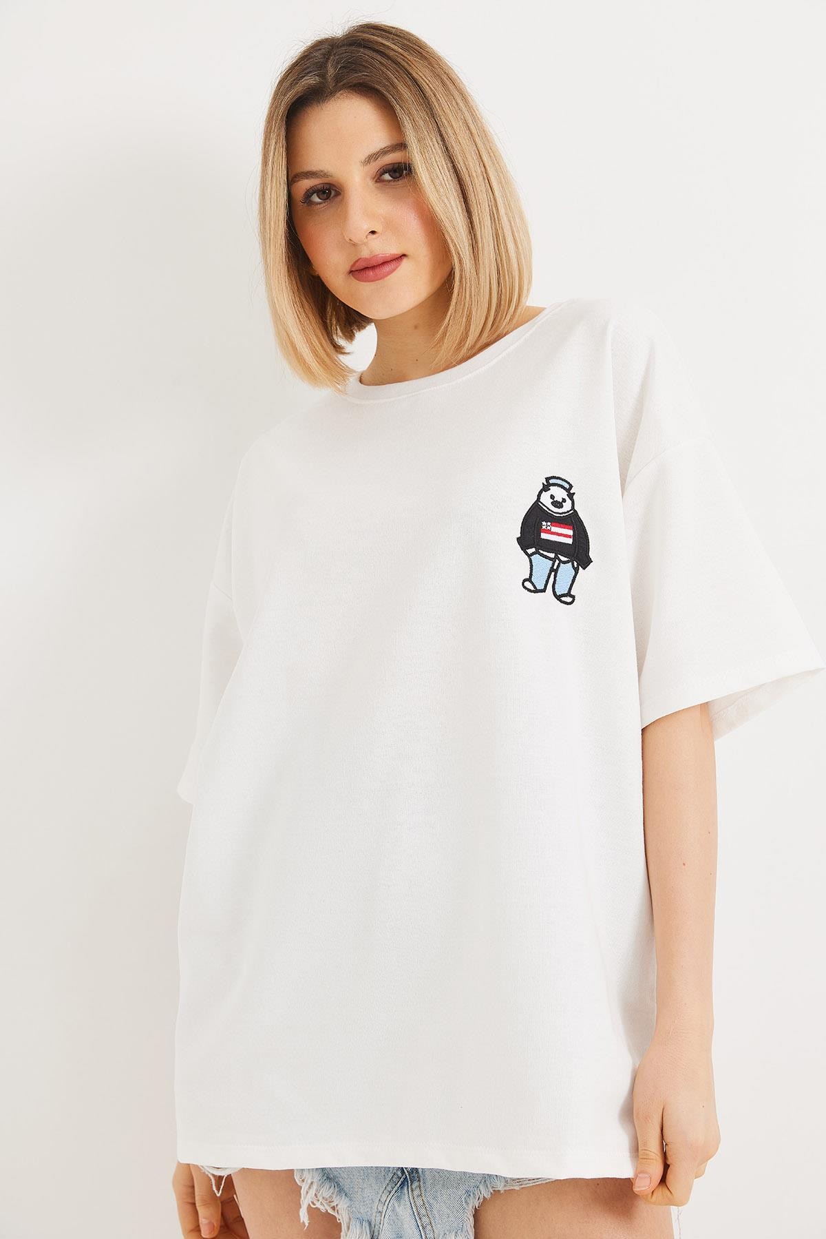 Nakışlı Bisiklet Yaka Tshirt Beyaz