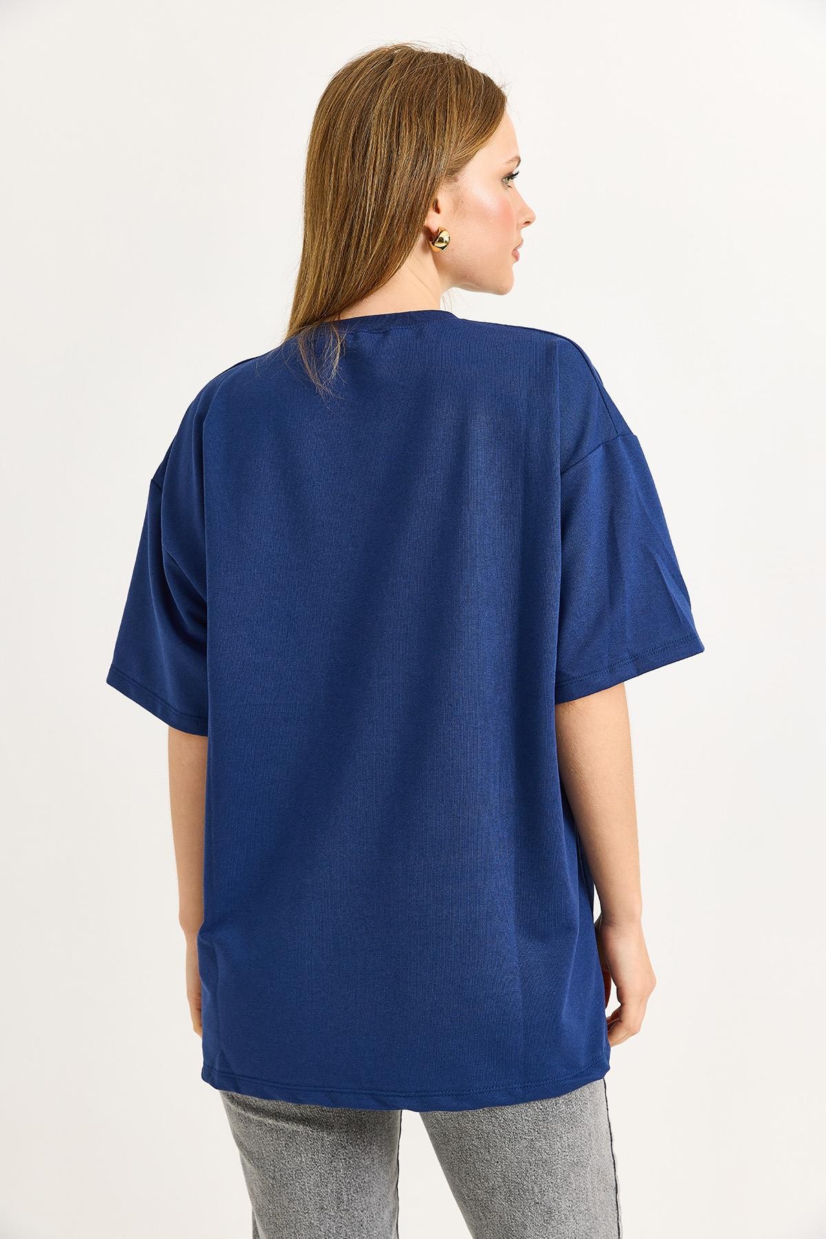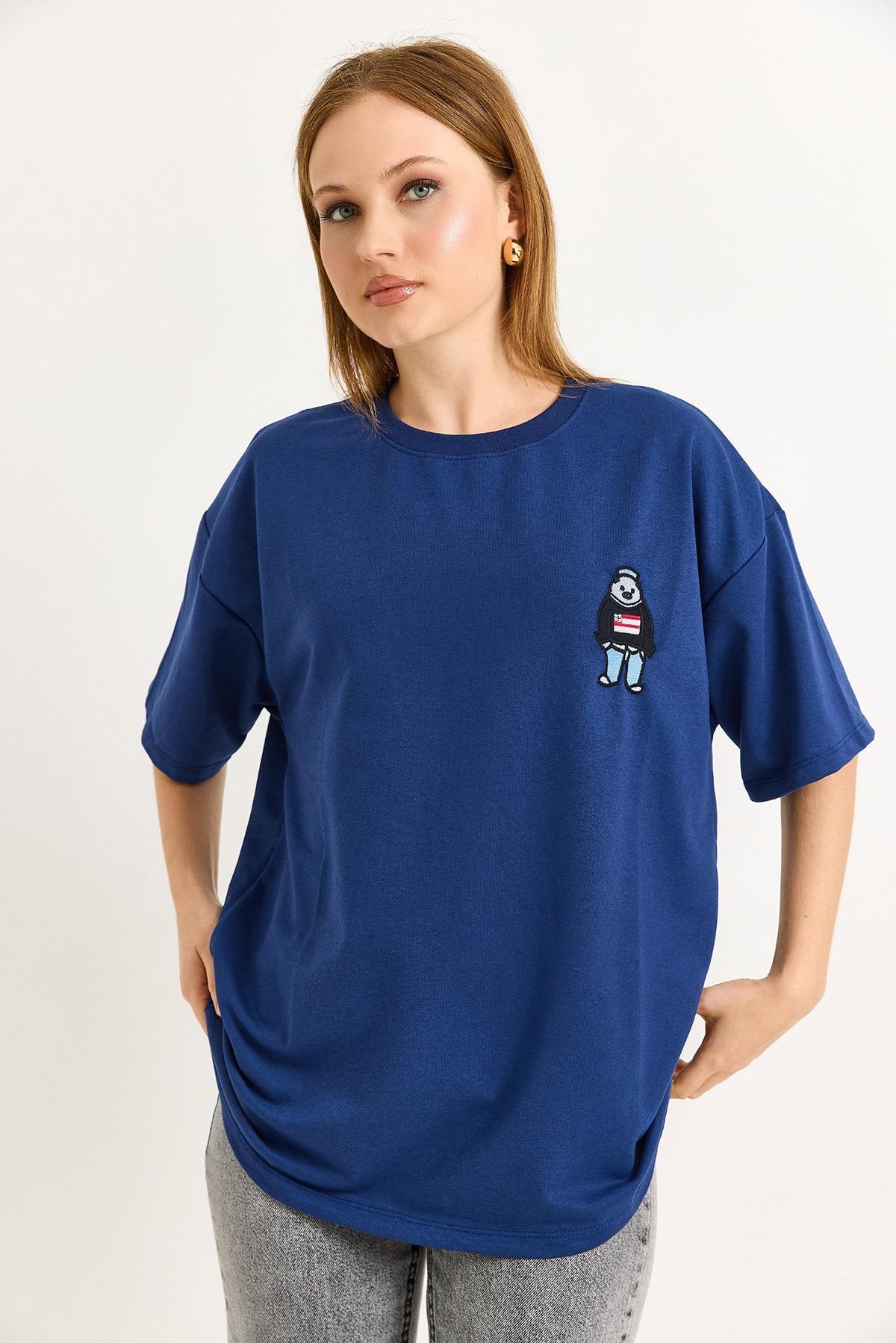 Nakışlı Bisiklet Yaka Tshirt  Lacivert