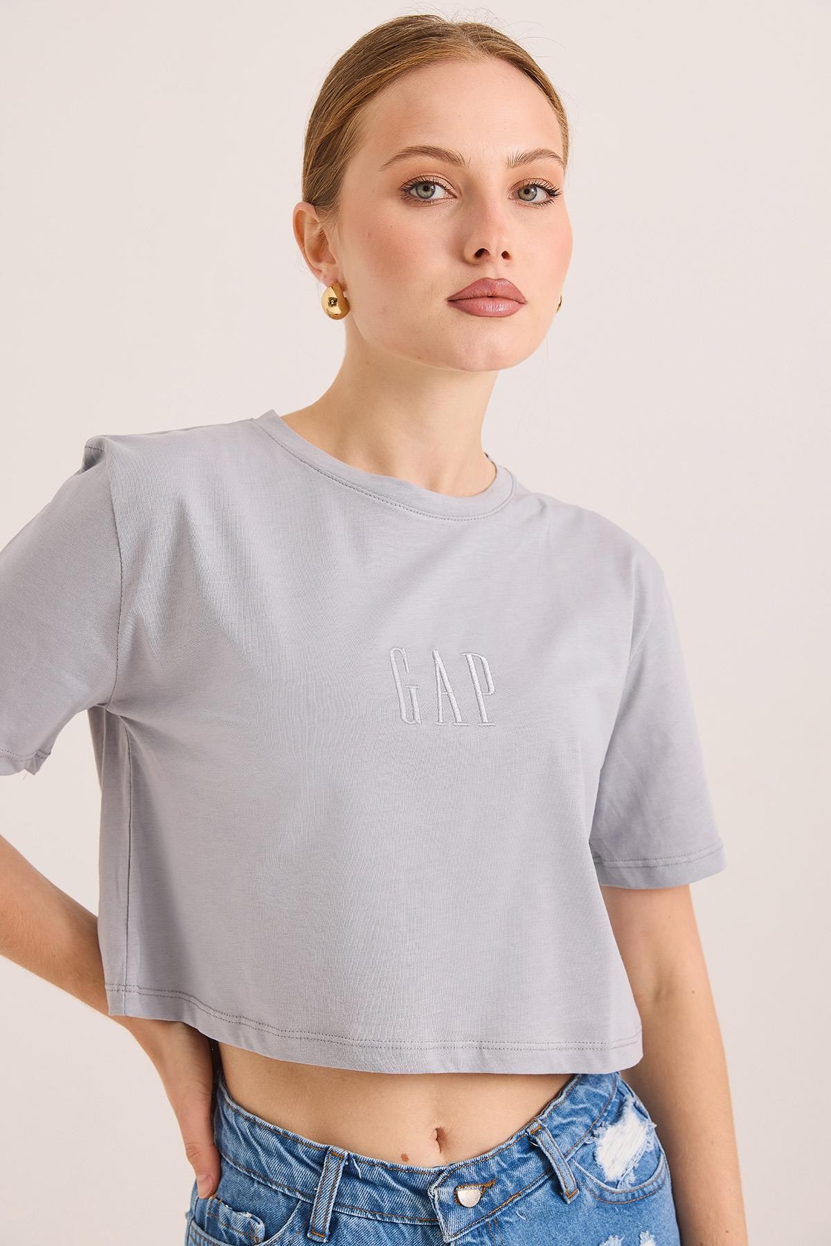 Nakışlı Örme Pamuk Crop Tshirt Gri (250727TSHXGRİ)