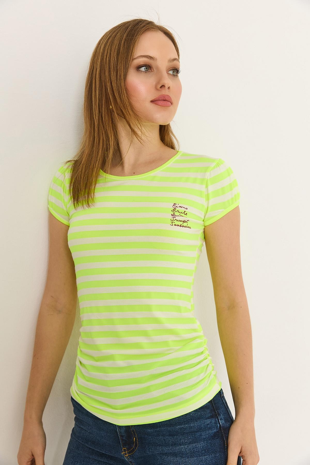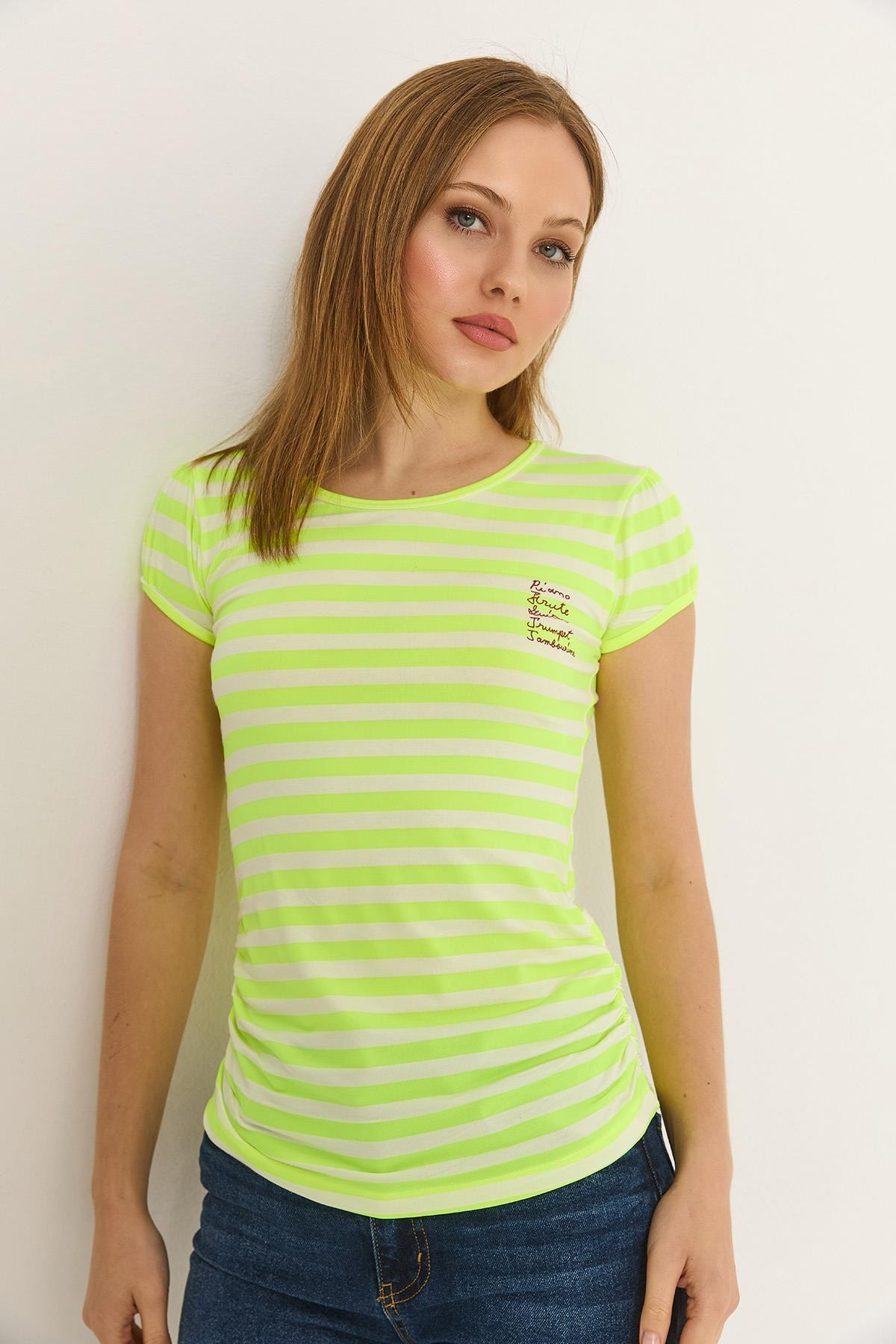 Neon Çizgili Yanı Büzgülü Baskılı Tshirt Yeşil (500165BLZXYSL)
