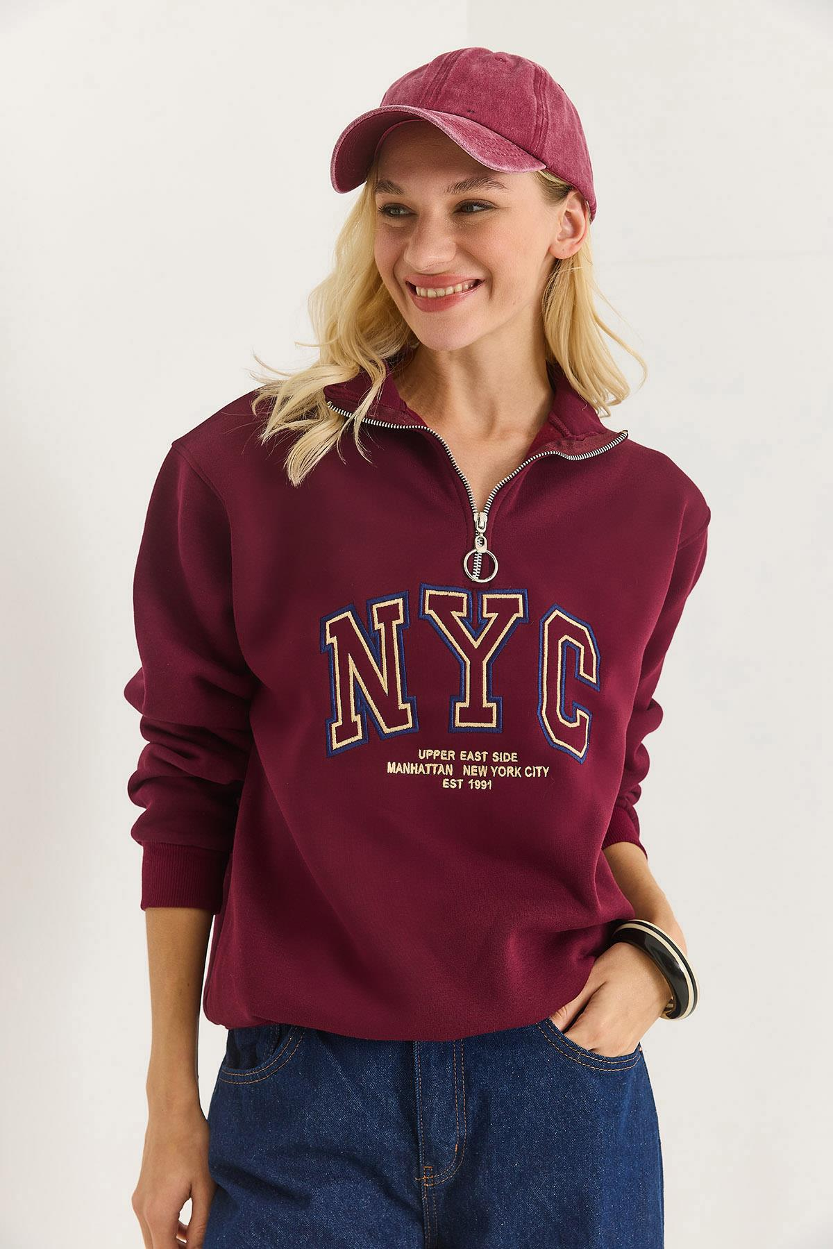 Nyc Nakışlı Fermuar Detaylı Dik Yaka Oversize Sweatshirt Bordo (250013SWTXBRD)