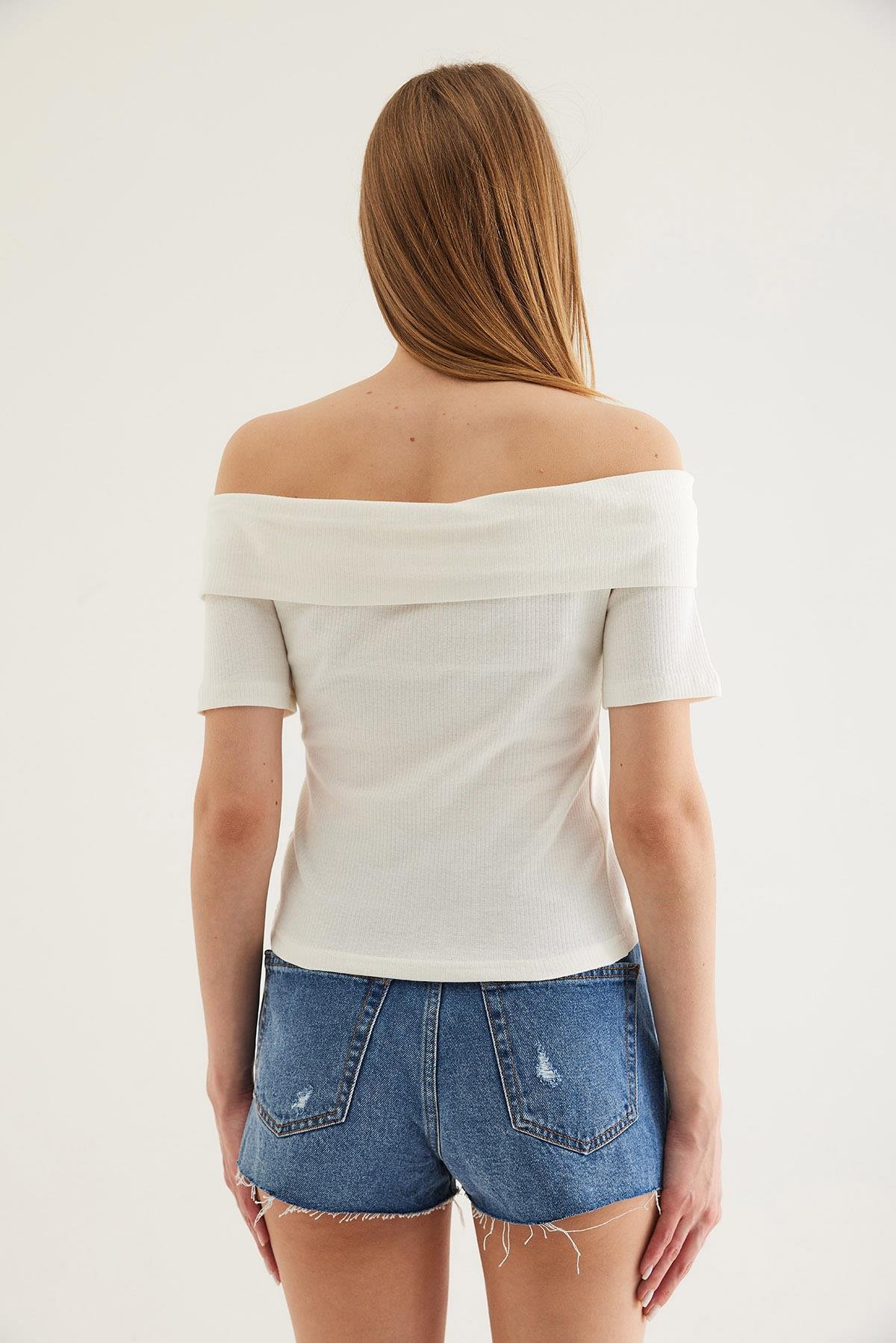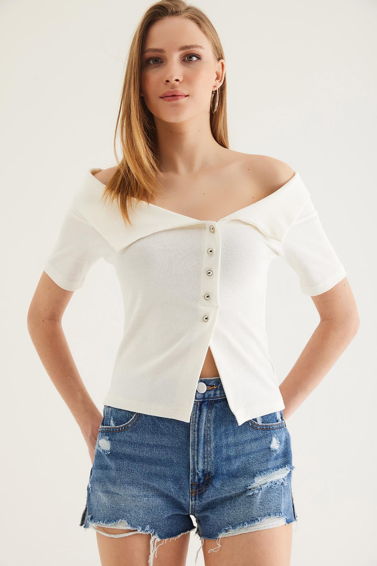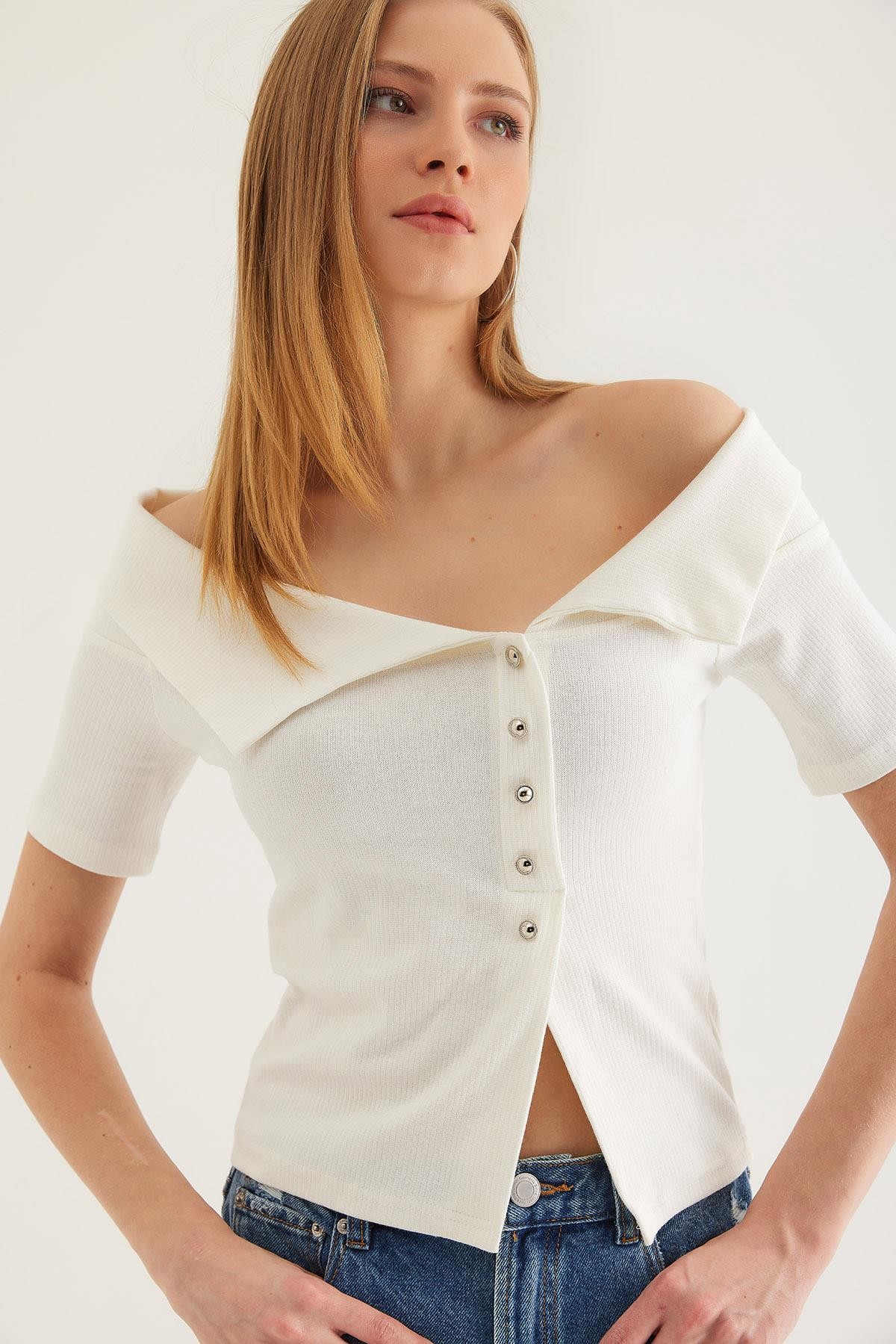Omuz Açık  Düğme Detaylı  Bluz Beyaz