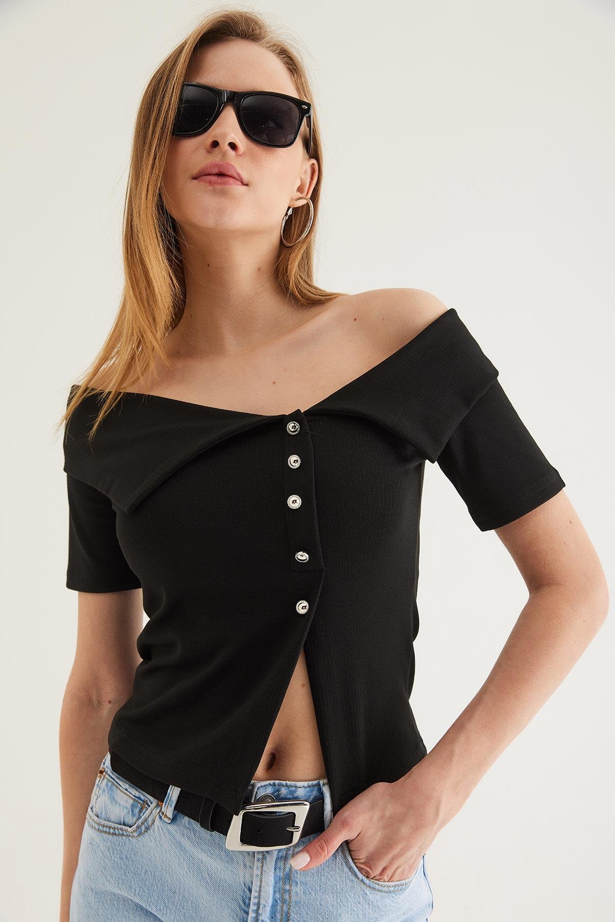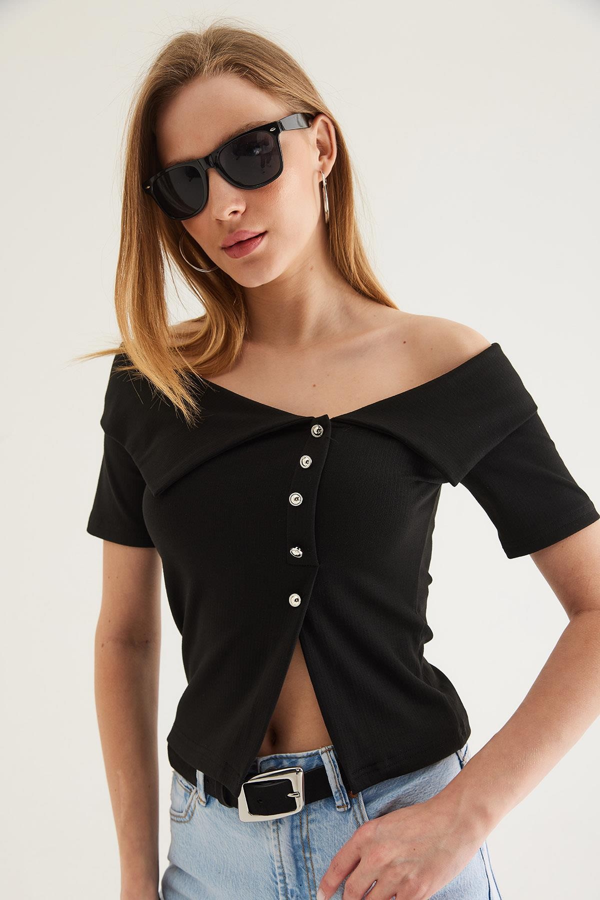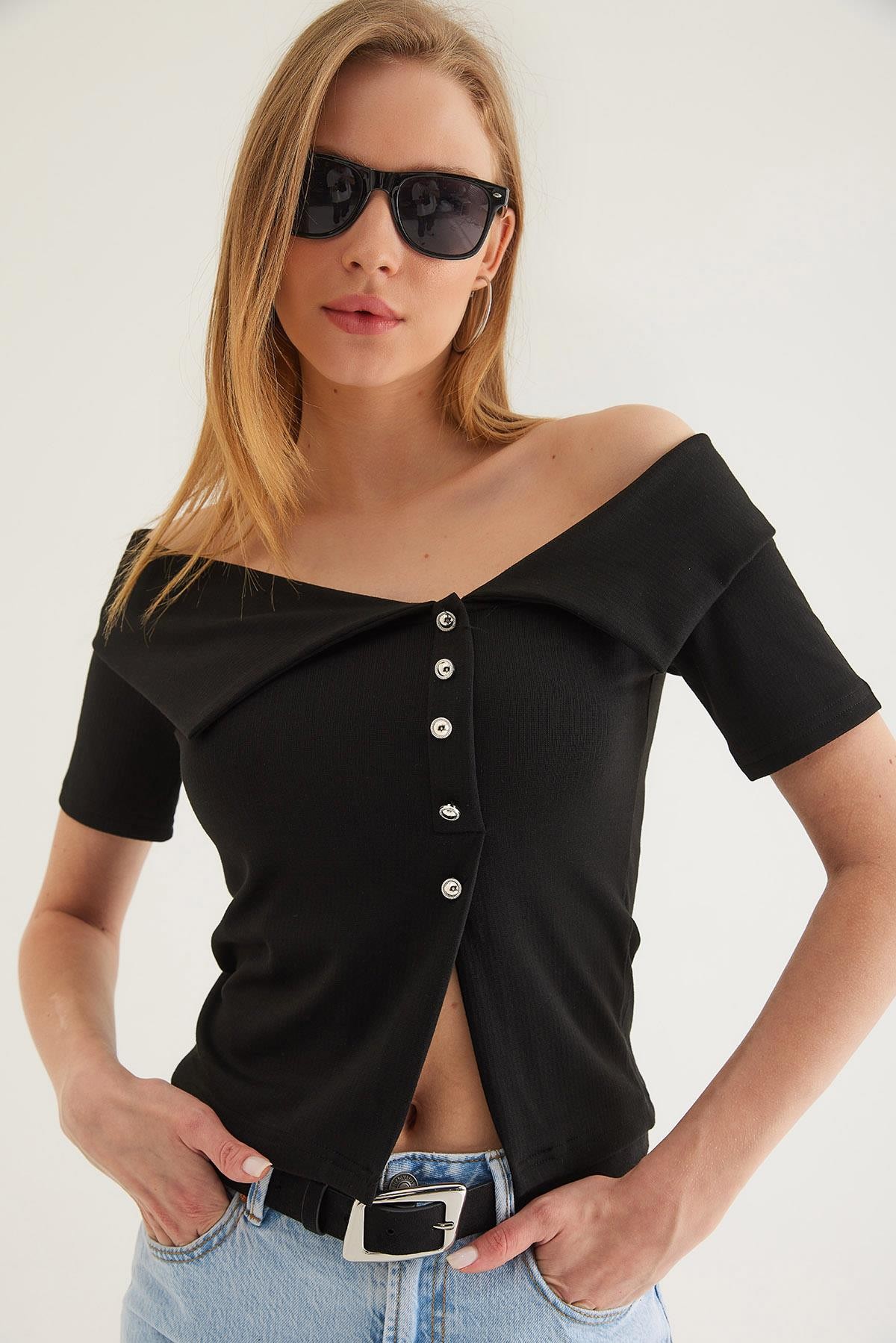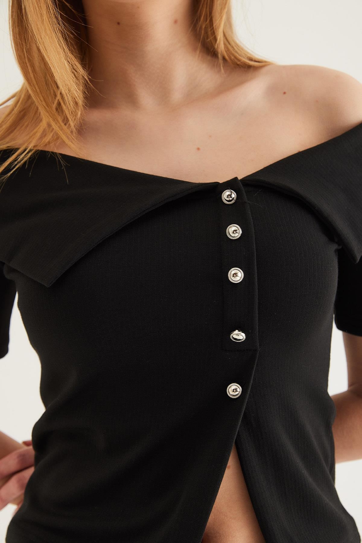 Omuz Açık  Düğme Detaylı Bluz Siyah