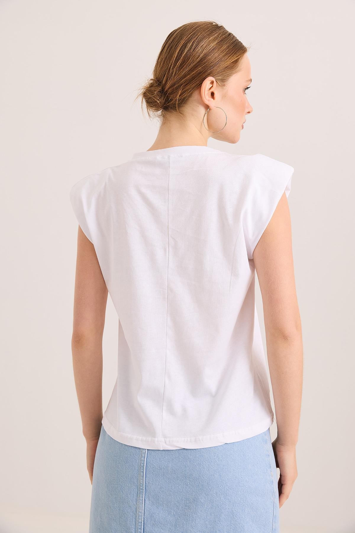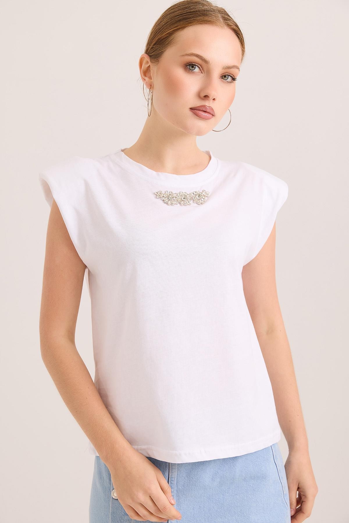 Omuz Vatkalı Şık Aksesuar Detaylı Pamuk Örme Tshirt Beyaz