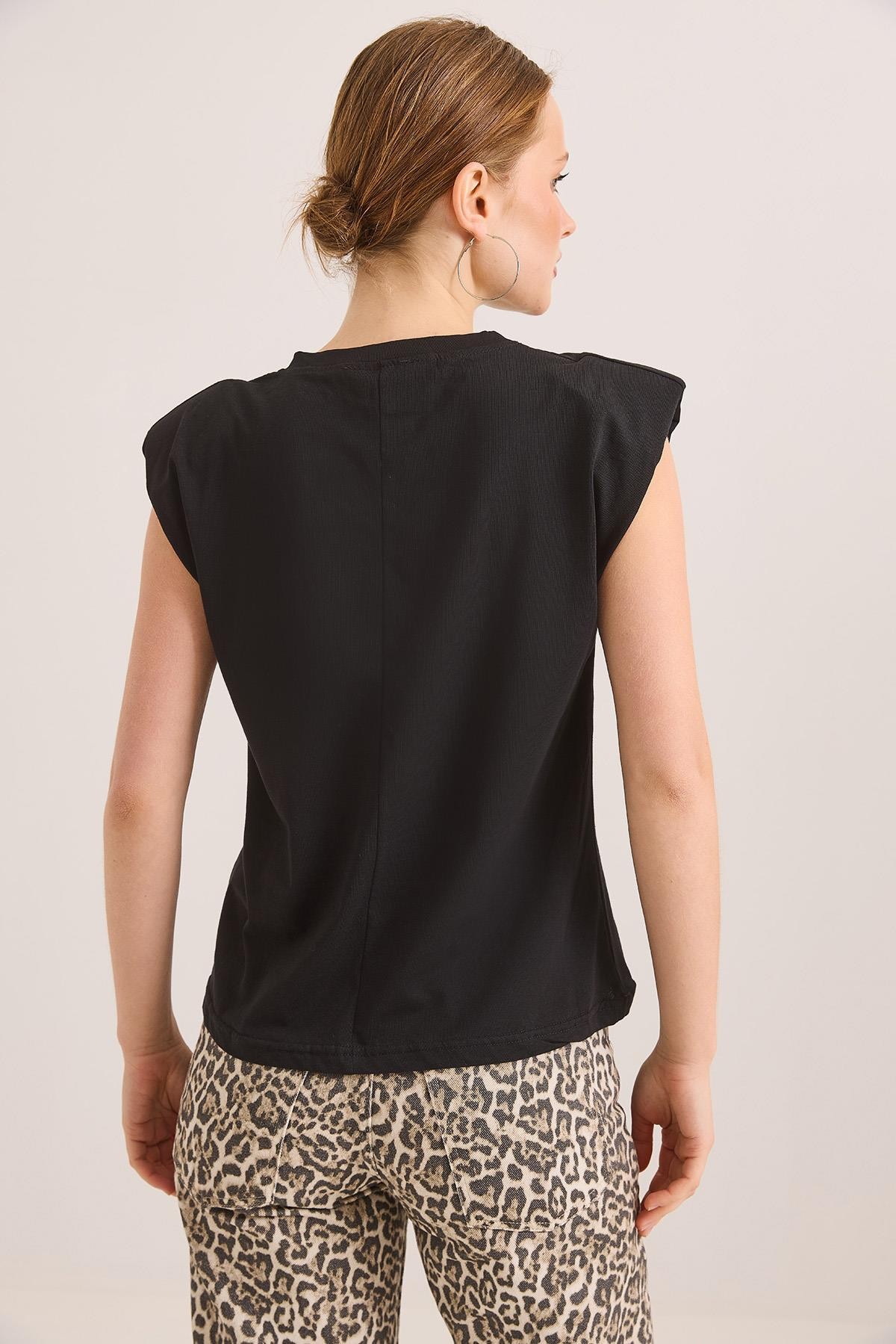 Omuz Vatkalı Şık Aksesuar Detaylı Pamuk Örme Tshirt Siyah (250743BLZXSYH)