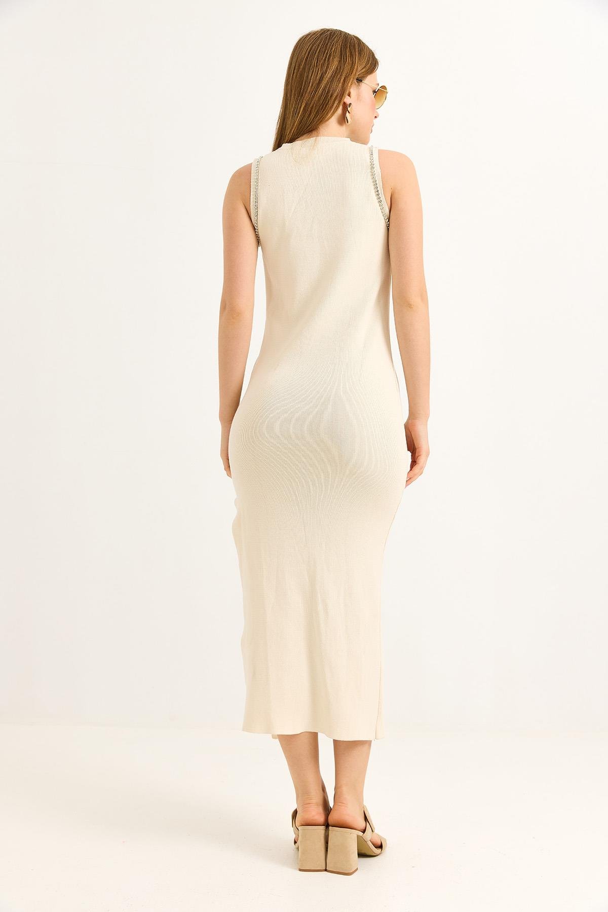 Omuzları Taş İşlemeli Krem Elbise (500217ELBXKRM)