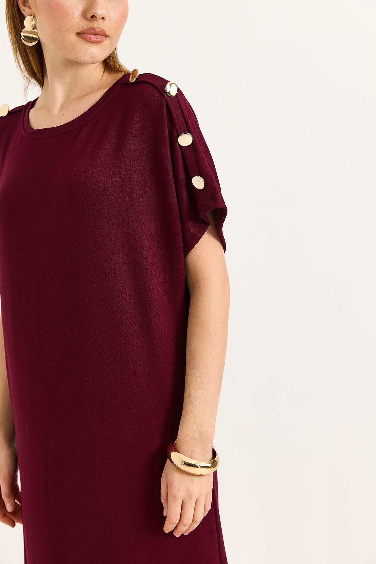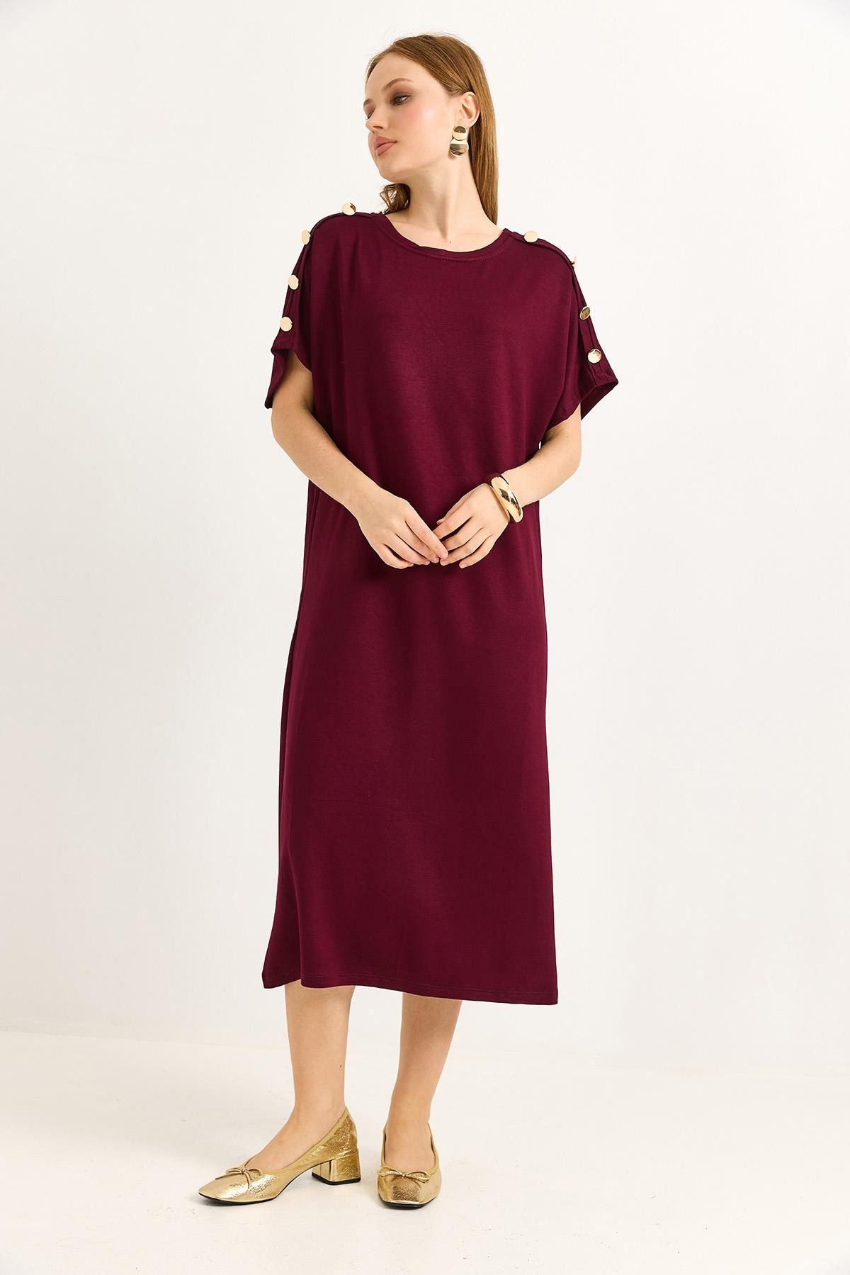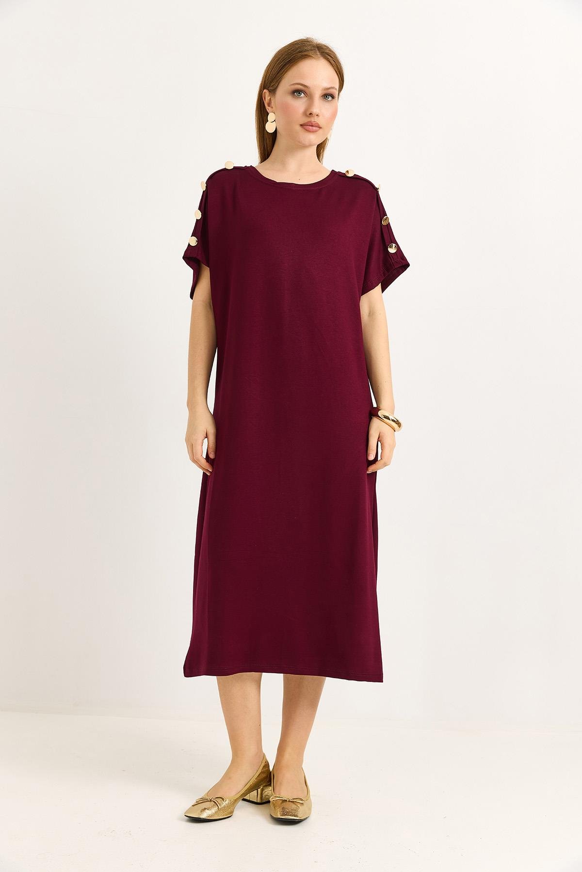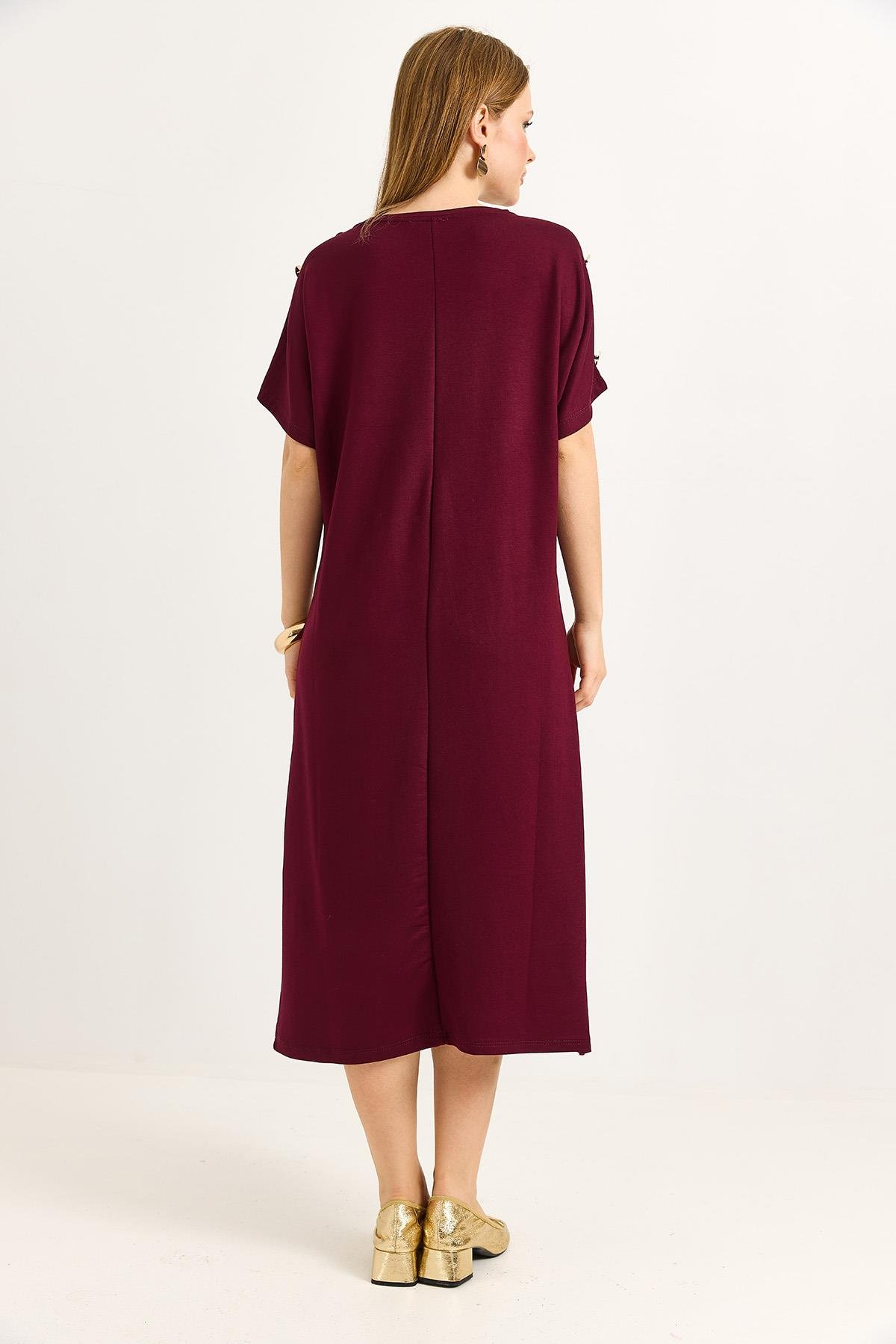 Omuzu Düğme Detaylı Dökümlü Elbise Bordo (500218ELBXBRD)
