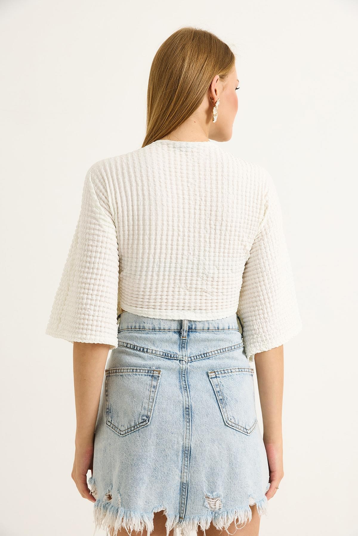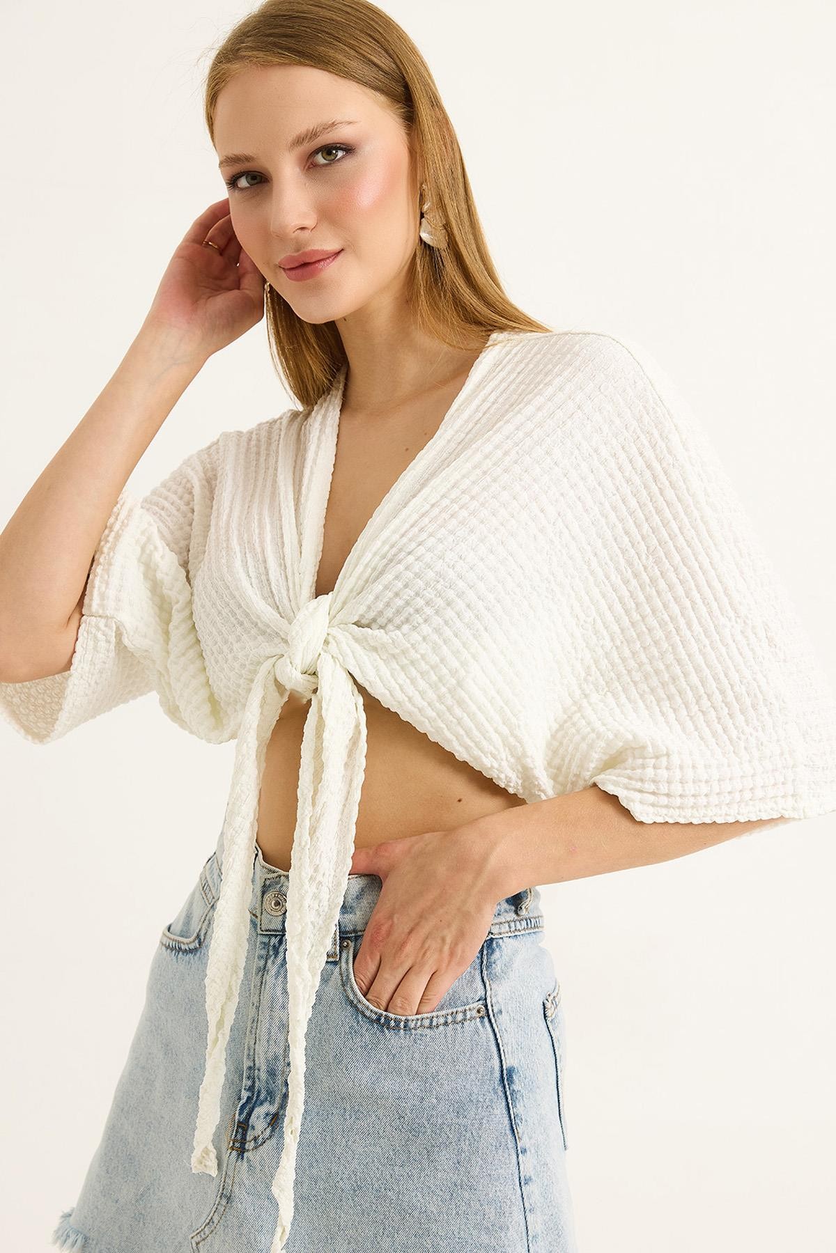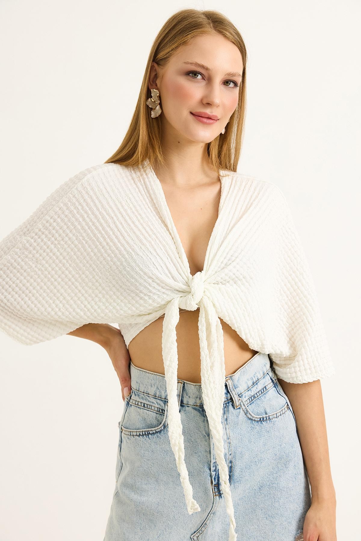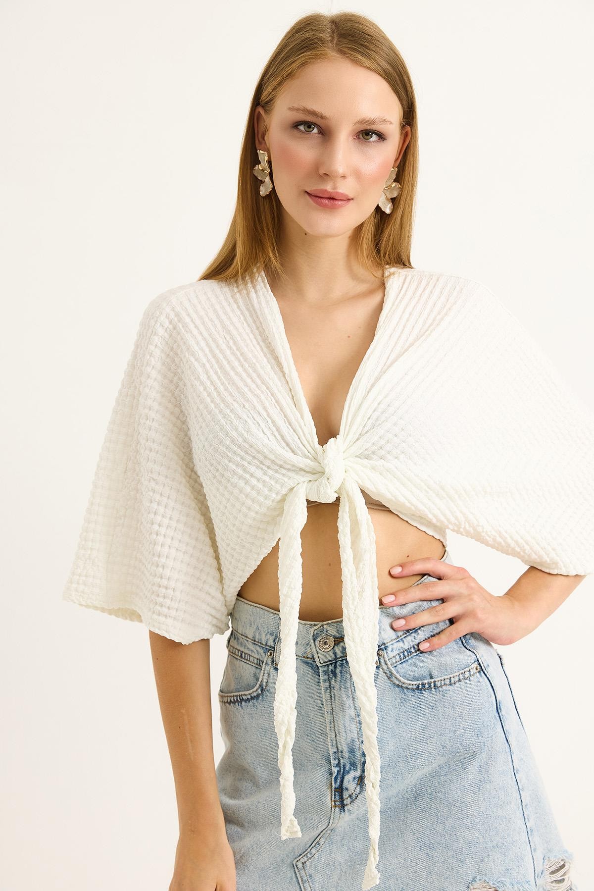 Önden Bağlamalı Yarasa Kol Kadın Bluz Beyaz