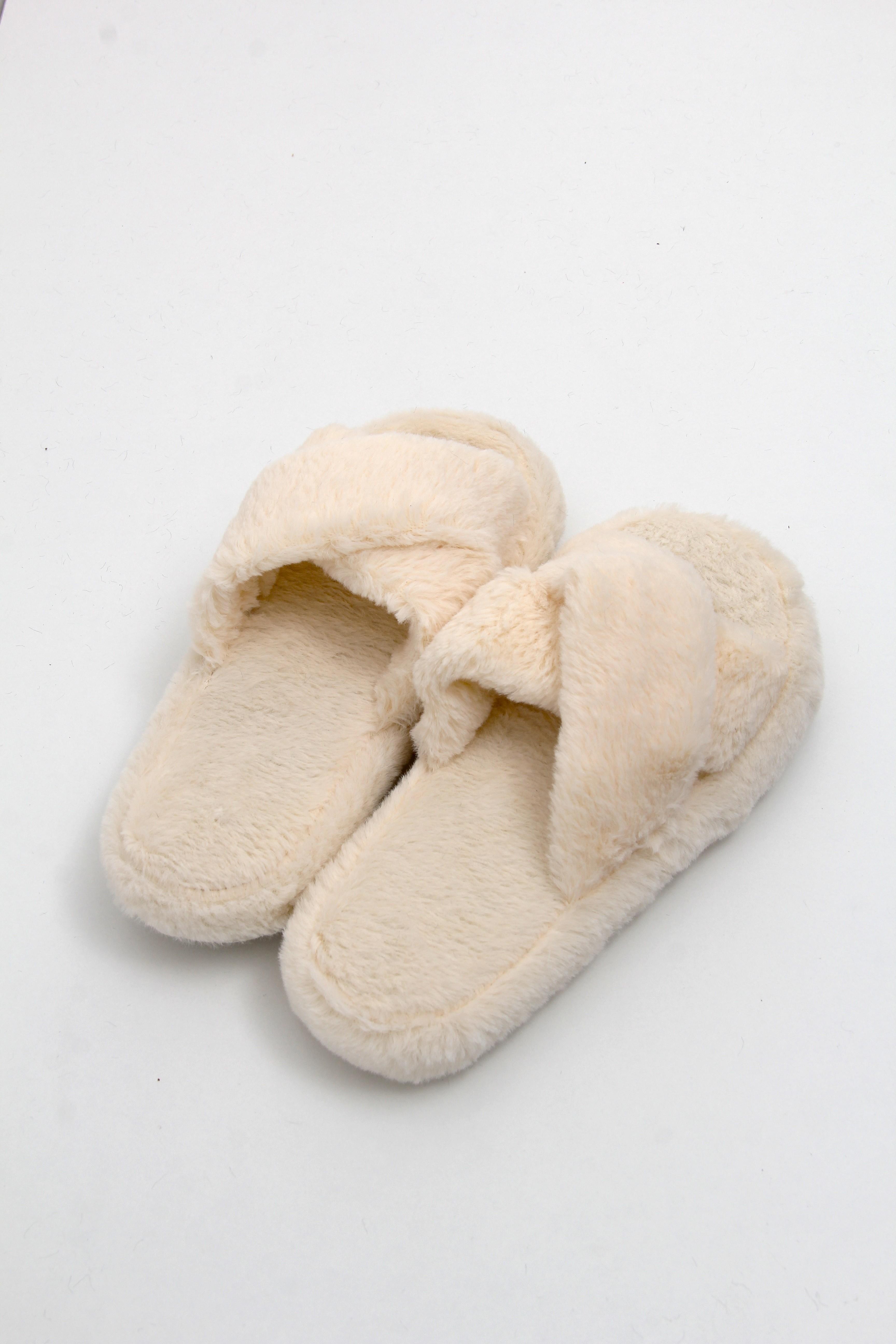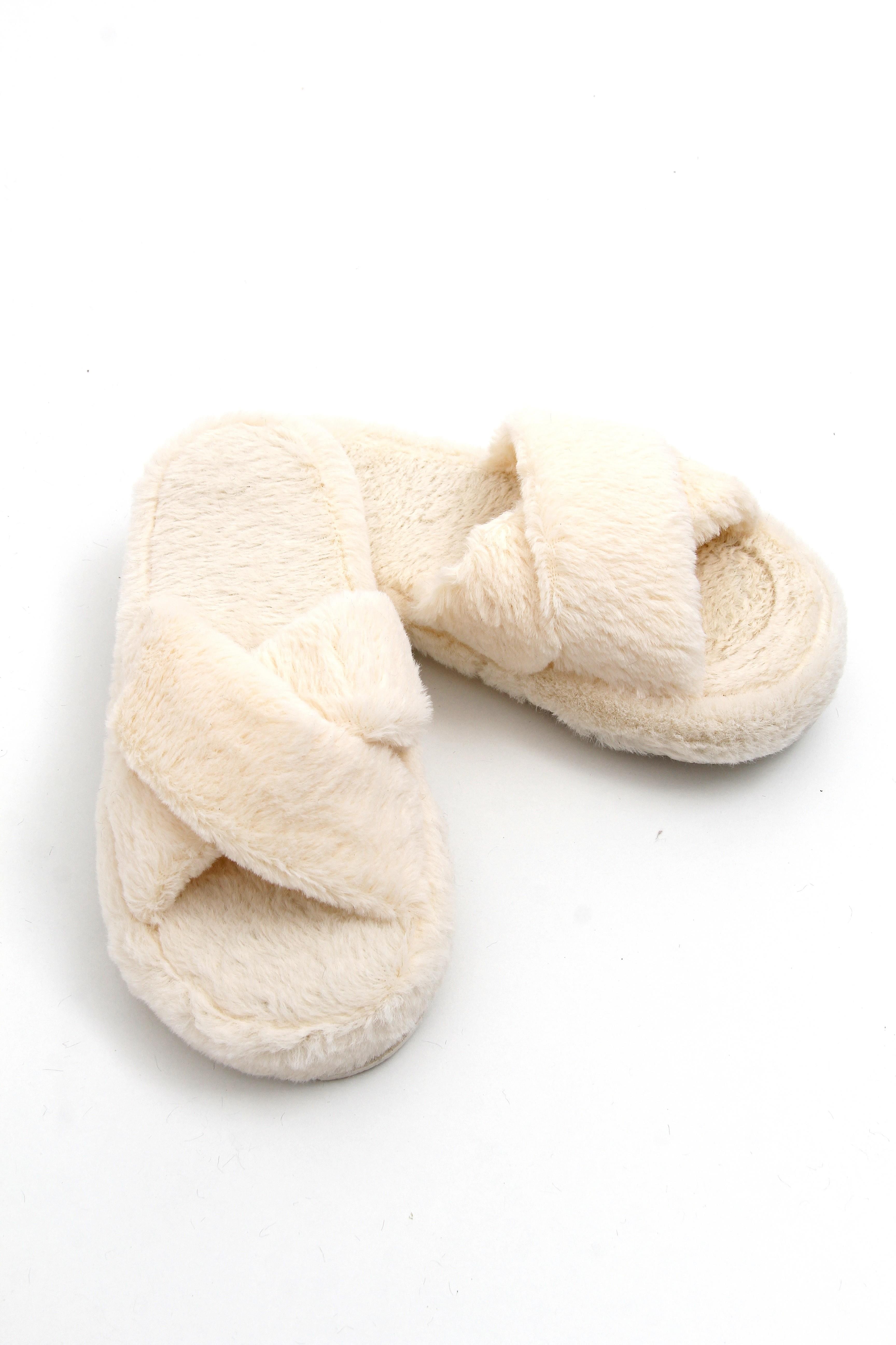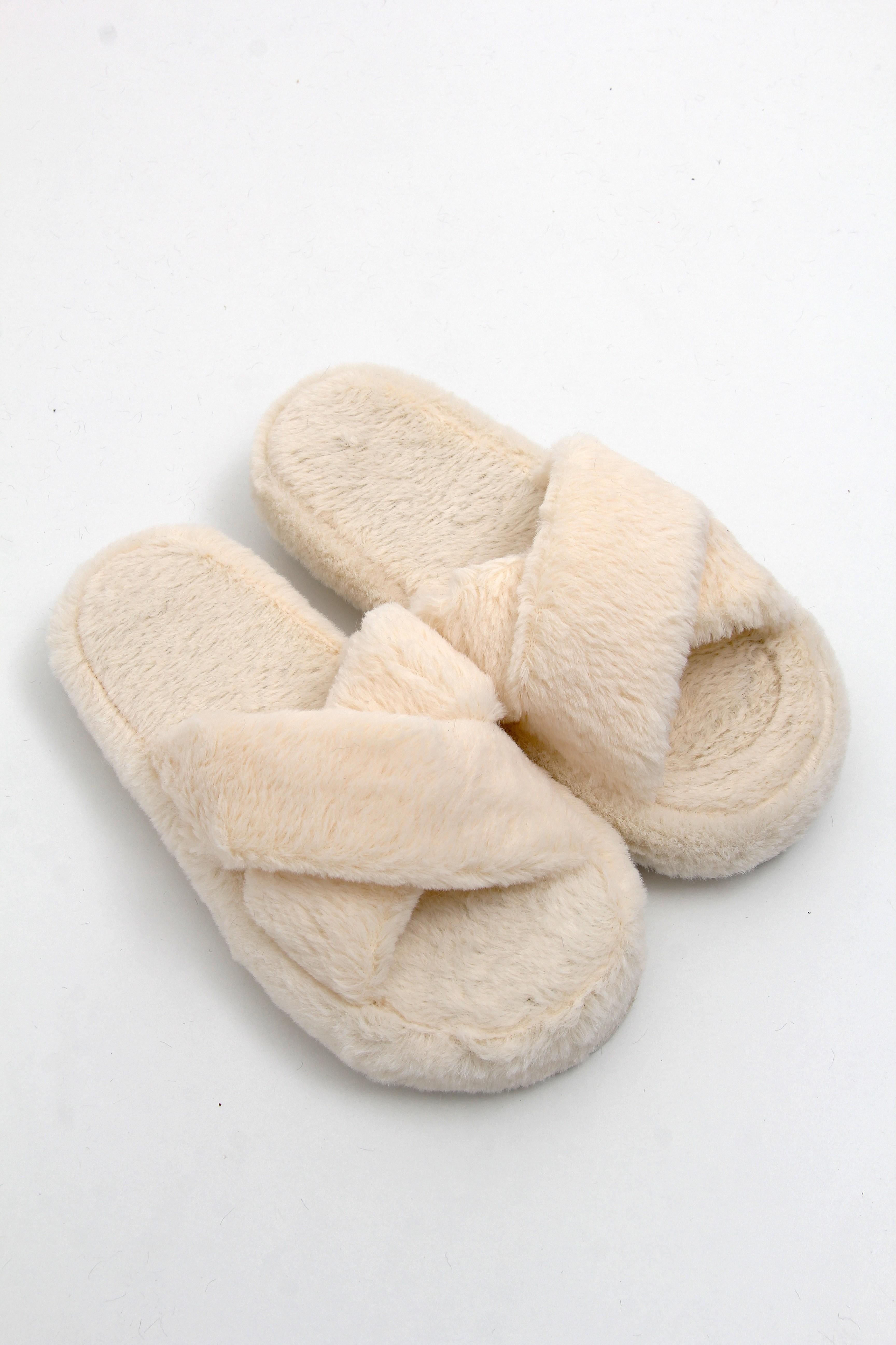 Önü Açık Pofuduk Çapraz Model Ev Terliği Bej (251290TRLXBEJ)