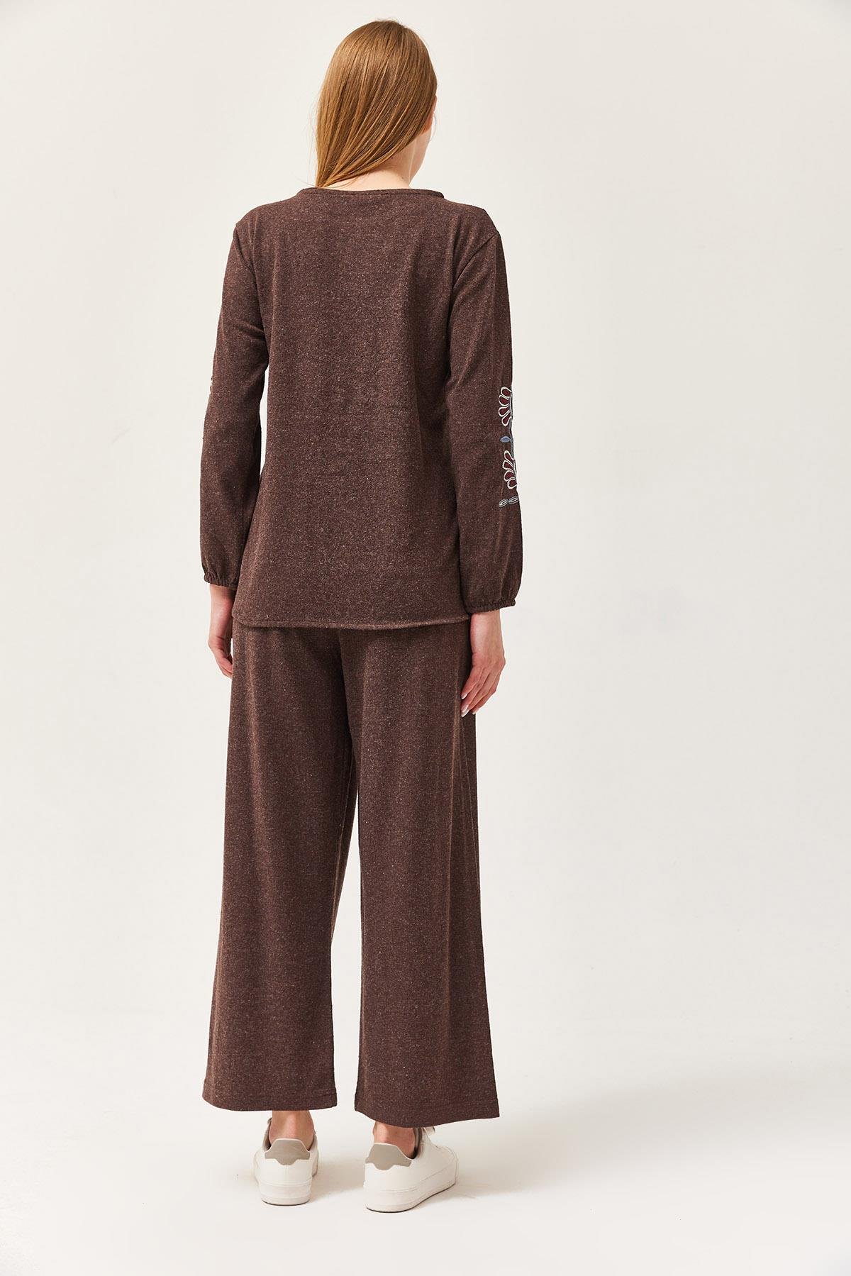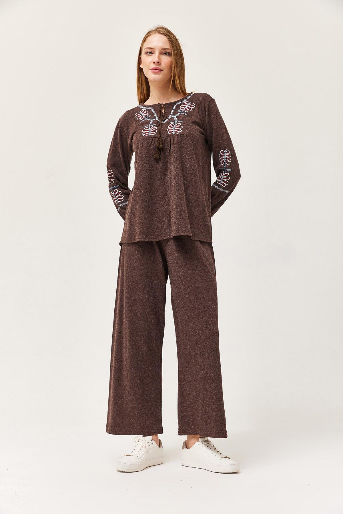 Önü İşlemeli Püsküllü İkili Takım Kahverengi