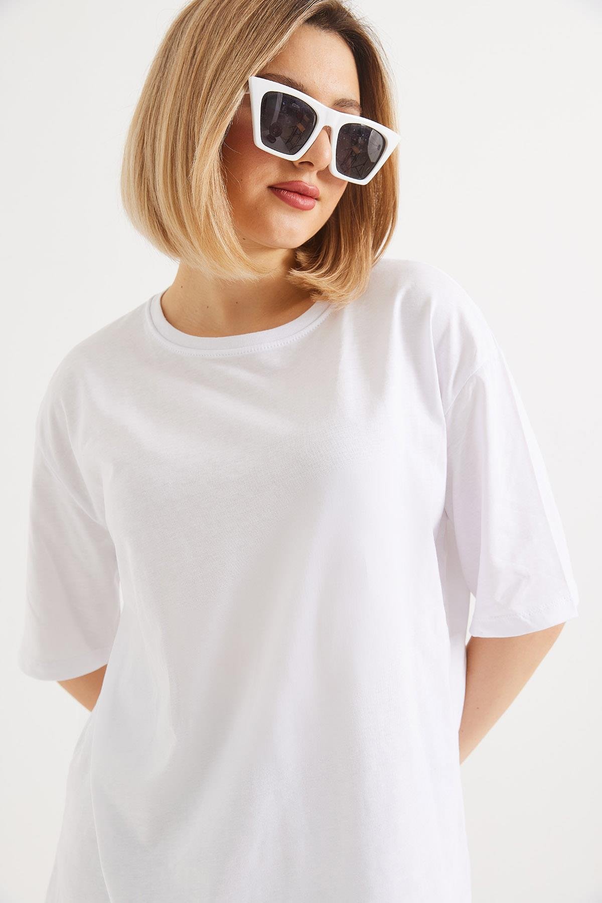 Oversize Bisiklet Yaka Basic Tshirt Beyaz