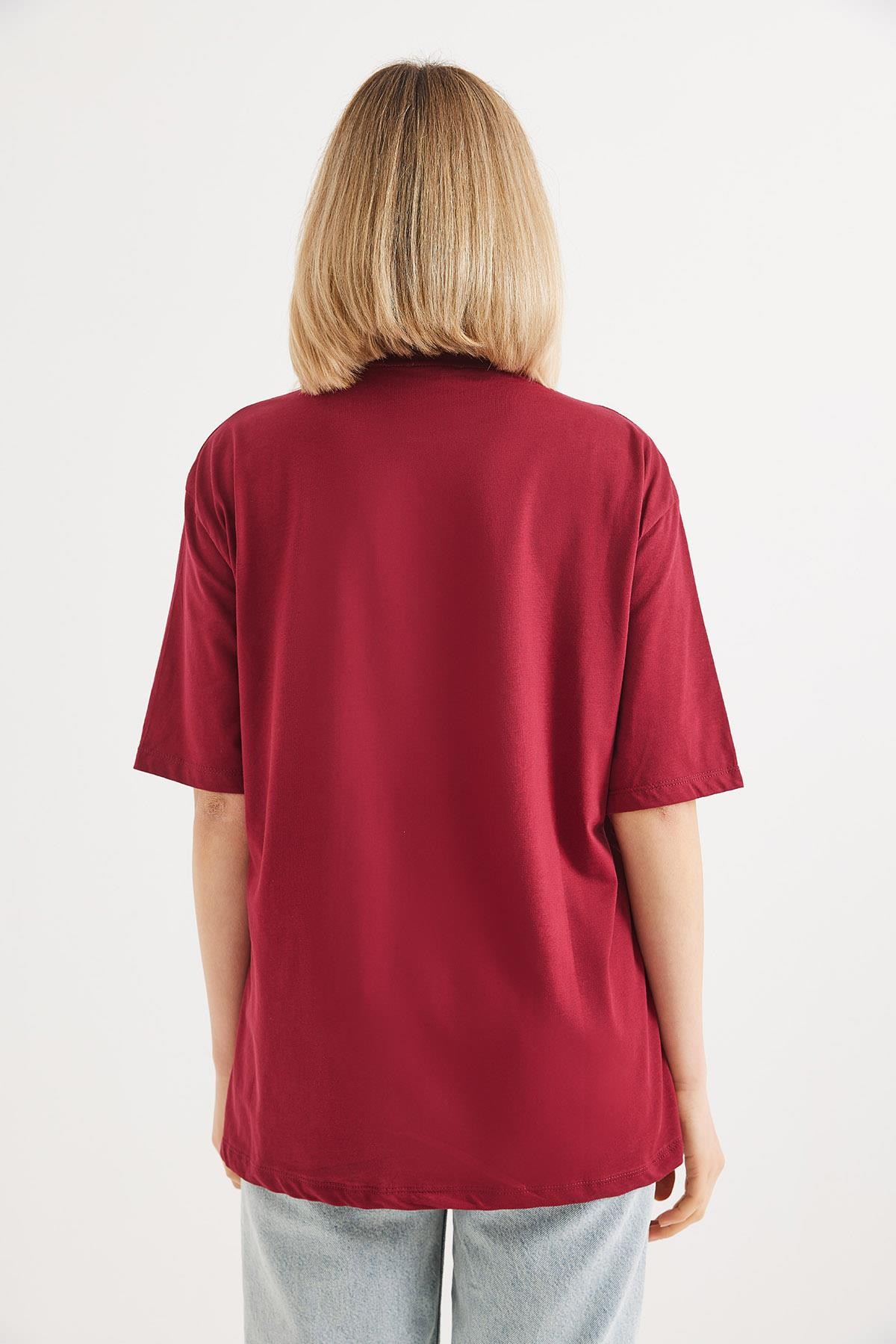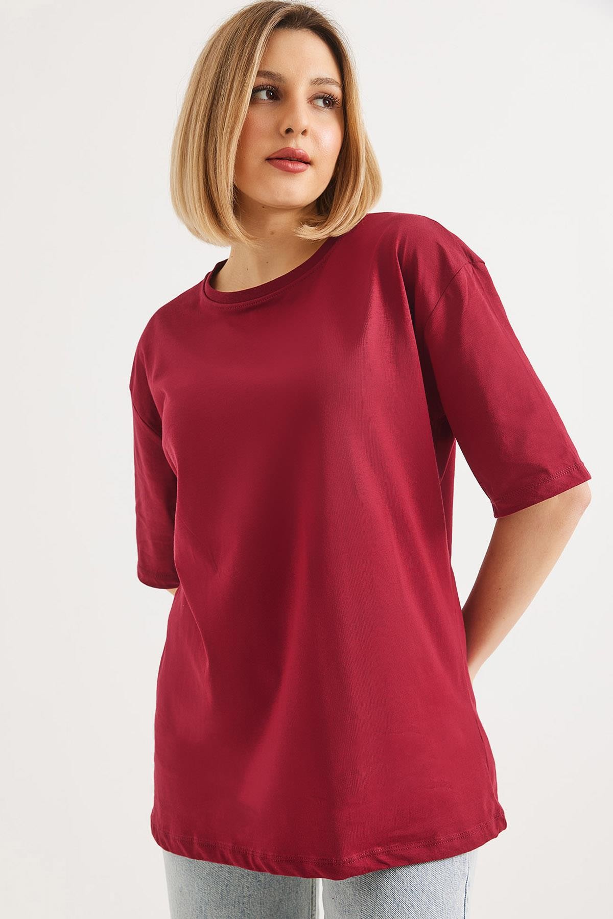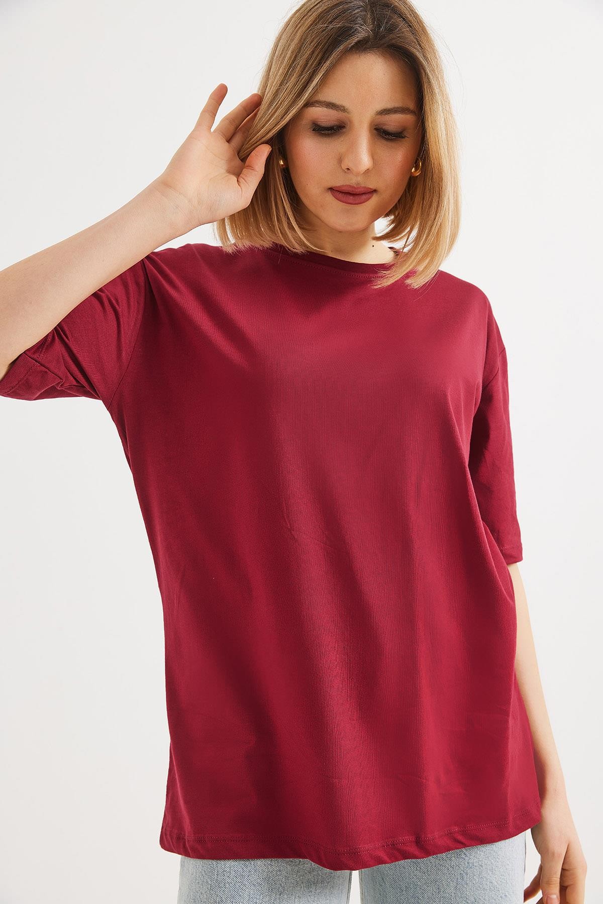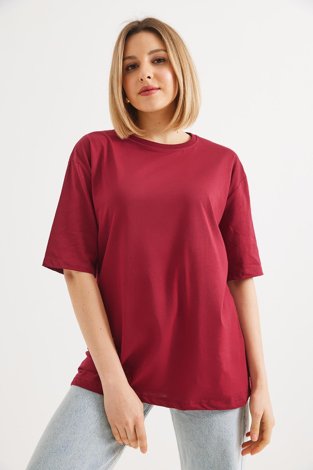 Oversize Bisiklet Yaka Basic Tshirt Bordo (250561TSHXBRD)